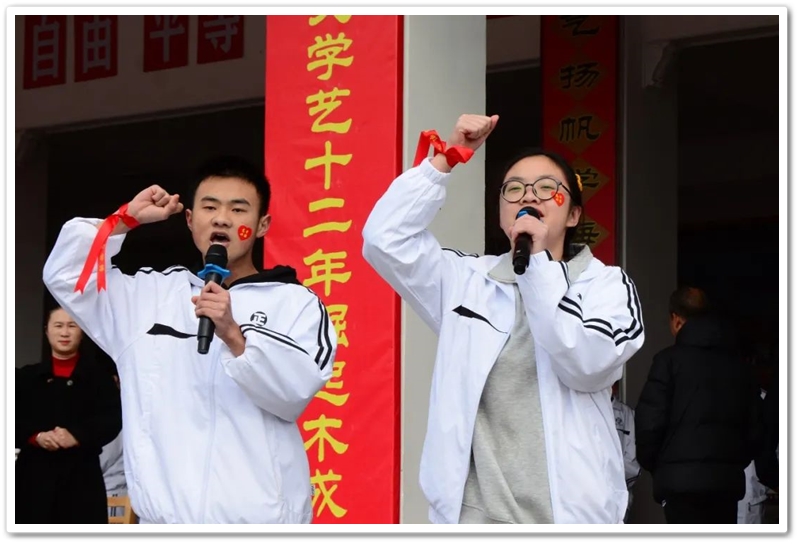 小学五年级贺胜杰、初一年级李梓源、艺术部张欣悦、高二年级李春,4位学生代表联袂登台发表感言。他们感恩老师的关怀呵护与敦敦教导,感念良好的校风学风与“进校即思进取”校训,感怀“艺术焕彩人生”艺考之旅,下定决心要倍加努力勇往直前,茁壮成长追逐梦想。