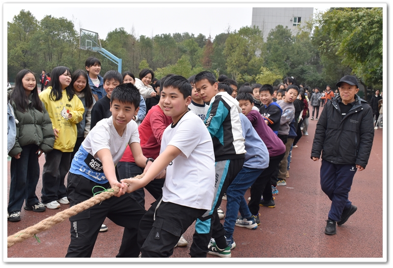 赛场上,对决双方的参赛队员纷纷严阵以待,咬紧牙关,做好准备,等待比赛哨响。随着学部罗主任的哨响,拔河比赛在紧张、激烈的气氛中开始,比赛现场立刻沸腾起来了。参赛队员们就迅速进入状态,全力以赴,力争在对手面前展现出最好的自己。他们紧紧握住长绳,身体拼命往后拉,力争战胜对方。他们互相鼓励、团结配合,一次次将比赛推入高潮。而场外的同学们也自发组成啦啦队,为班级参赛队员呐喊加油,他们激情高涨、呐喊助威,现场欢声笑语不断。