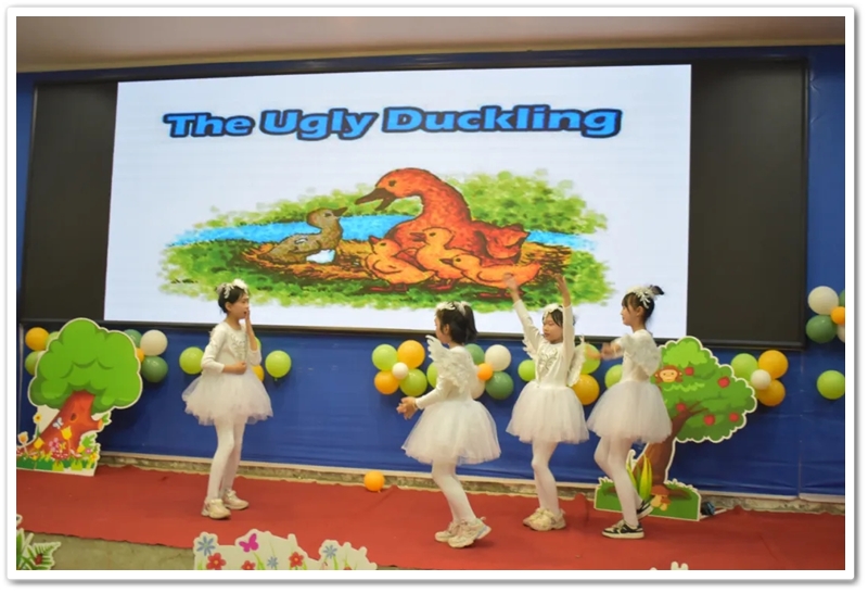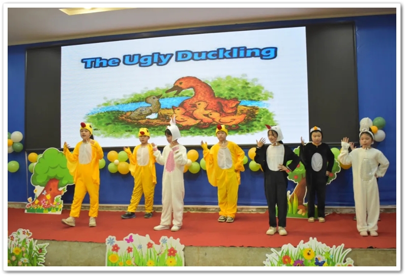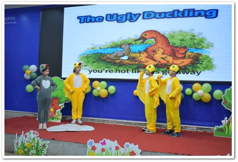 一个误入鸭群的”丑”小鸭在同伴们不认可和嘲笑中最终长大蜕变成天鹅。399班的孩子们团结合作,在优美的歌曲中,逼真地演绎了《The ugly duckling》。