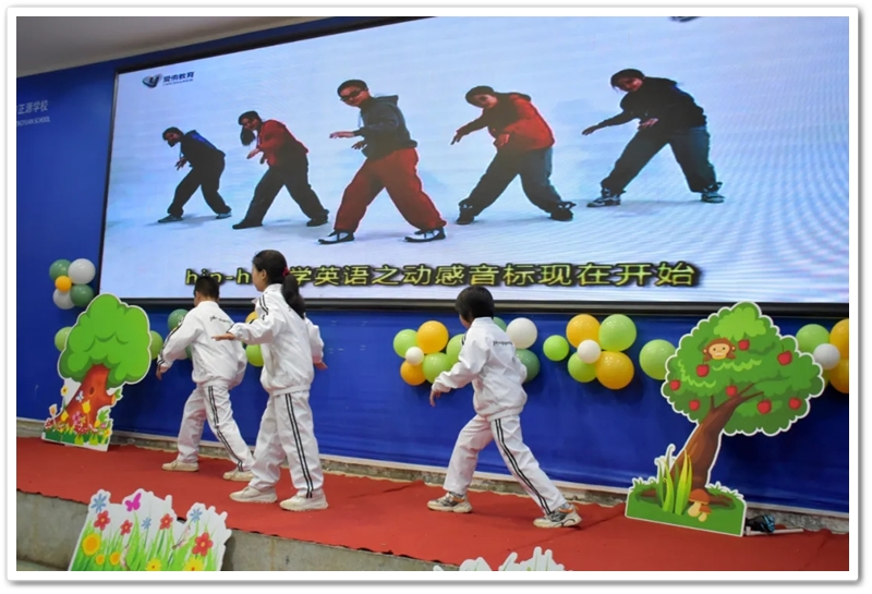 紧接着401班谢红霞,蒋权威,马珊珊同学给大家带来了《动感音标》。一个个音标代入到节奏分明的机器人舞和RAP当中,让观众们兴趣盎然。在这三个孩子的带领下,全体同学一起起立,齐刷刷地做起了《音标手势操》。