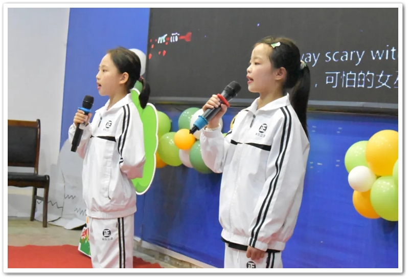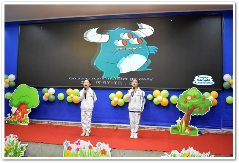 为了让全体观众沉浸式的观看节目,400班李萱,李姿敏给大家带来了歌曲《go away》。两位孩子在台上大声的“唱”,观众们在下面小声的“和”。现场气氛热闹非凡。