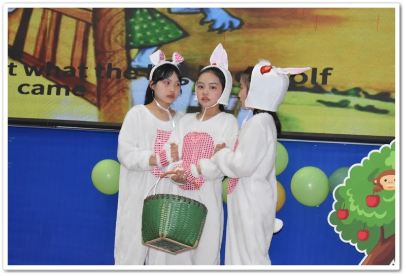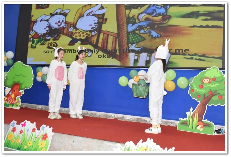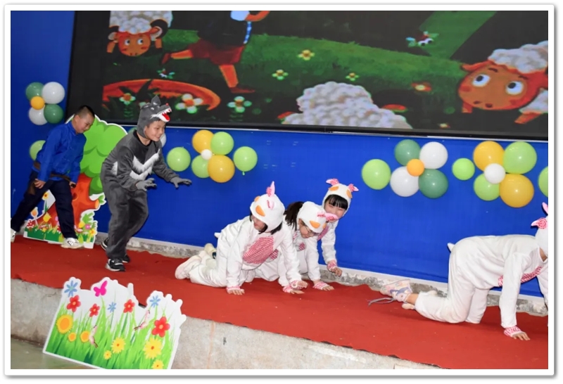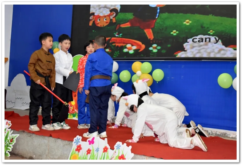 森林里有许多小动物们都赶来参加音乐会,骄傲的孔雀嫌弃其他小动物们长得太丑了,不愿与之为伍。结果在森林里遇到了大灰狼……小动物们不计前嫌,解救出了小孔雀,并和他成为了好朋友。398班的小演员们演得入情入境。迎来了观众们阵阵掌声。