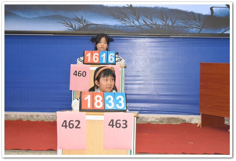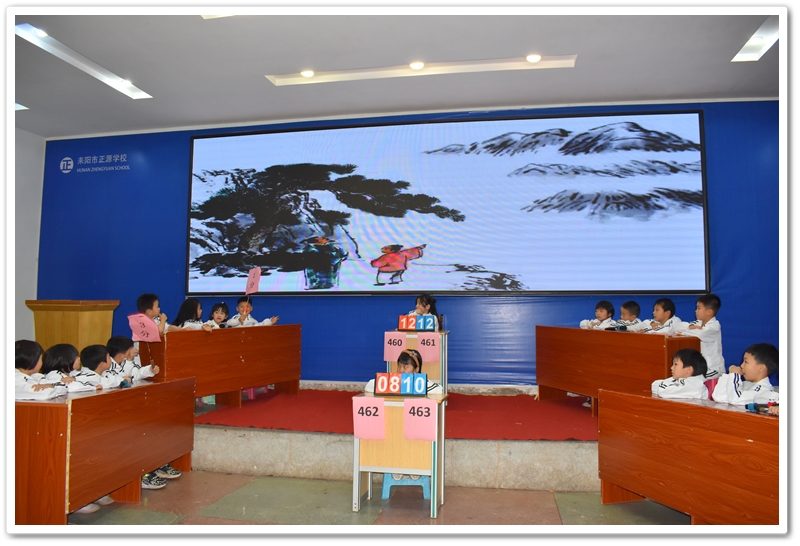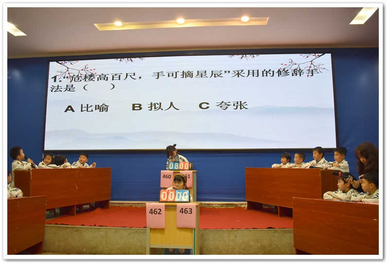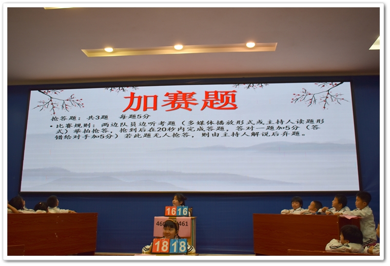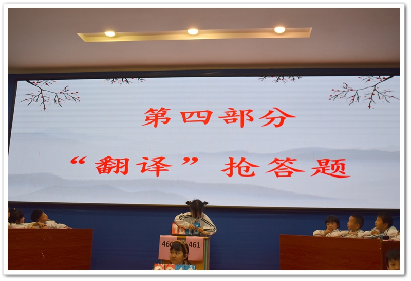 选手们根据主持人出示的诗句进行翻译,做到准确通顺。答对一题加5分。原本分数落后的462、463班,凭借超快手速,抢到了不少答题机会,成功逆袭。以相同的分数进入最后的加赛环节。
