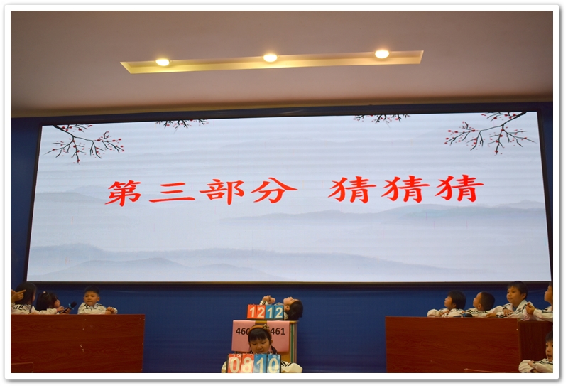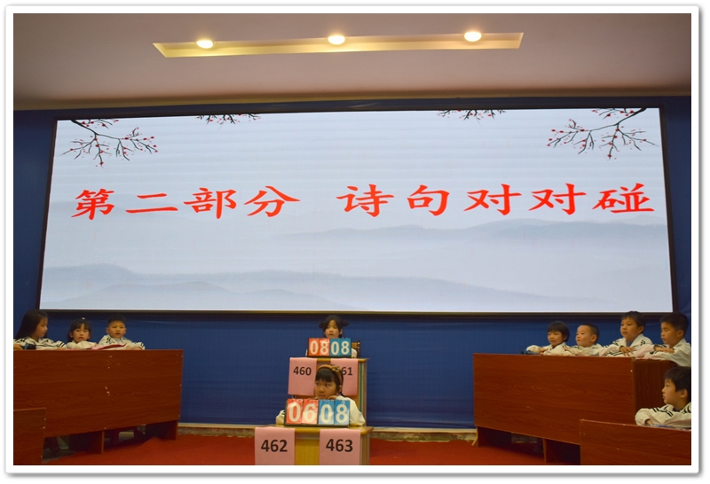 主要以九宫格和填空题为主,比如出示诗句的上半句或下半句,选手补充所缺部分。在诗句对对碰的环节中,有的小选手在听到题目后,眼睛一亮,脸上露出兴奋的神色,迅速地回答出了正确的诗词。有的小选手双手紧握话筒,微微颤抖,显然对题目有些紧张,但还是坚定地说出了答案。还有的小选手思考时,不停地眨着眼睛,似乎在脑海中搜索着记忆中的诗词。每当他们回答正确,为班级加分时,台下都发出热烈的欢呼声。