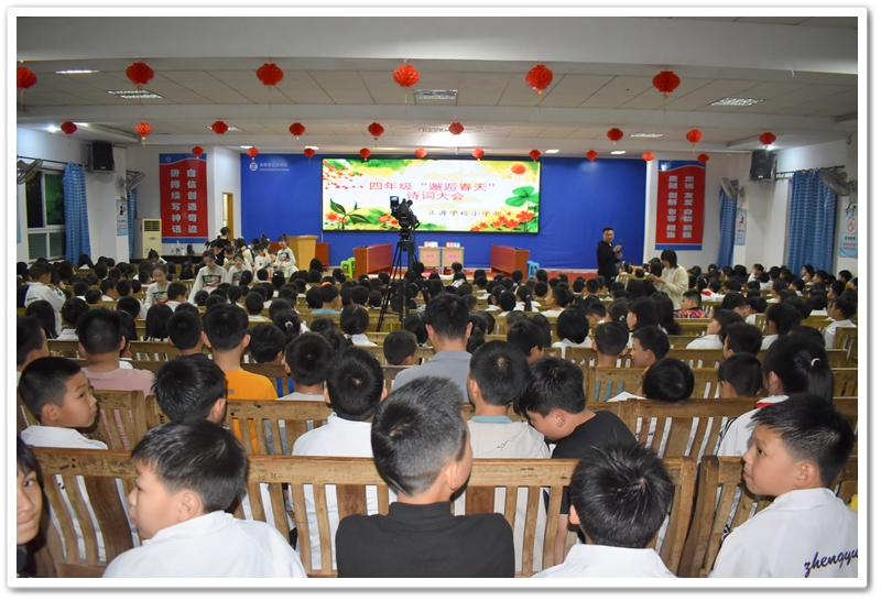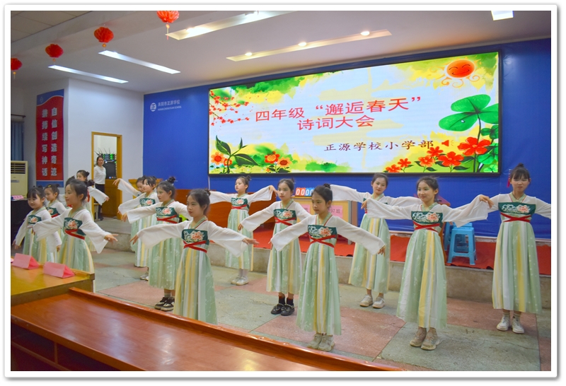 在春风拂面、花香四溢的季节里,正源学校小学部四年级迎来了一场别开生面的诗词大赛。4月10日晚,学校报告厅内座无虚席,一场以“邂逅春天”为主题的诗词大赛正在如火如荼地进行。八个班级的代表队齐聚一堂,用诗词展现自己的风采,也为这个春天增添一抹浓厚的文化气息。