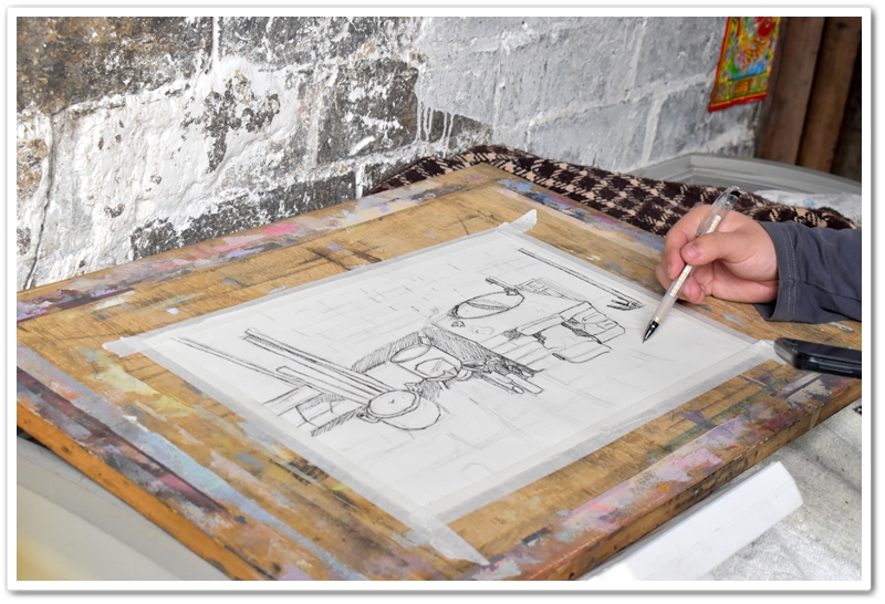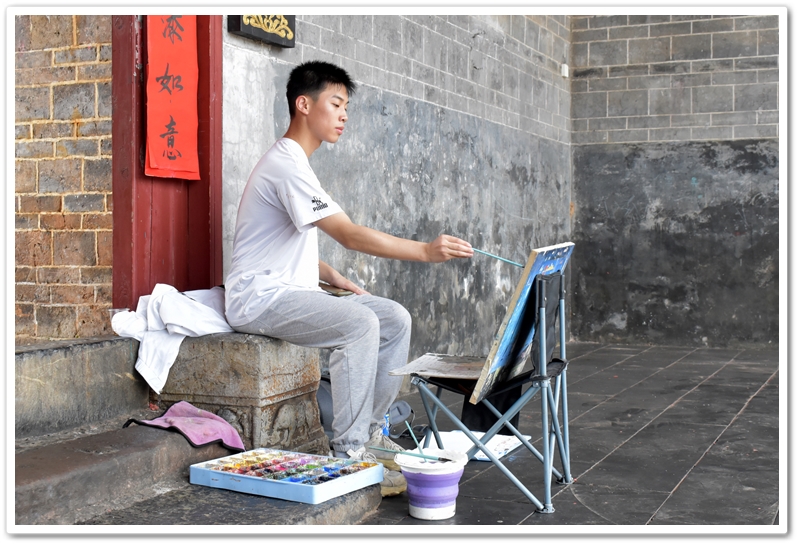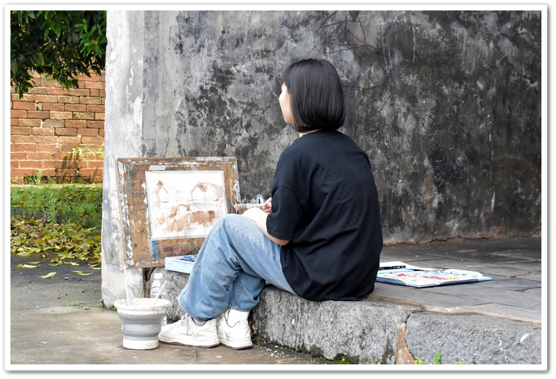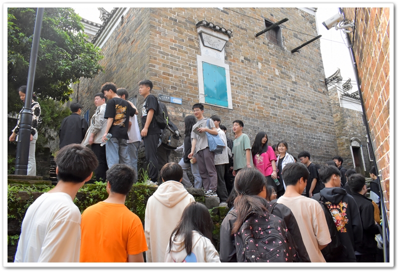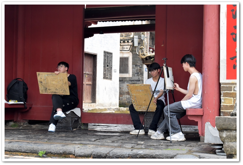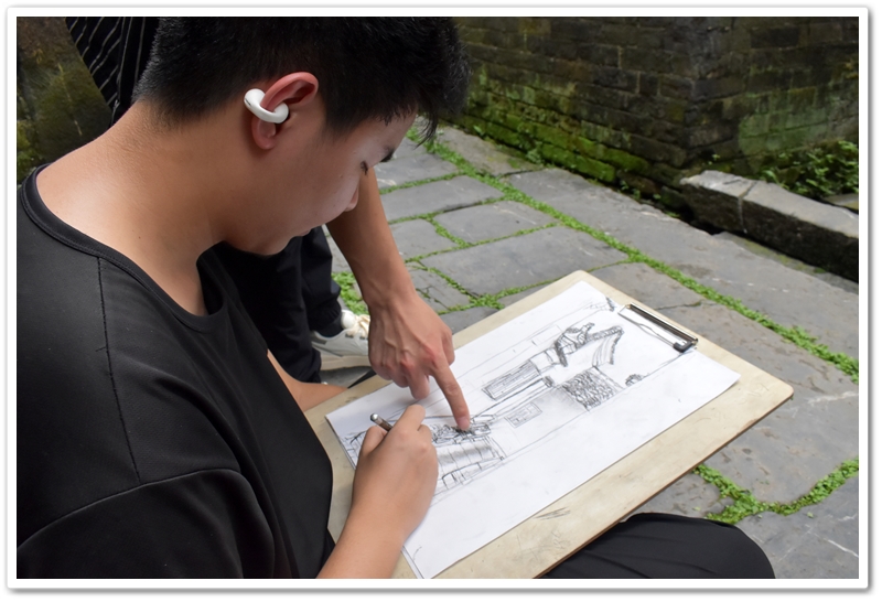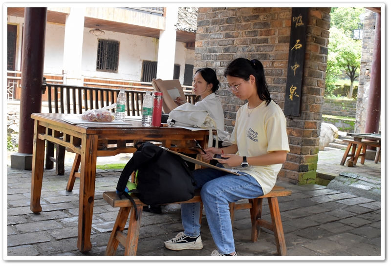 石桥、石街、石碑一路走过,神石、神树、神水娓娓道完,在摊点上打上一碗手搓凉粉,从校车上搬下几框“正源盒饭”,简便而又酣畅的中餐过后,同学们各自组队,在老师的带领下散布到古村各处取景。或居高临下鸟瞰飞檐翘角,或穿街走巷近观青砖黛瓦,或登堂入室临摹画栋雕梁……同学们三五成群各显神通,或蹲石阶、或倚砖墙、或席地而坐,在老师的指导下寻觅意境、截取空间、构建结构、勾勒线条、分辨光影、修整细节、泼洒水粉、渲染色彩……笔尖在纸面沙沙作响,时光在墙头静静流淌。