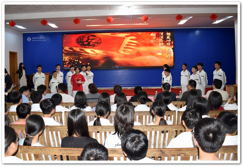 节目开场,会场里响起了振奋人心的音乐,数名学生登台,激情朗诵演绎了岳飞精忠报国的赤胆忠心。伴随着一声声“臣子恨,何时灭”的怒问,台下观众们不自觉地拍打双手,一时间会场里响起了激动人心的掌声。