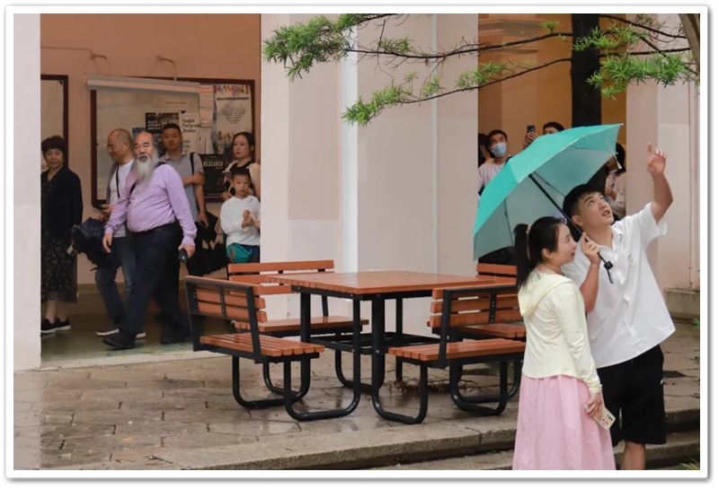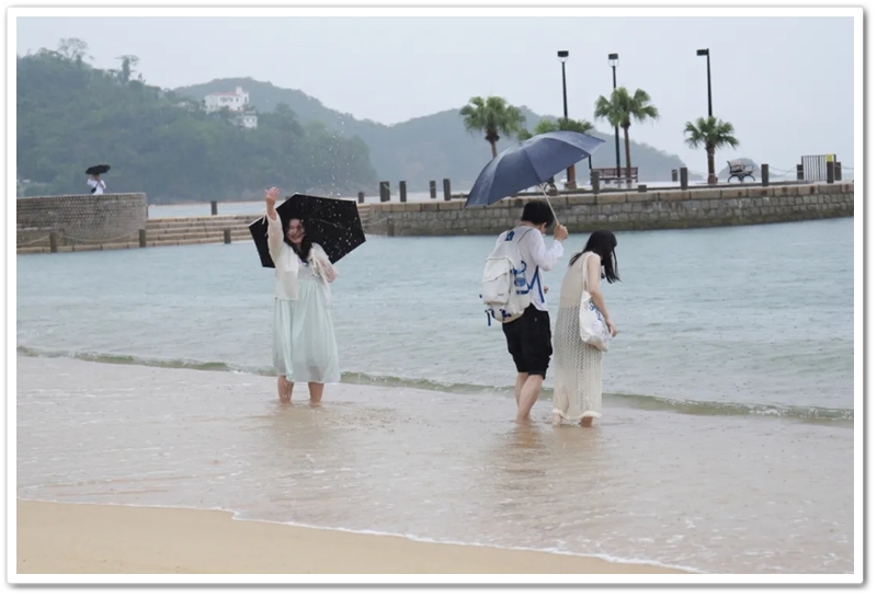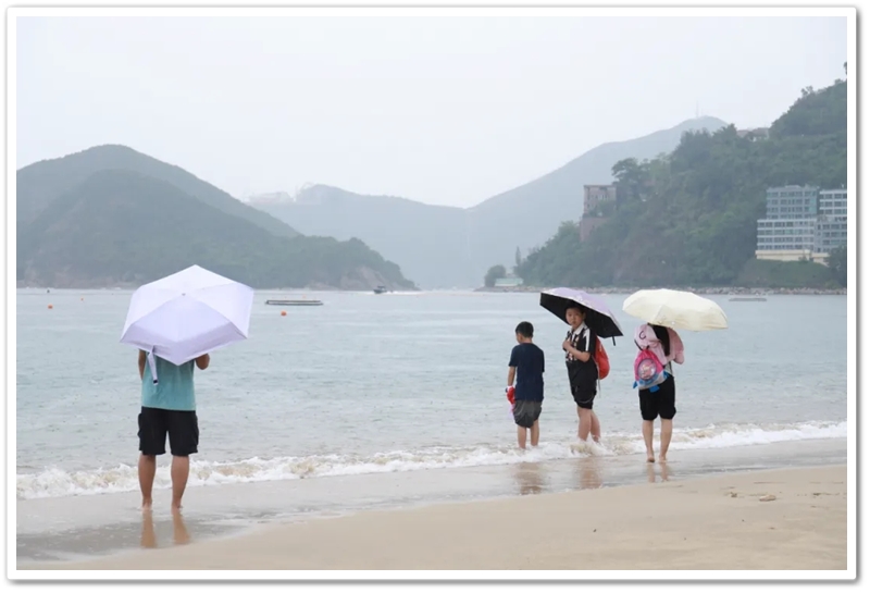本想漫步沙滩一览盛景,或是濯足听涛嬉水冲浪,奈何天公不作美,豆大雨点一阵接一阵,难有停歇。只好退而求其次,驻足浅水湾东南端镇海楼旁,一边避雨,一边翘首眺望。雨势稍稍减缓之时,一些老师,尤其是女老师和孩子们终归抵挡不住碧海银沙的诱惑,撑伞走上滩头。脚踩细沙,手鞠浅浪,雨点淅沥,涛声阵阵,却也别有一番风情。