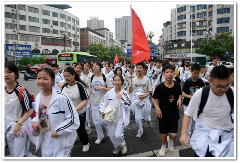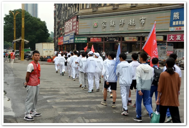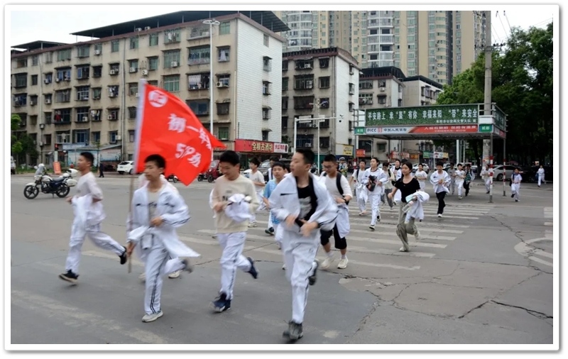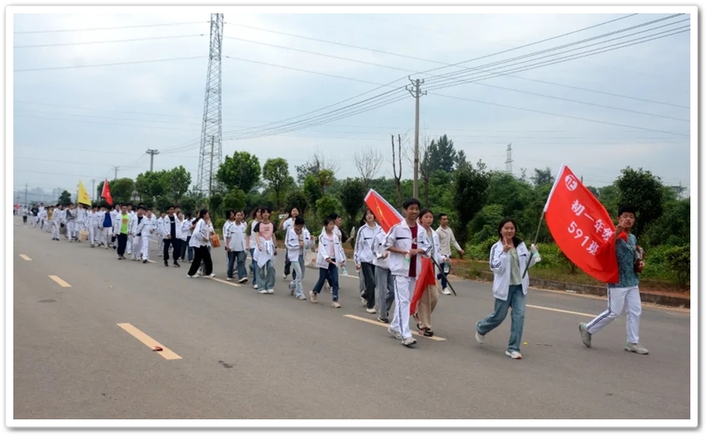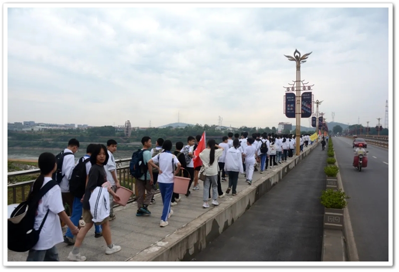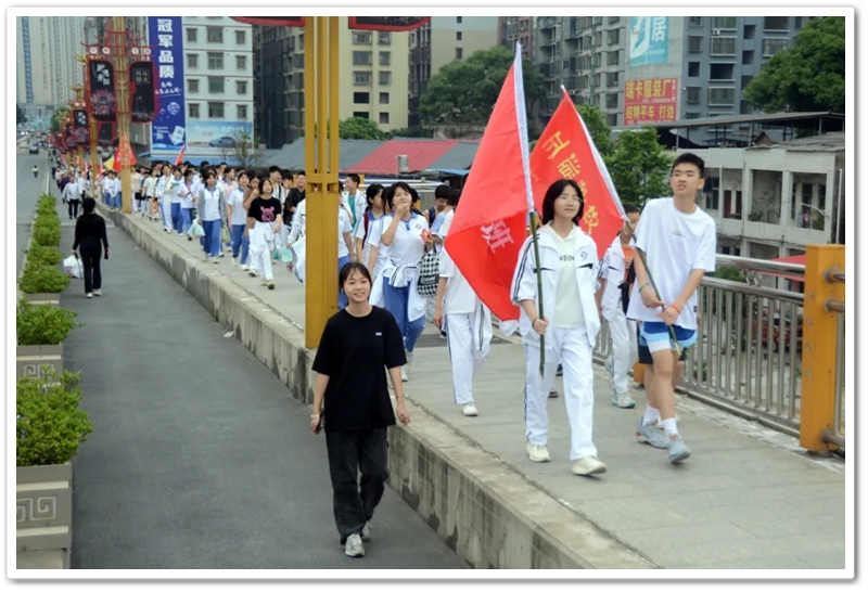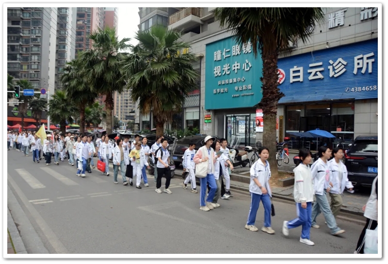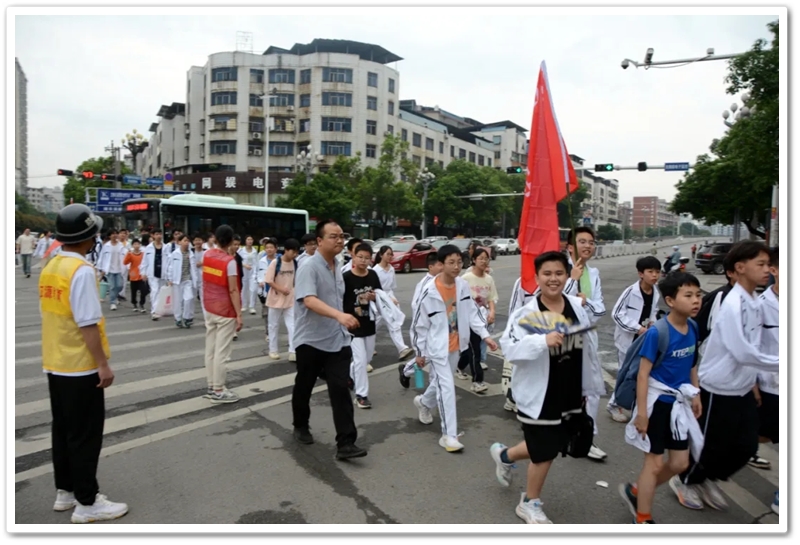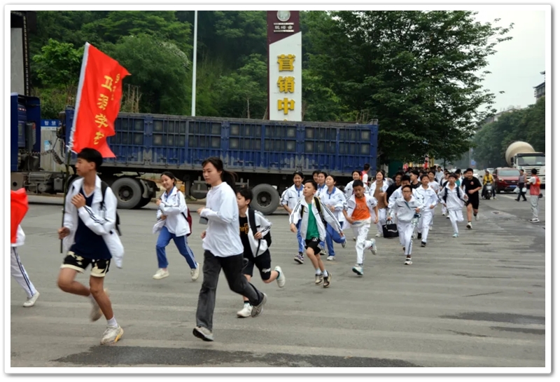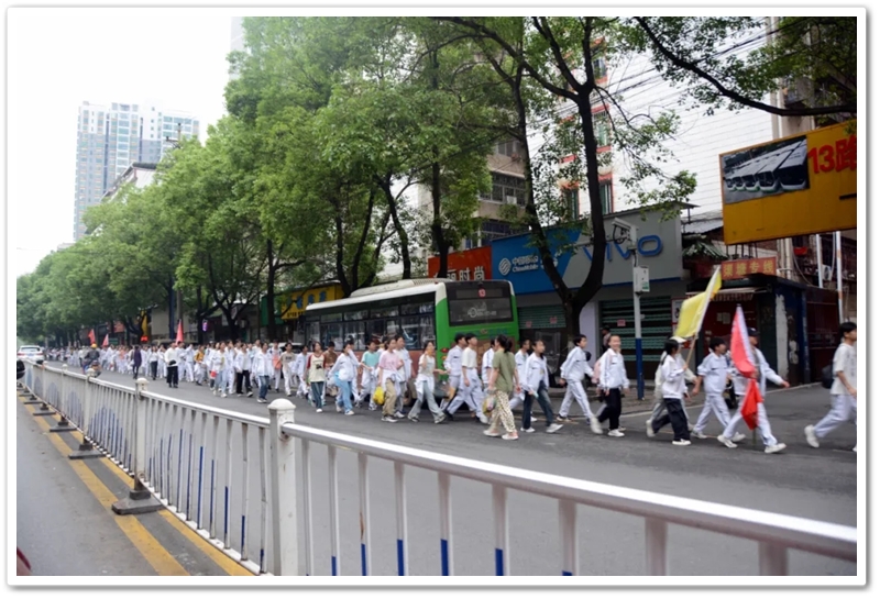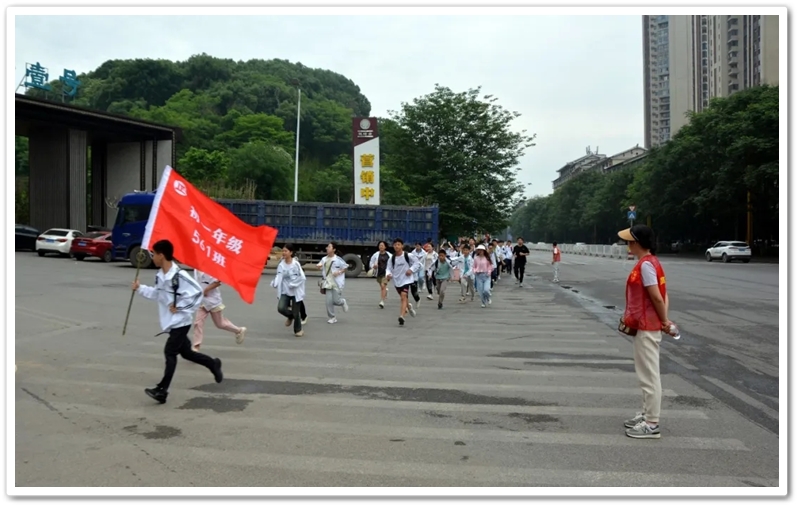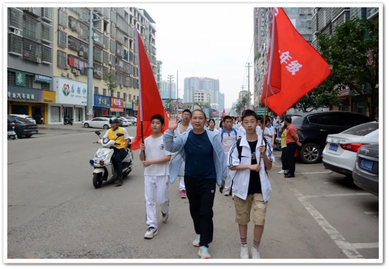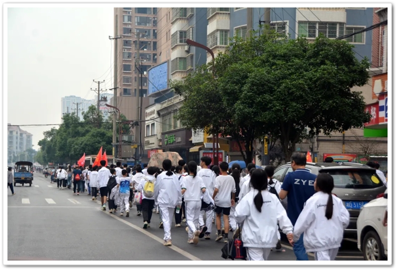 红旗招展,白衣飘飘,千余名初一学子列成路队紧随着校长一路南下。白色长龙穿过广场,绕过太极池,迈出南校门,雄赳赳气昂昂昂首阔步跨进迎宾大道。交警护送,校长开路,气宇昂扬转入笔直的德泰隆大道,一路南行,前进,前进,加油前进!走过神龙广场,穿过城北路,挺进群英路。经过神风鞋城,穿过五一路,又挺进到长长长长的群英南路。经过蔡伦纪念园,先头队伍走进和谐南苑时,时间才刚到9点40。