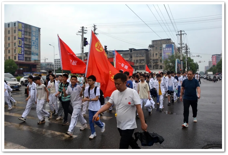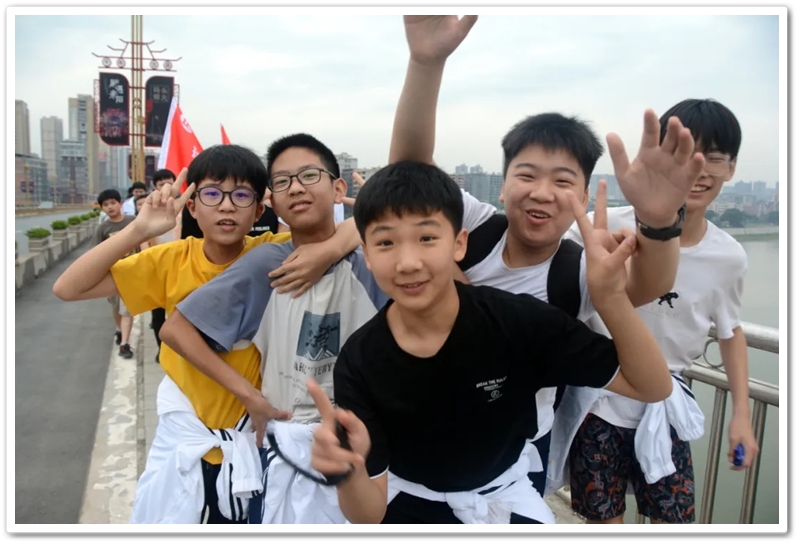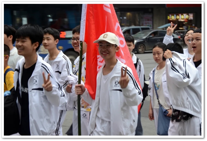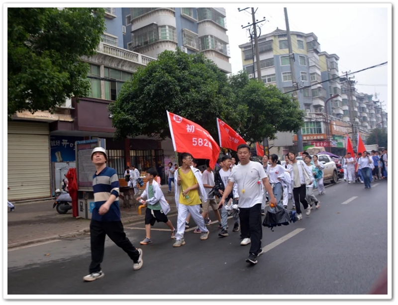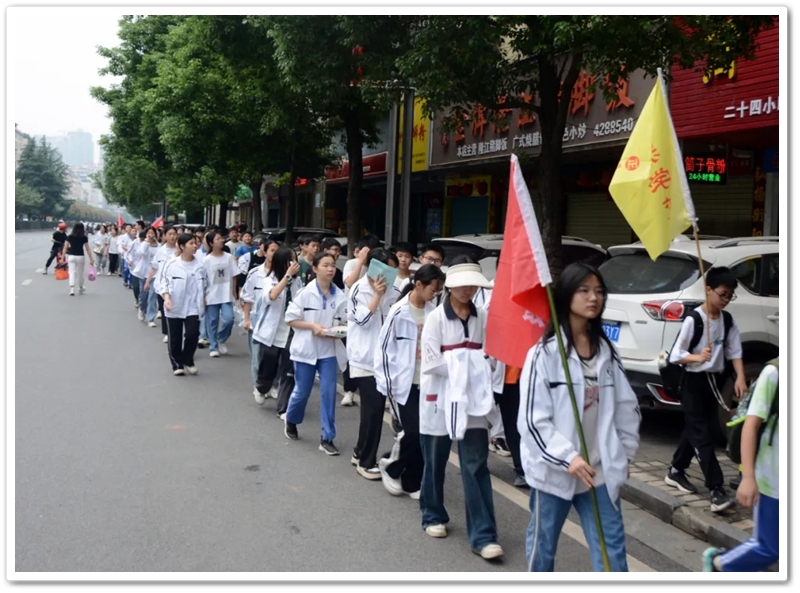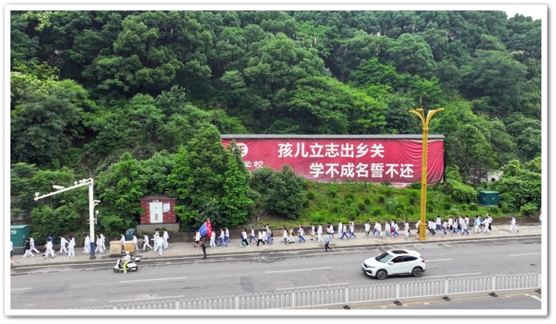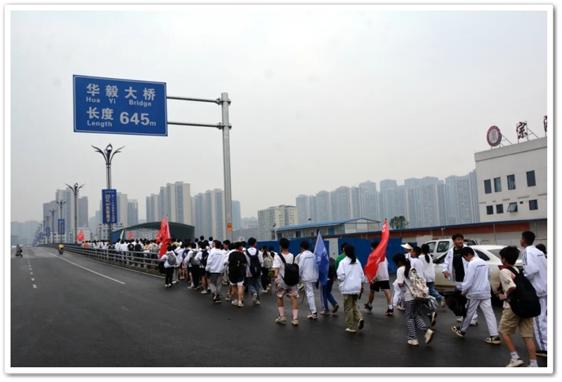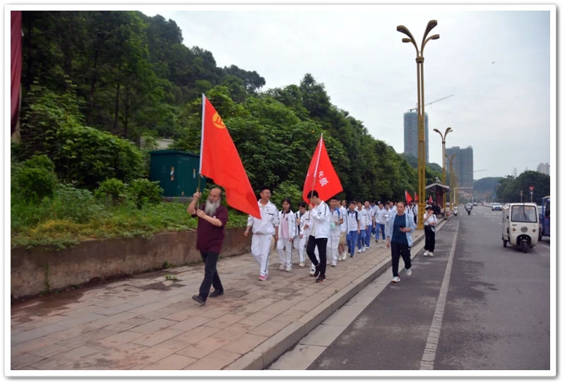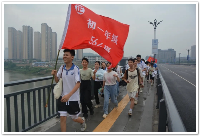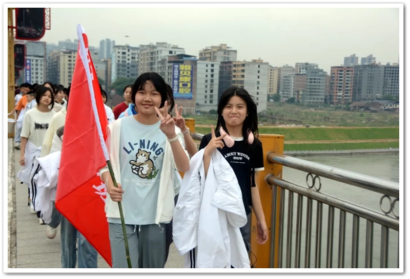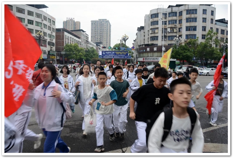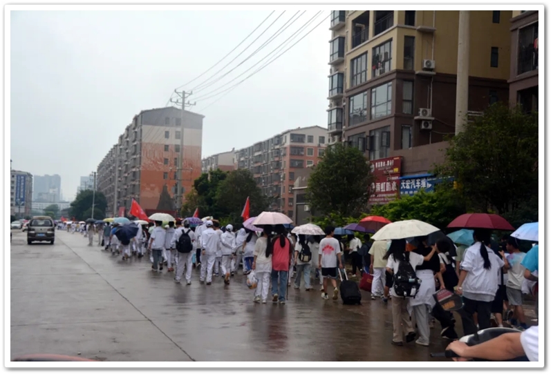红旗招展,白衣飘飘,千余名初一学子列成路队紧随着校长一路南下。白色长龙穿过广场,绕过太极池,迈出南校门,雄赳赳气昂昂昂首阔步跨进迎宾大道。交警护送,校长开路,气宇昂扬转入笔直的德泰隆大道,一路南行,前进,前进,加油前进!走过神龙广场,穿过城北路,挺进群英路。经过神风鞋城,穿过五一路,又挺进到长长长长的群英南路。经过蔡伦纪念园,先头队伍走进和谐南苑时,时间才刚到9点40。