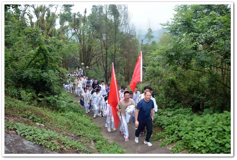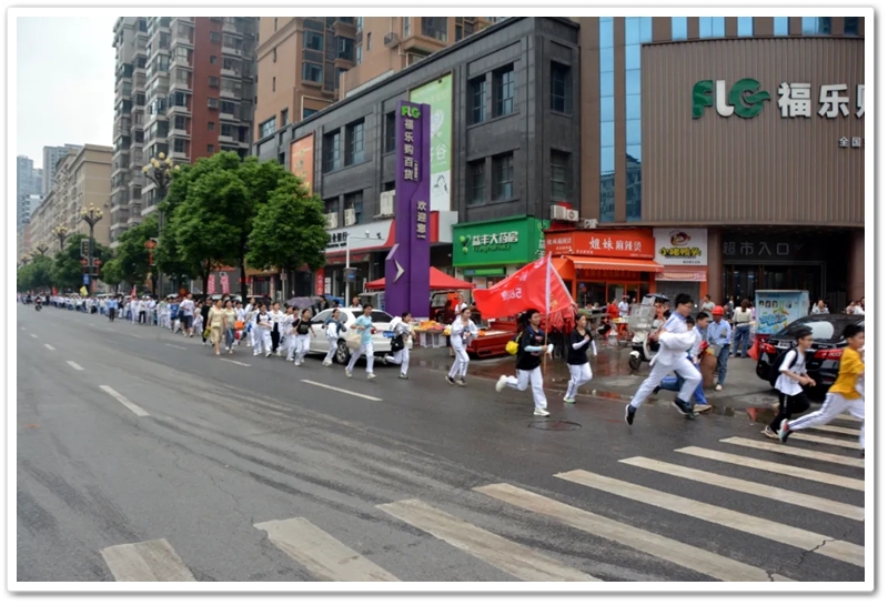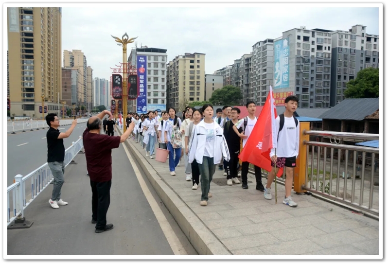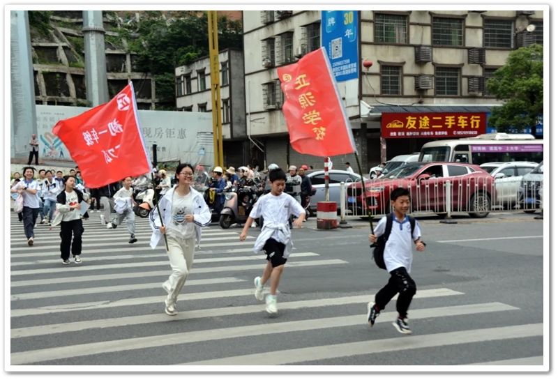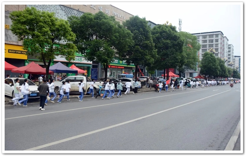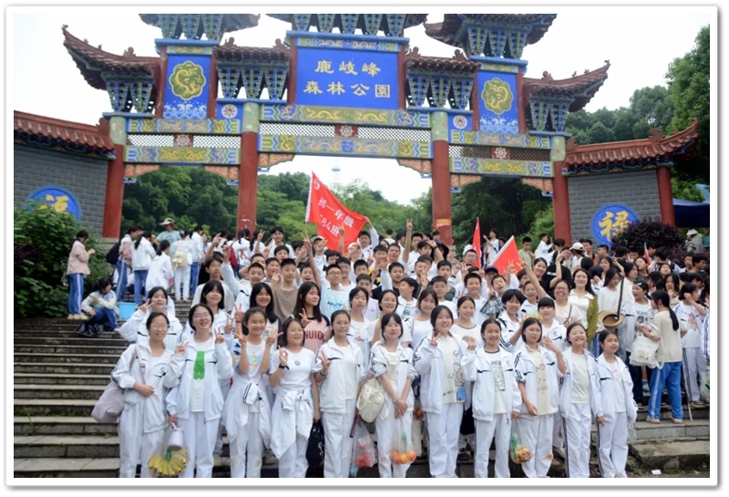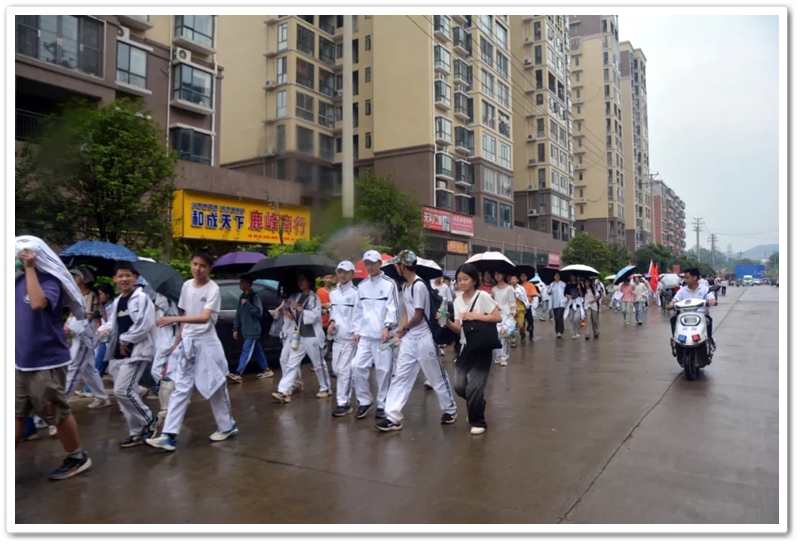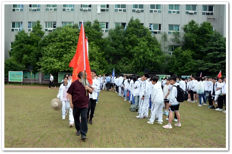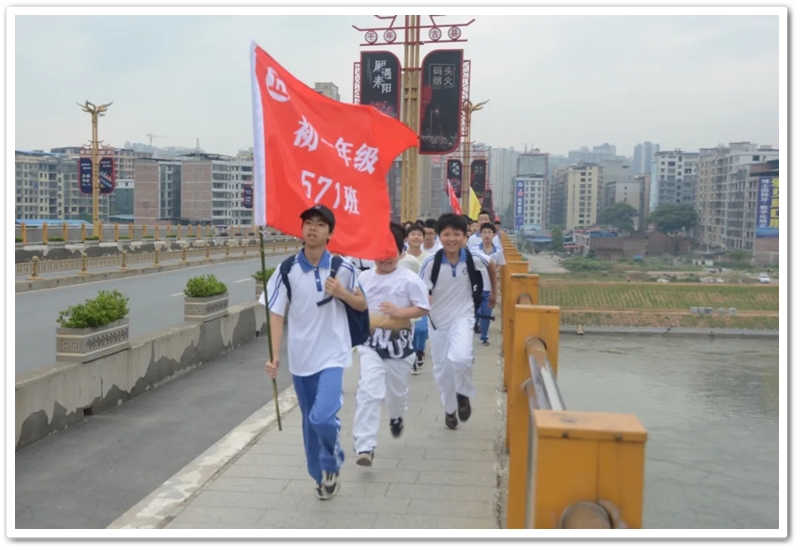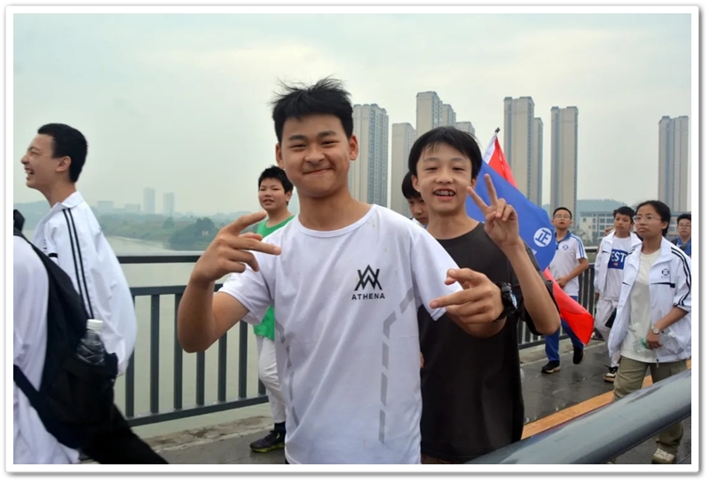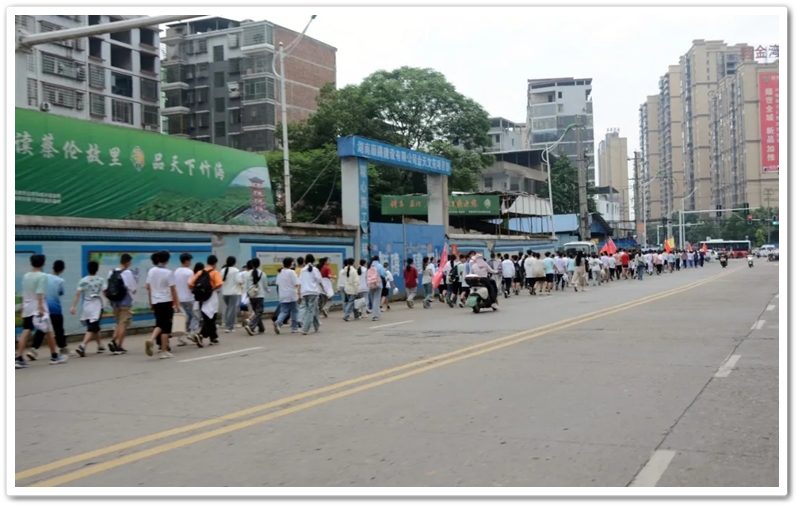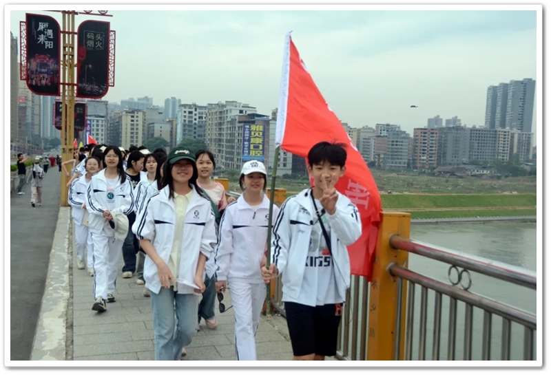 红旗招展,白衣飘飘,千余名初一学子列成路队紧随着校长一路南下。白色长龙穿过广场,绕过太极池,迈出南校门,雄赳赳气昂昂昂首阔步跨进迎宾大道。交警护送,校长开路,气宇昂扬转入笔直的德泰隆大道,一路南行,前进,前进,加油前进!走过神龙广场,穿过城北路,挺进群英路。经过神风鞋城,穿过五一路,又挺进到长长长长的群英南路。经过蔡伦纪念园,先头队伍走进和谐南苑时,时间才刚到9点40。