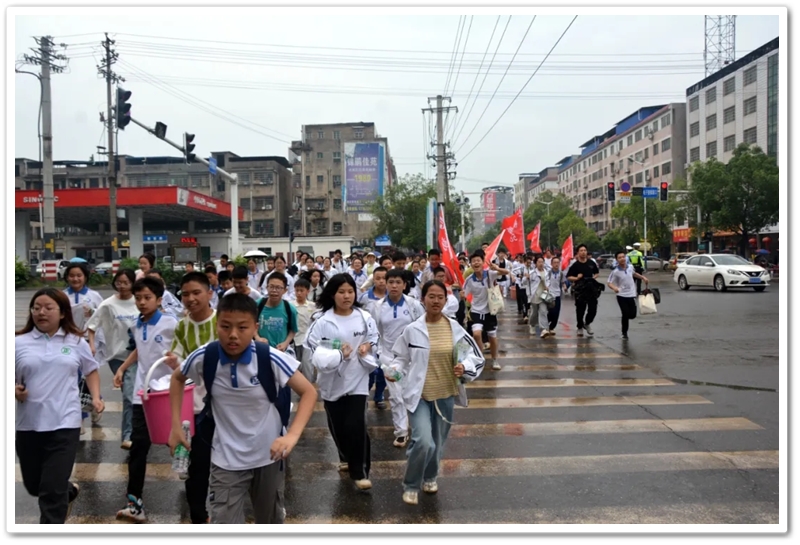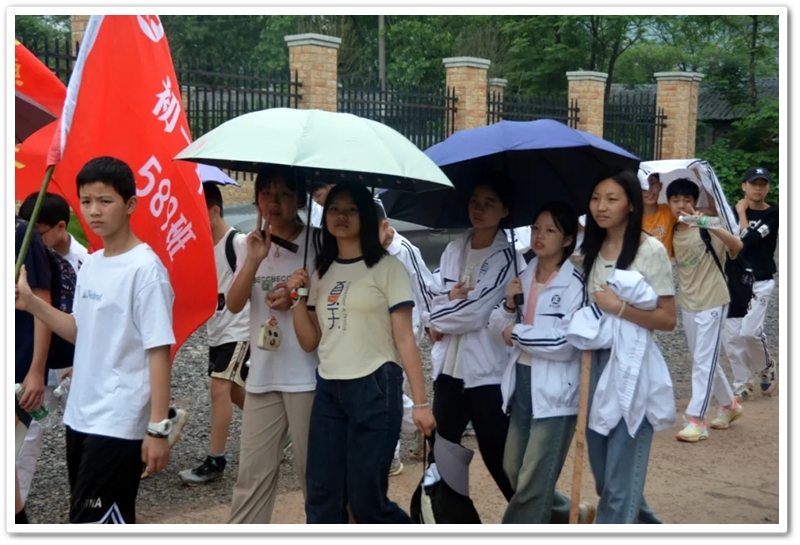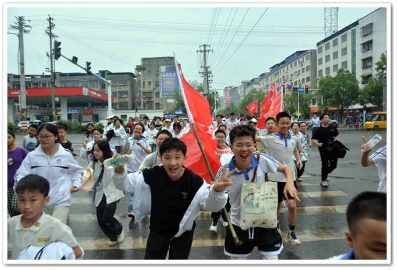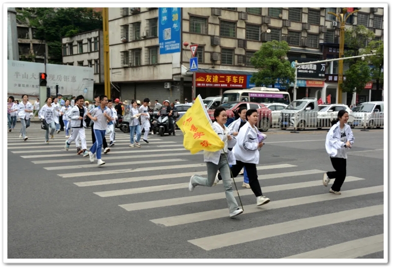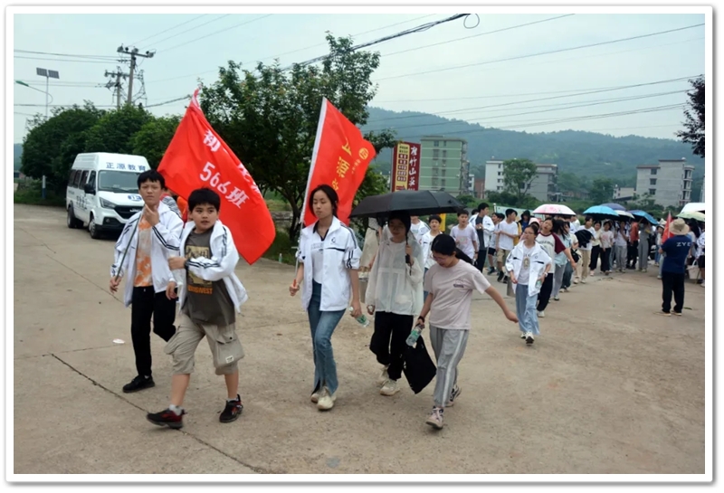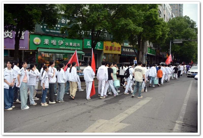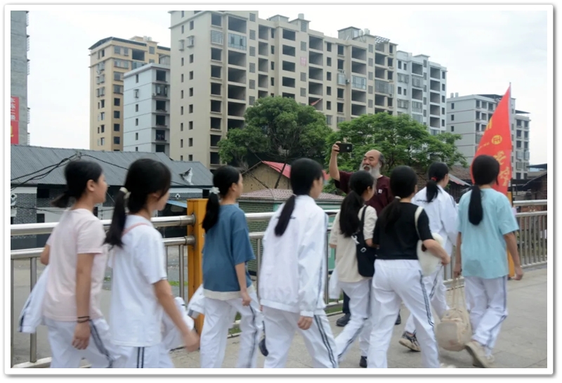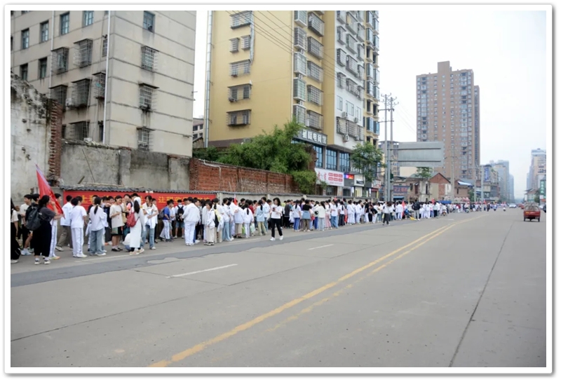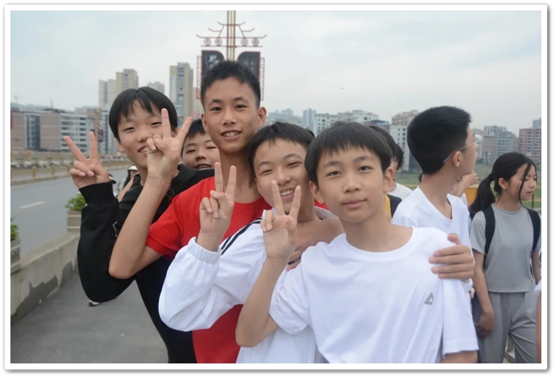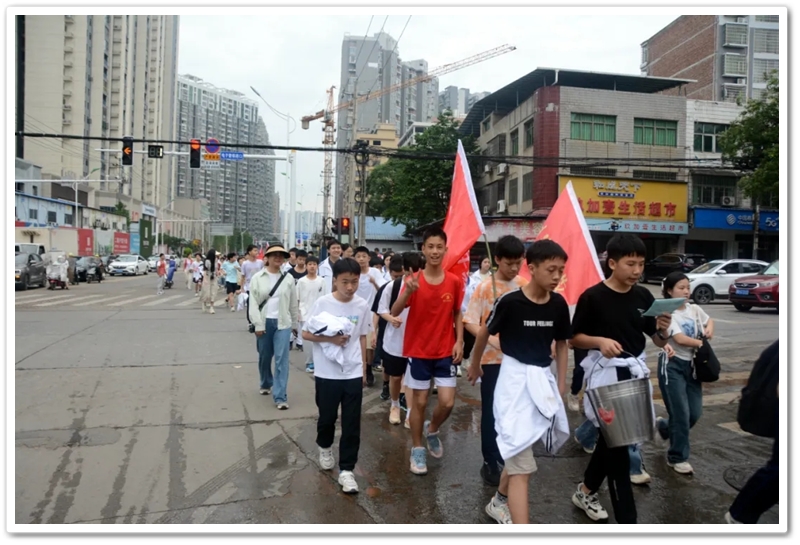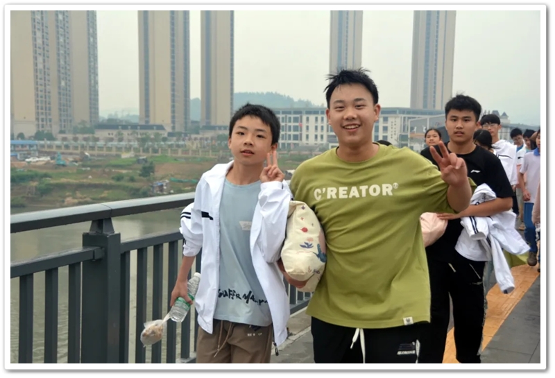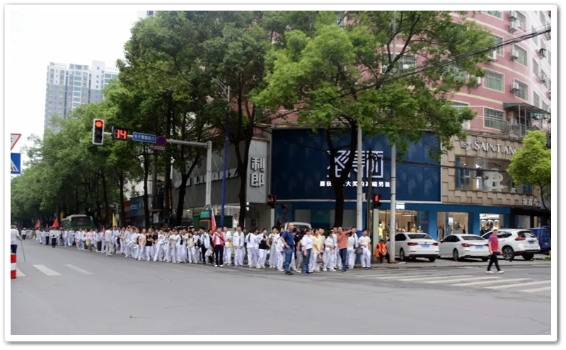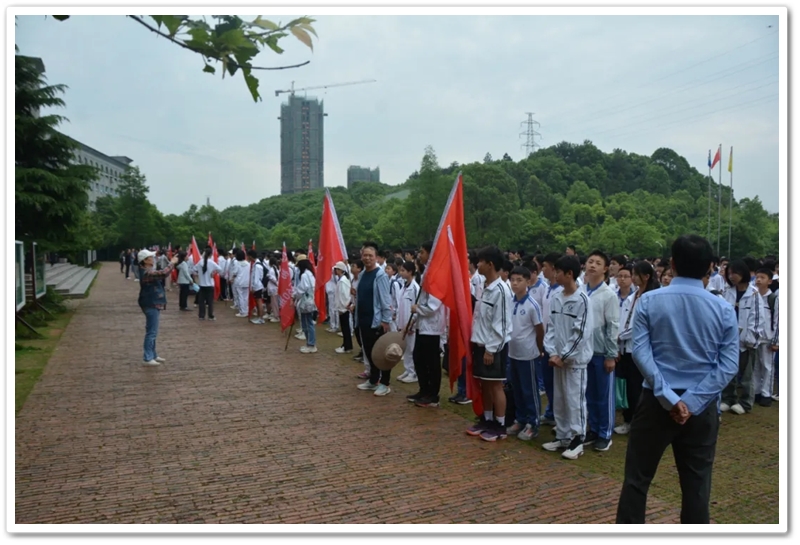 红旗招展,白衣飘飘,千余名初一学子列成路队紧随着校长一路南下。白色长龙穿过广场,绕过太极池,迈出南校门,雄赳赳气昂昂昂首阔步跨进迎宾大道。交警护送,校长开路,气宇昂扬转入笔直的德泰隆大道,一路南行,前进,前进,加油前进!走过神龙广场,穿过城北路,挺进群英路。经过神风鞋城,穿过五一路,又挺进到长长长长的群英南路。经过蔡伦纪念园,先头队伍走进和谐南苑时,时间才刚到9点40。