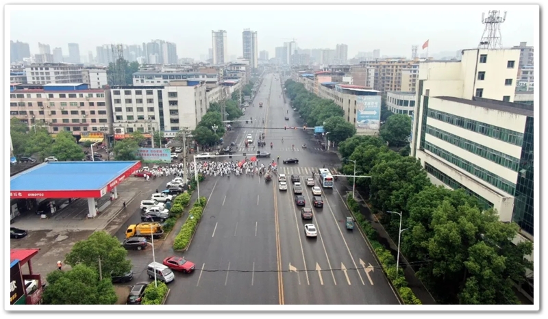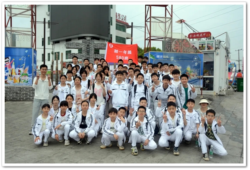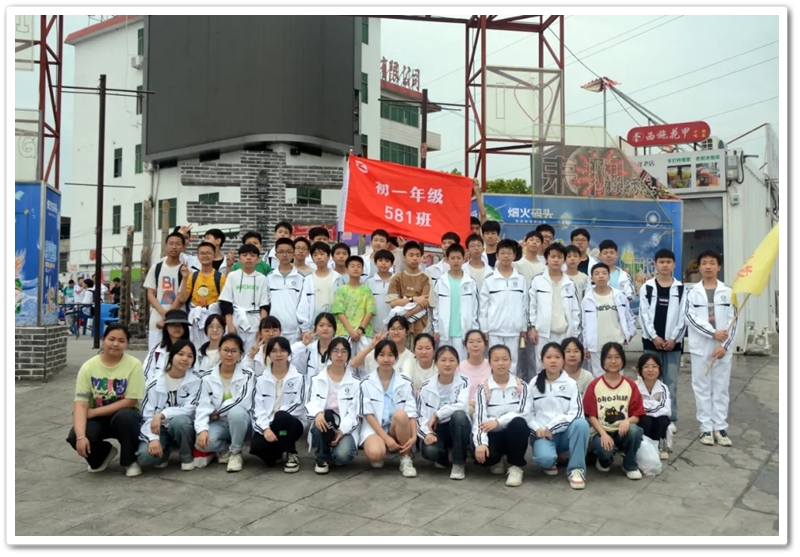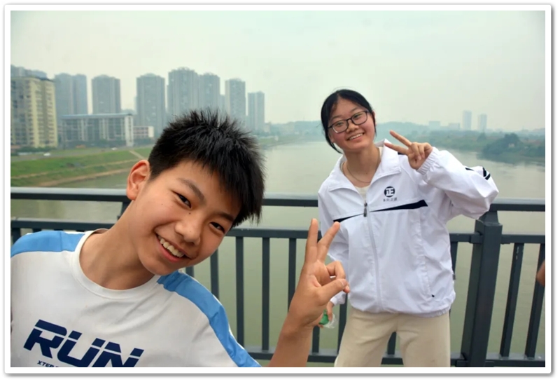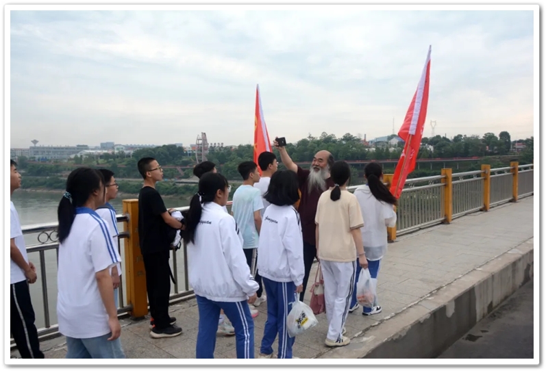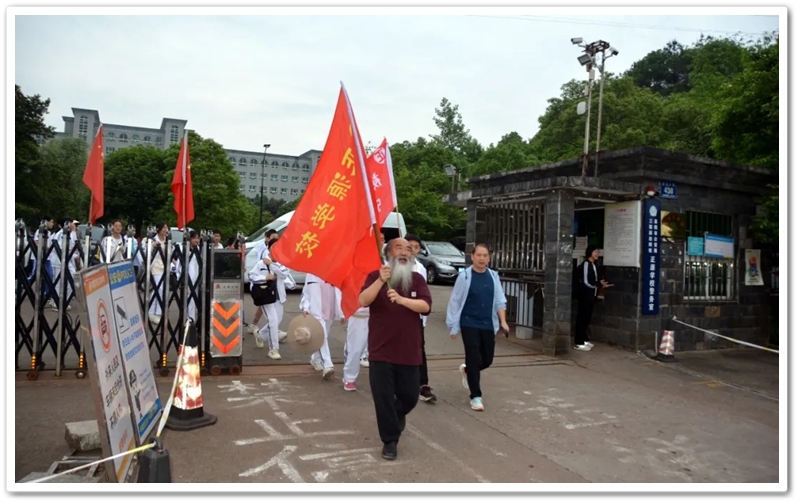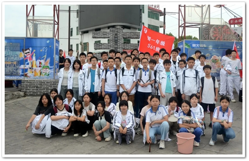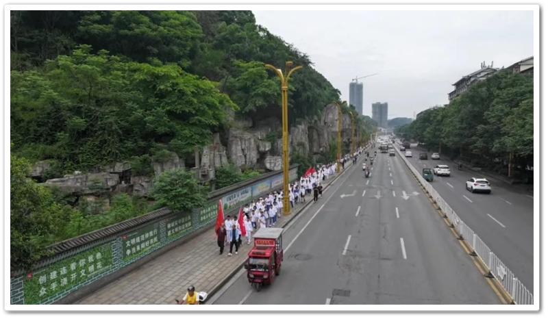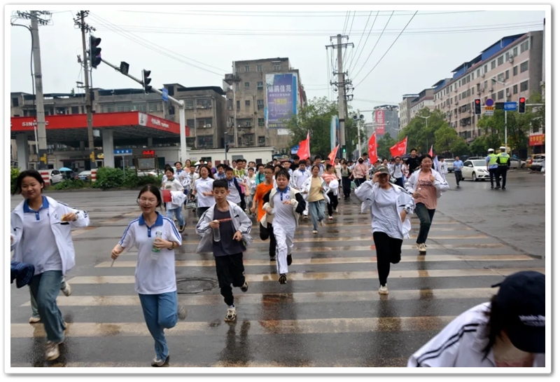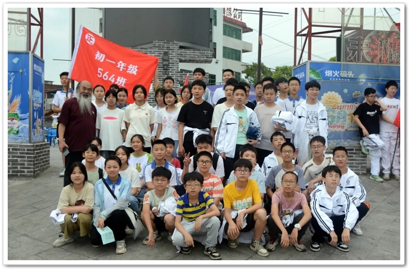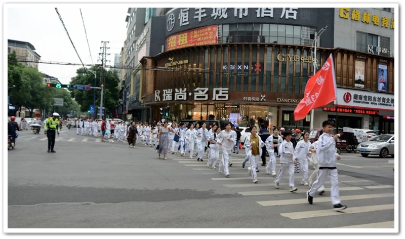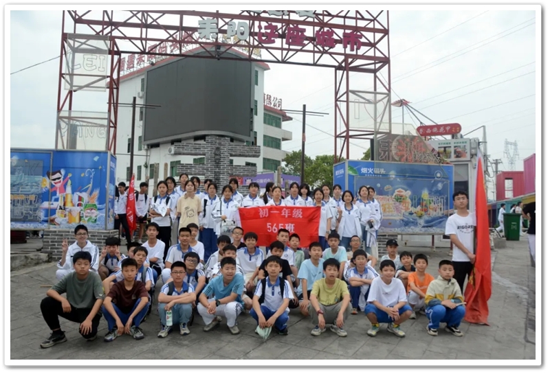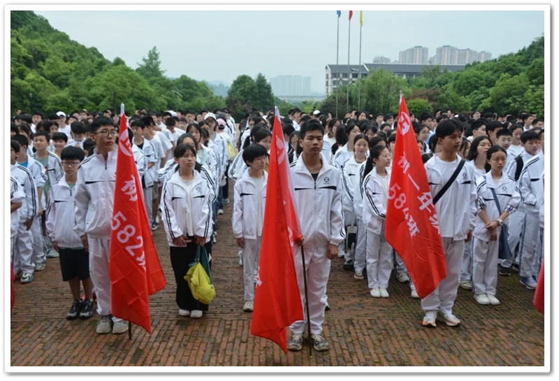 红旗招展,白衣飘飘,千余名初一学子列成路队紧随着校长一路南下。白色长龙穿过广场,绕过太极池,迈出南校门,雄赳赳气昂昂昂首阔步跨进迎宾大道。交警护送,校长开路,气宇昂扬转入笔直的德泰隆大道,一路南行,前进,前进,加油前进!走过神龙广场,穿过城北路,挺进群英路。经过神风鞋城,穿过五一路,又挺进到长长长长的群英南路。经过蔡伦纪念园,先头队伍走进和谐南苑时,时间才刚到9点40。