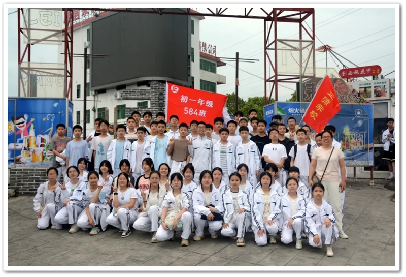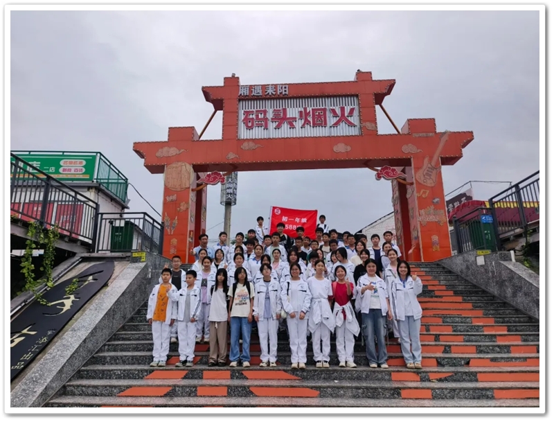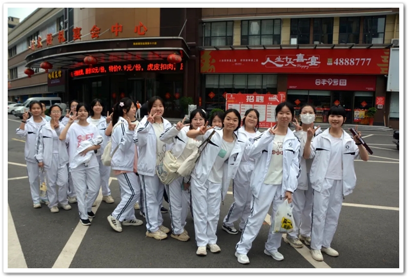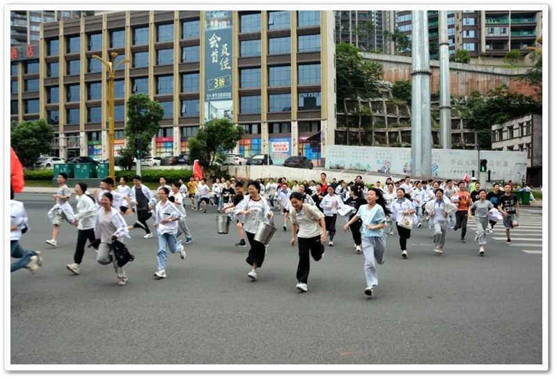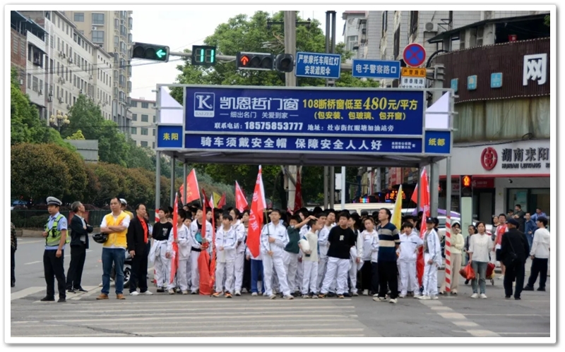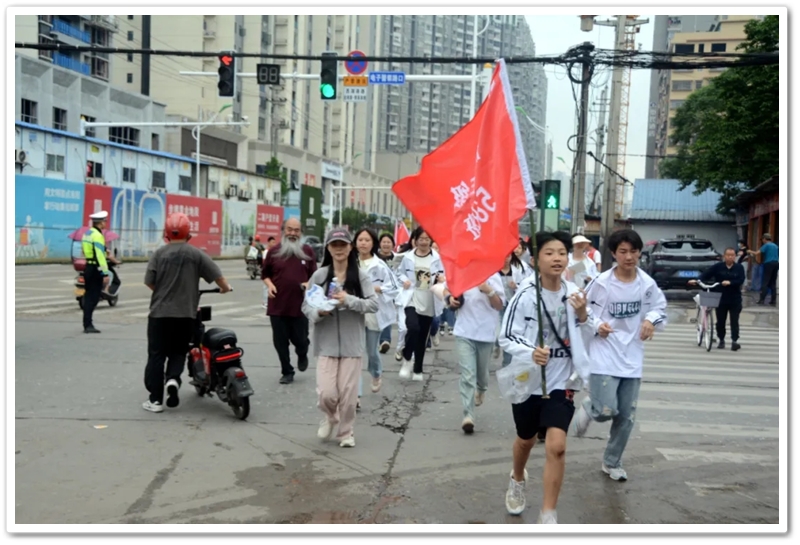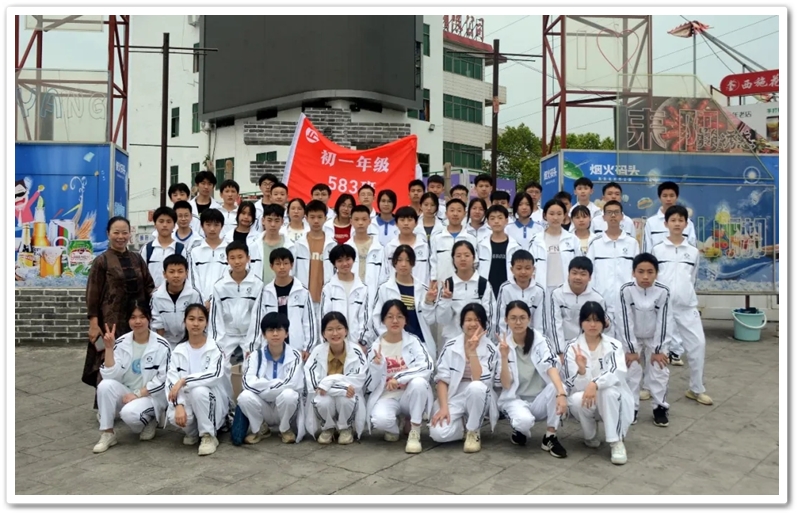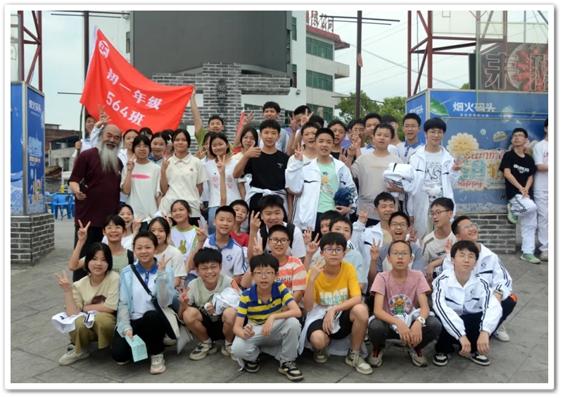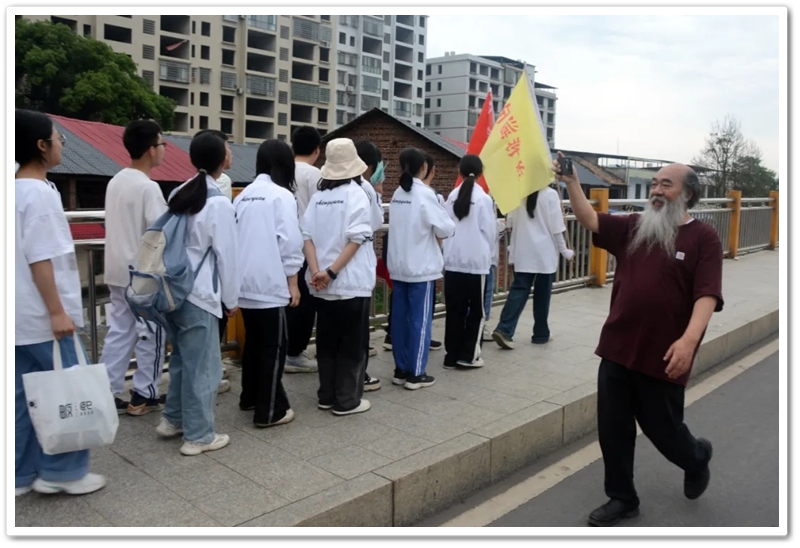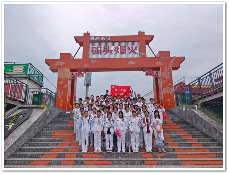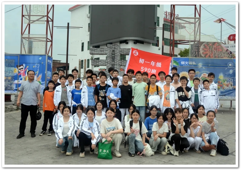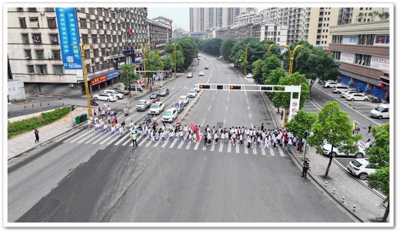 红旗招展,白衣飘飘,千余名初一学子列成路队紧随着校长一路南下。白色长龙穿过广场,绕过太极池,迈出南校门,雄赳赳气昂昂昂首阔步跨进迎宾大道。交警护送,校长开路,气宇昂扬转入笔直的德泰隆大道,一路南行,前进,前进,加油前进!走过神龙广场,穿过城北路,挺进群英路。经过神风鞋城,穿过五一路,又挺进到长长长长的群英南路。经过蔡伦纪念园,先头队伍走进和谐南苑时,时间才刚到9点40。