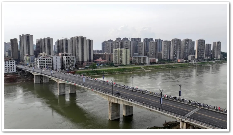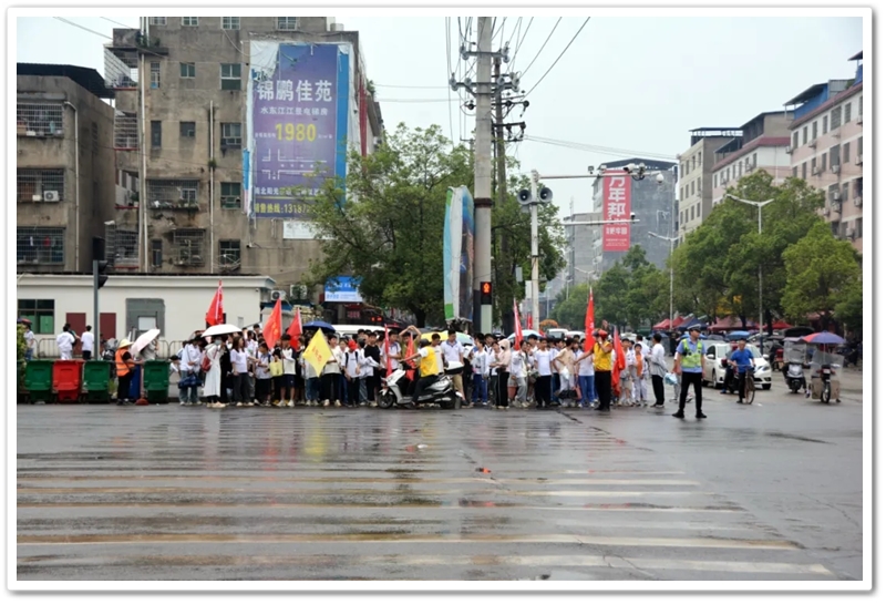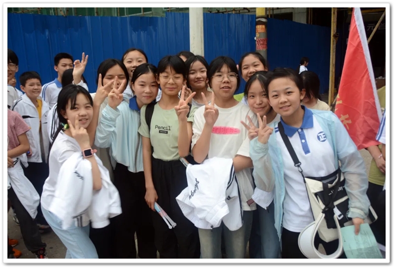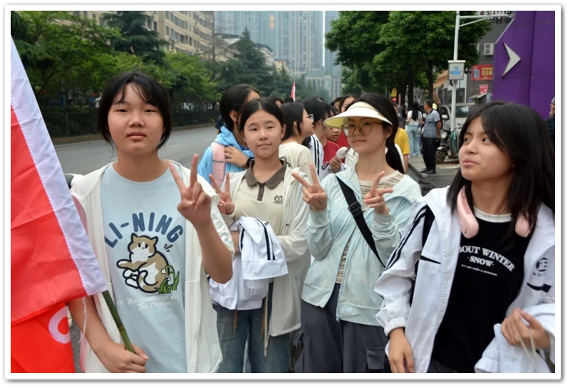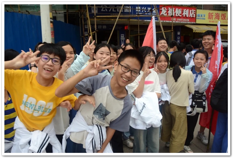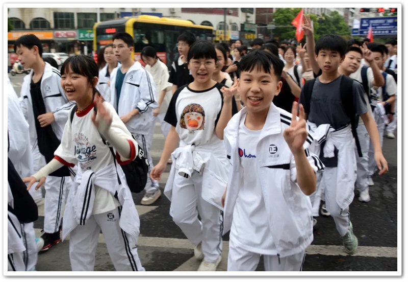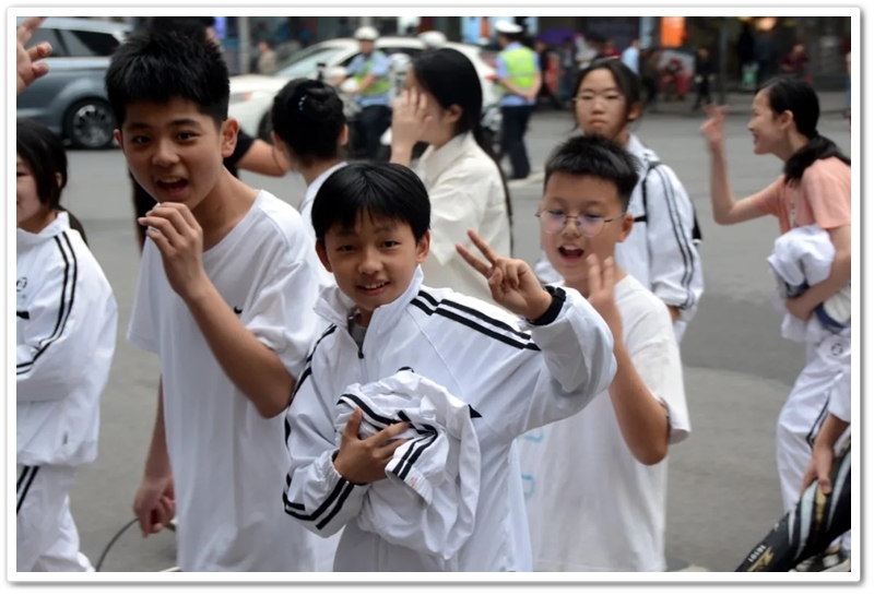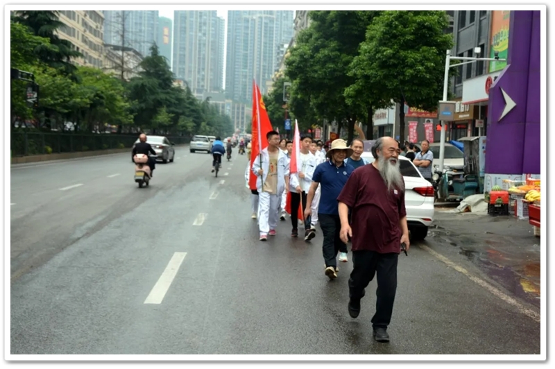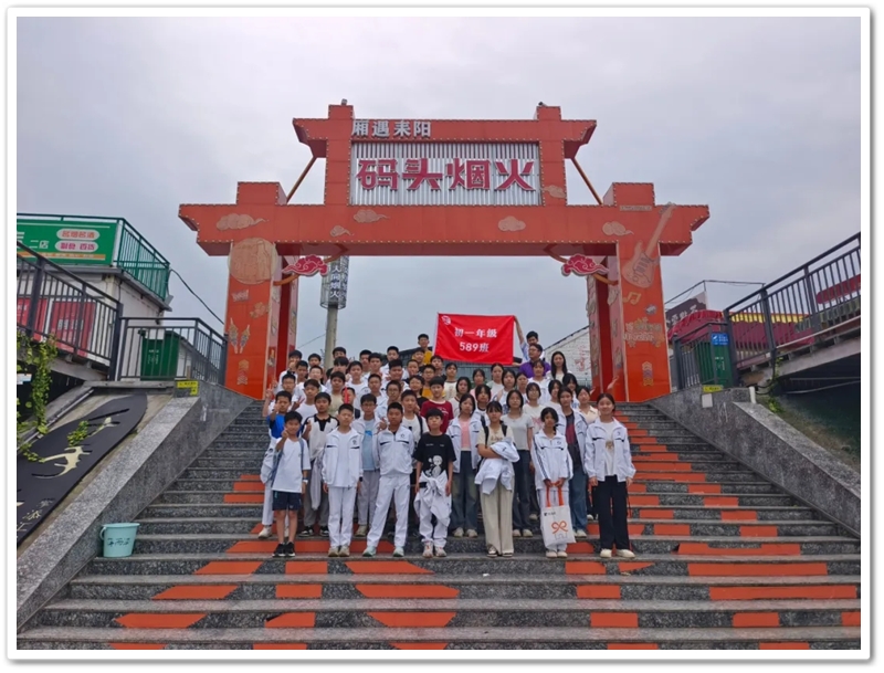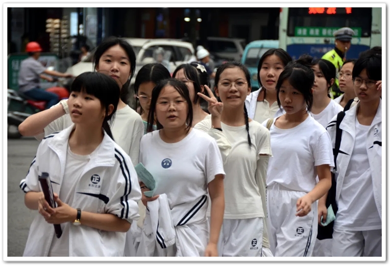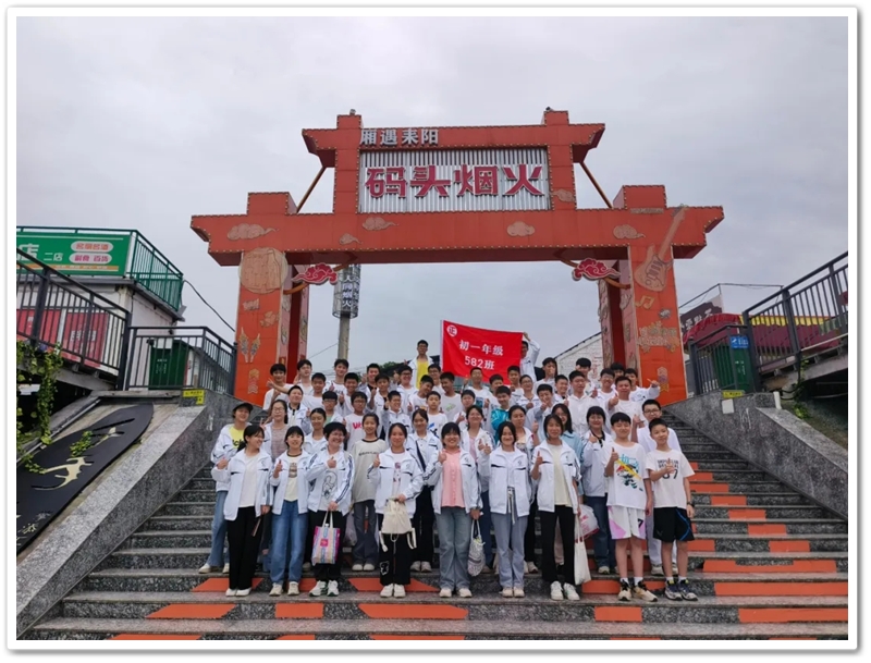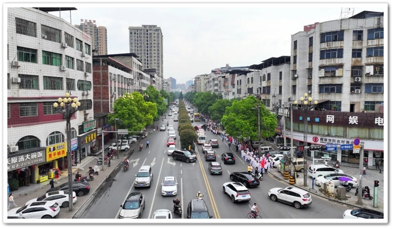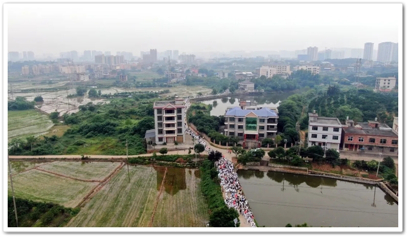 红旗招展,白衣飘飘,千余名初一学子列成路队紧随着校长一路南下。白色长龙穿过广场,绕过太极池,迈出南校门,雄赳赳气昂昂昂首阔步跨进迎宾大道。交警护送,校长开路,气宇昂扬转入笔直的德泰隆大道,一路南行,前进,前进,加油前进!走过神龙广场,穿过城北路,挺进群英路。经过神风鞋城,穿过五一路,又挺进到长长长长的群英南路。经过蔡伦纪念园,先头队伍走进和谐南苑时,时间才刚到9点40。