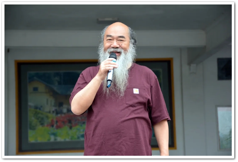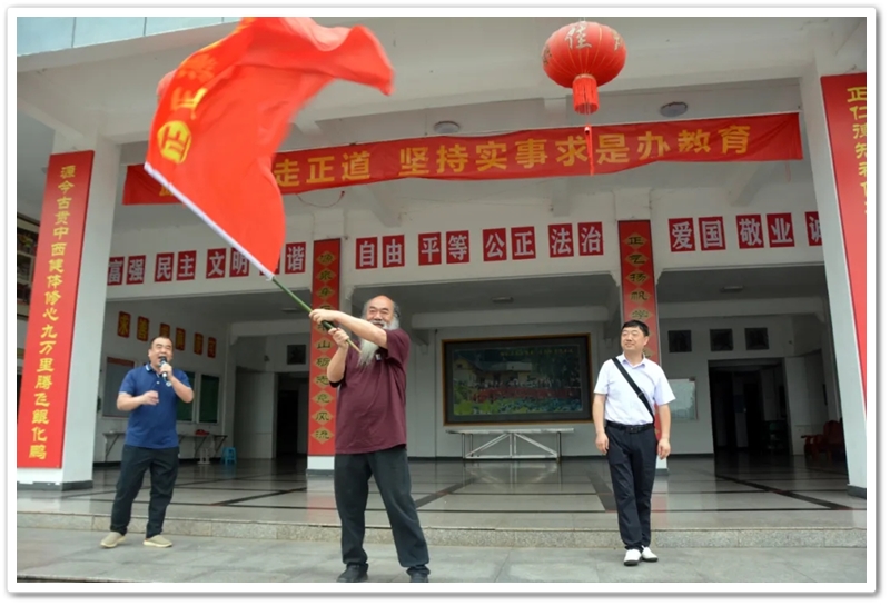 初中学部主任曾良古讲话,交代远足安全事项及注意事项过后,罗校长高举旗帜率队出发。