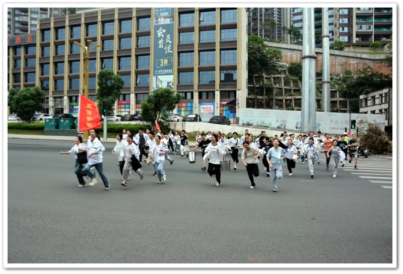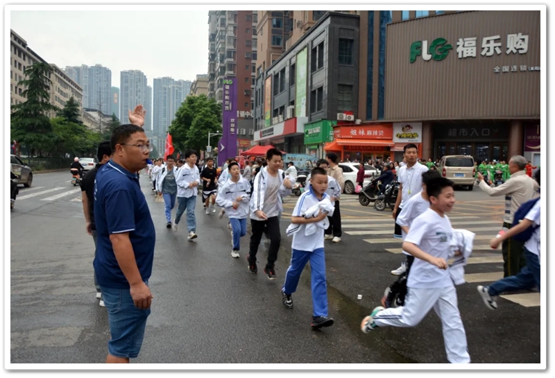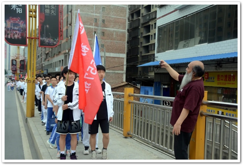 罗校长沿路在同学们身旁穿梭,带着同学们一路高歌,一路高呼班级口号。