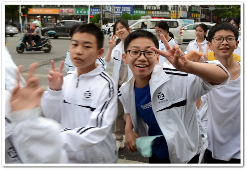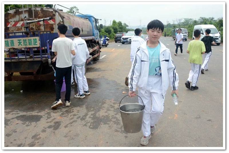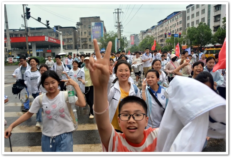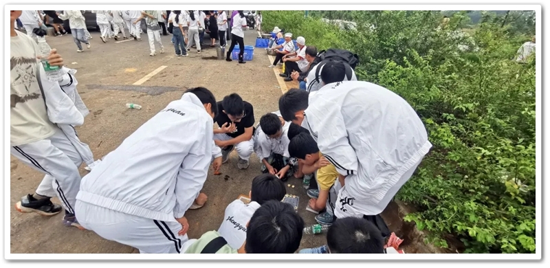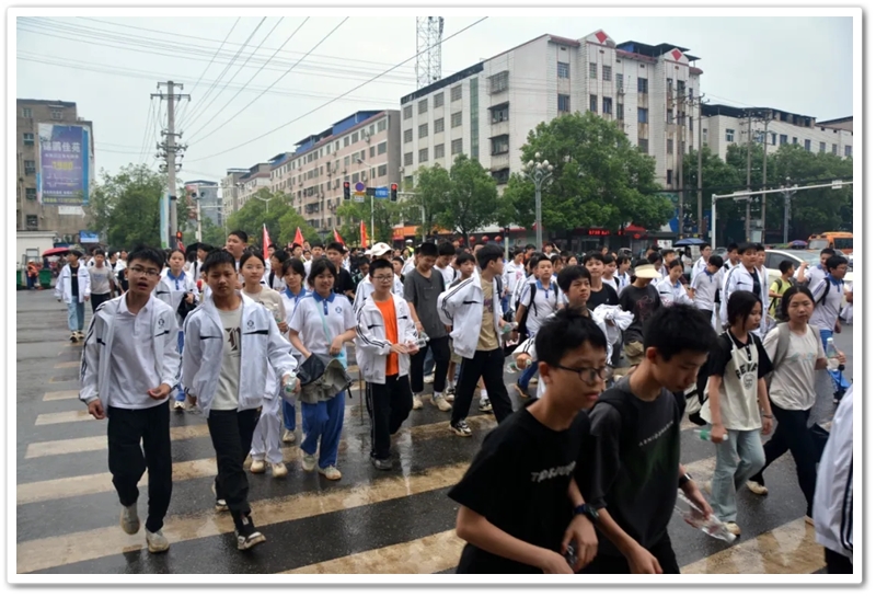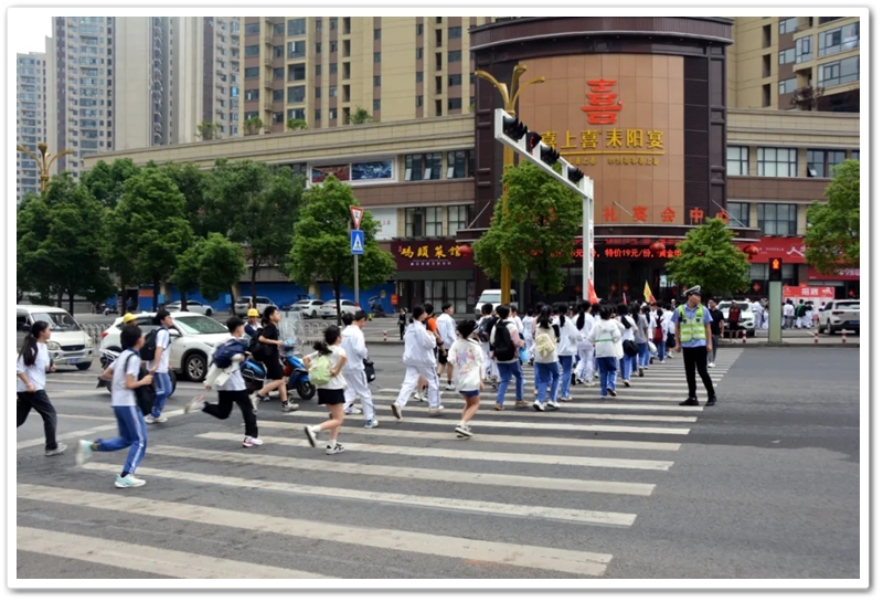 4点步出山路走上大道。依然如来时一样,德育处在最前头开路压阵,以免前头学生走得太快,跟后头长龙拉开距离。校医和综治办工作人员开车在队尾殿后,沿途接收身体不适,或是因甲沟炎等情况行走困难的学生。途经的每个十字路口,交警专岗护送,老师两头迎候。一路井然有序。