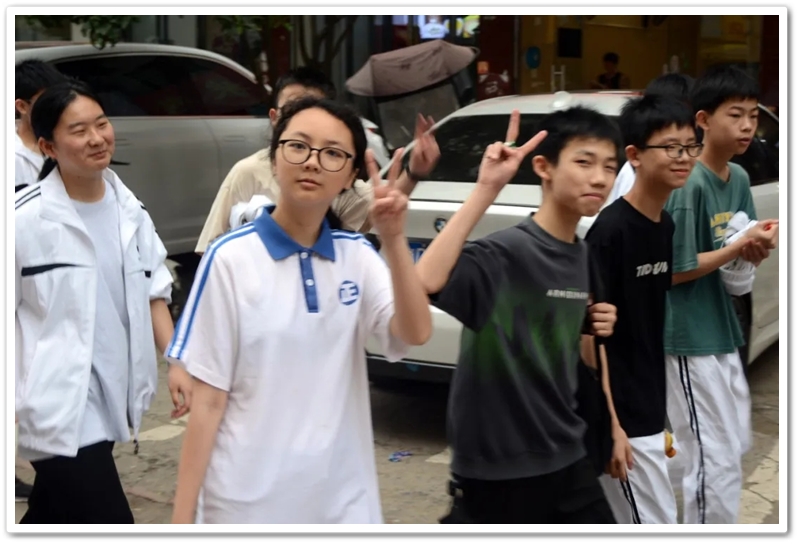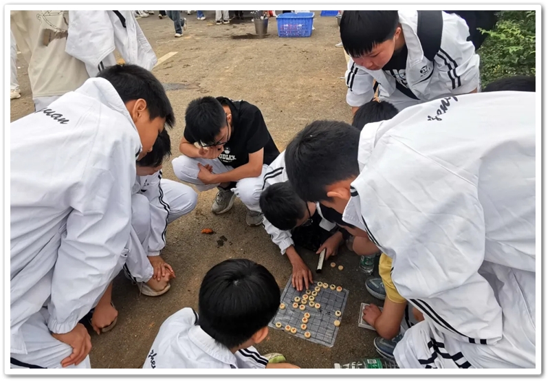 水泥路上也围了一圈同学,他们把塑料棋盘铺在路面,坐的坐,蹲的蹲,站的站,挤成一堆奋力厮杀,棋局战得难分难解。