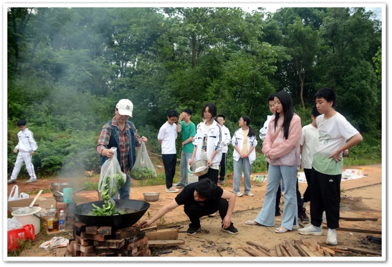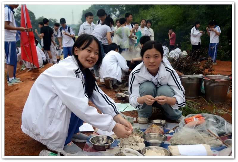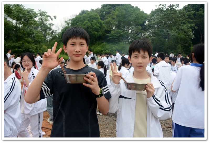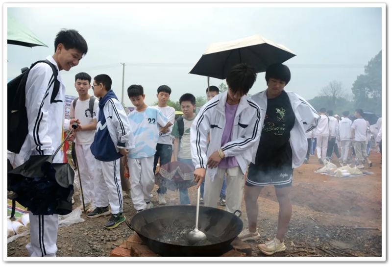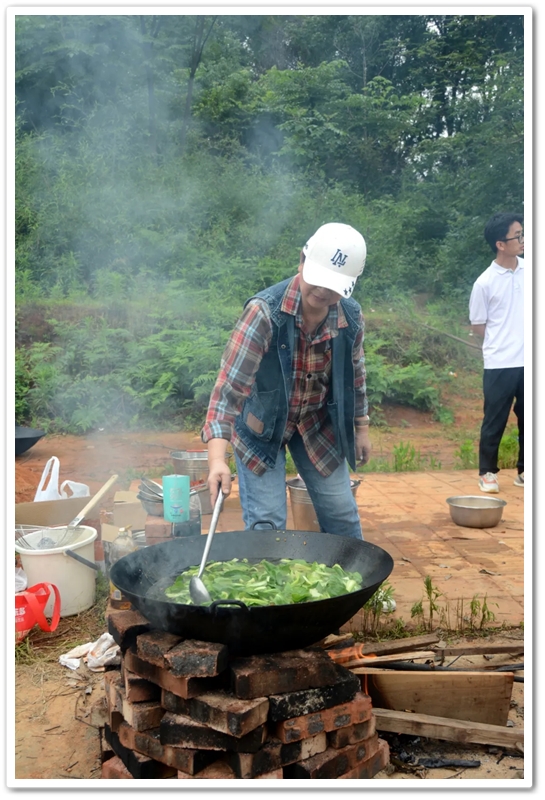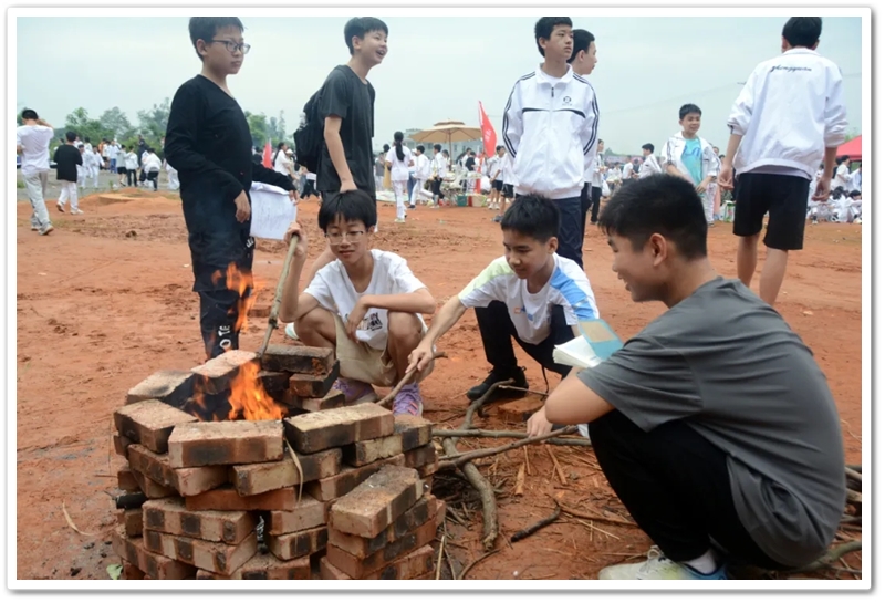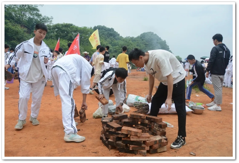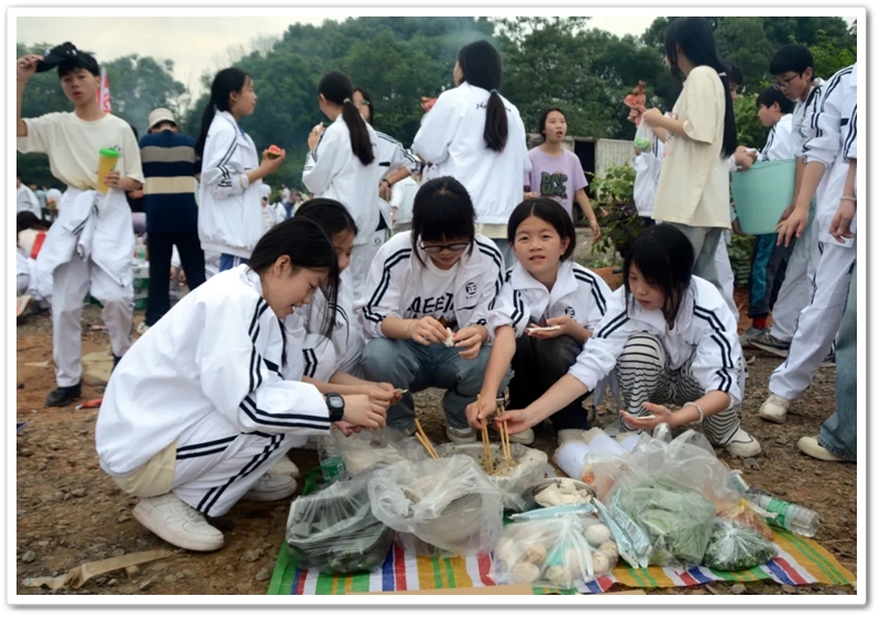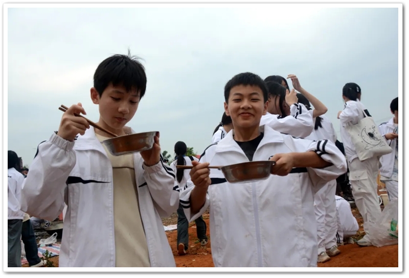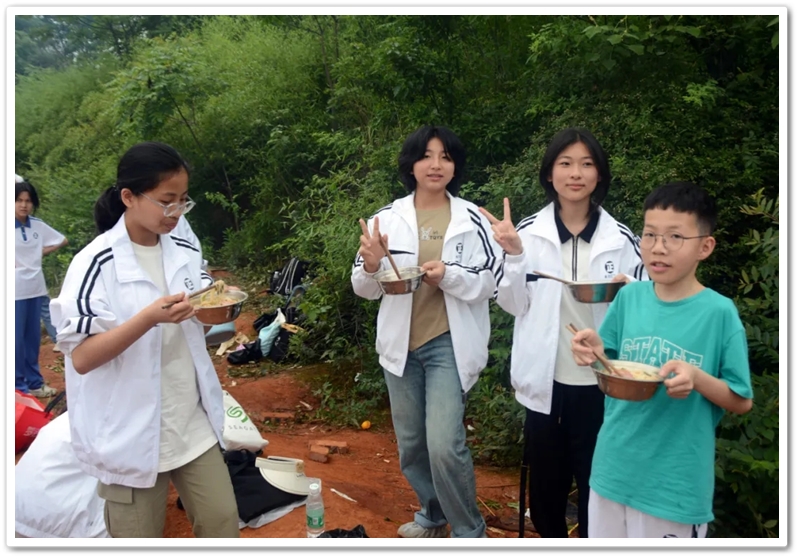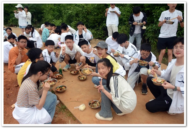 生火做饭,排队打餐,席地而蹲,窸窸嗦嗦声此起彼伏,人人一顿狼吞虎咽,风卷残云大快朵颐过后,时针才堪堪指向12点半。除了收拾碗筷打扫场地的卫生组还在辛勤忙碌,同学们开始三五成群找乐子。