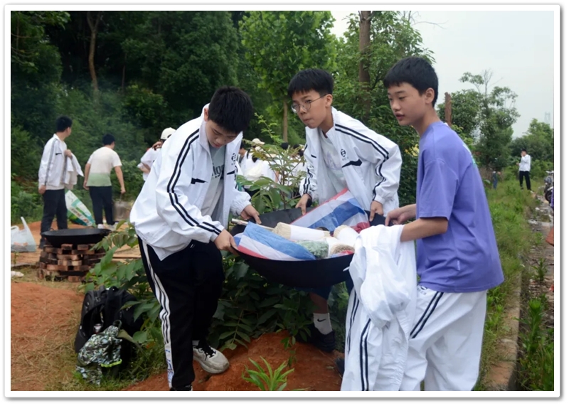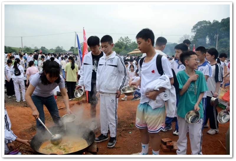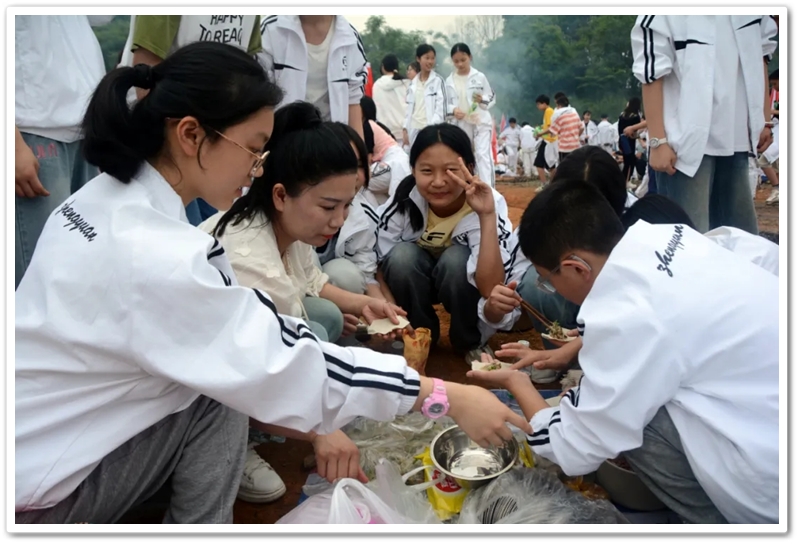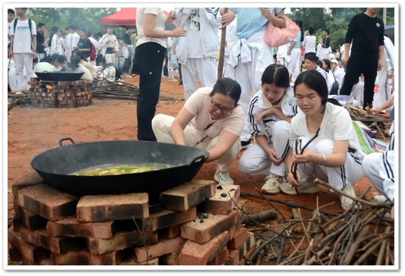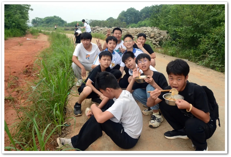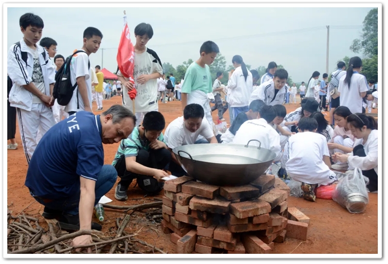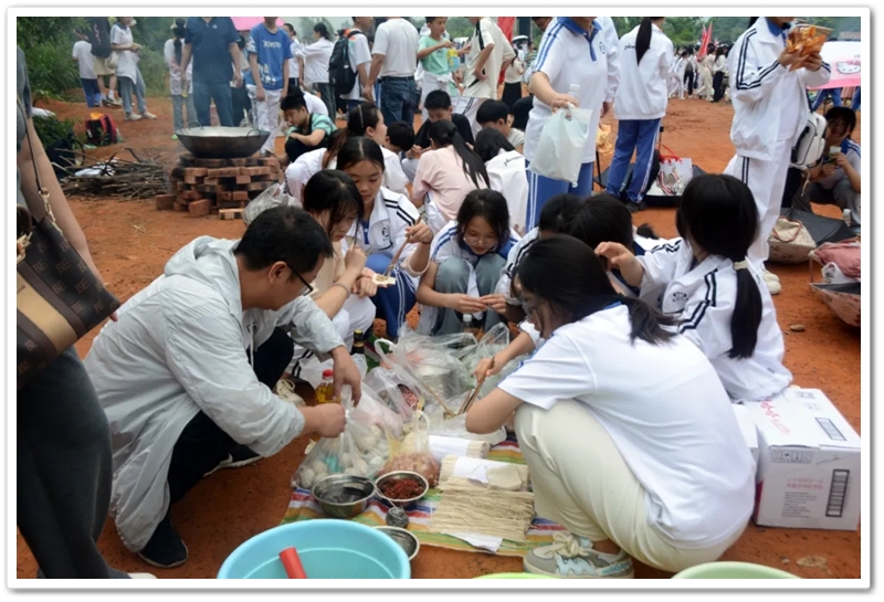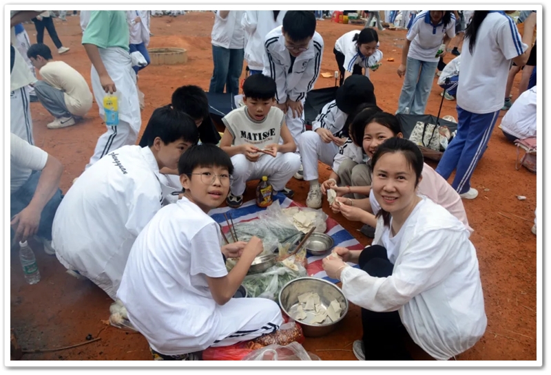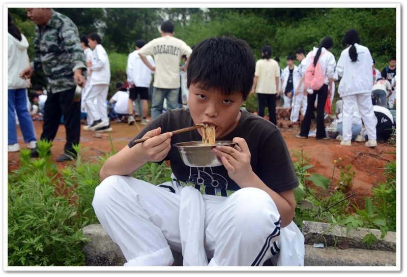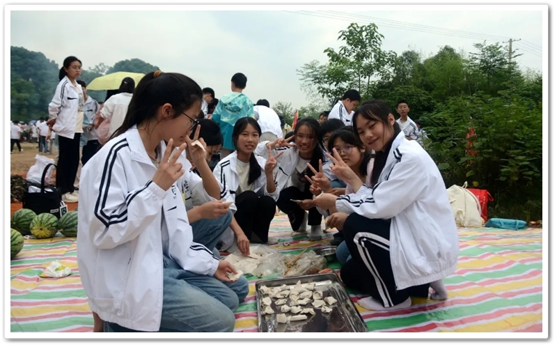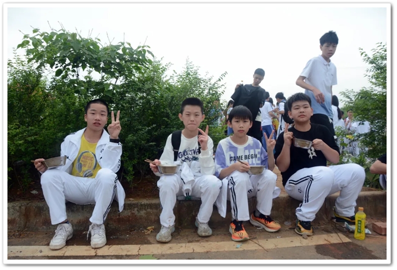 生火做饭,排队打餐,席地而蹲,窸窸嗦嗦声此起彼伏,人人一顿狼吞虎咽,风卷残云大快朵颐过后,时针才堪堪指向12点半。除了收拾碗筷打扫场地的卫生组还在辛勤忙碌,同学们开始三五成群找乐子。