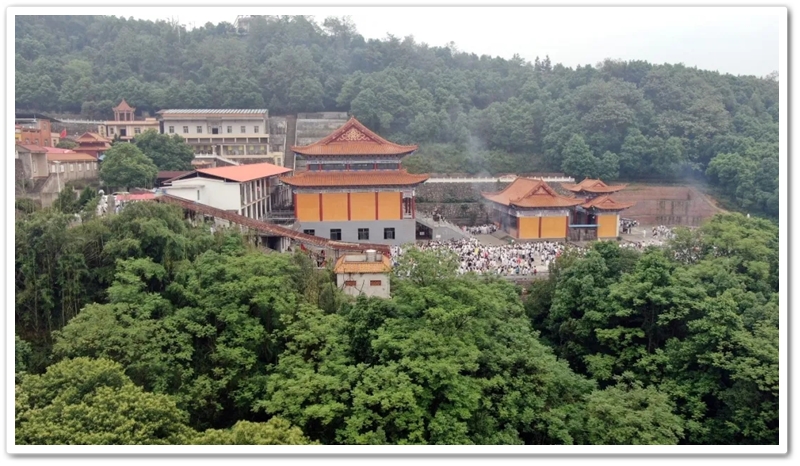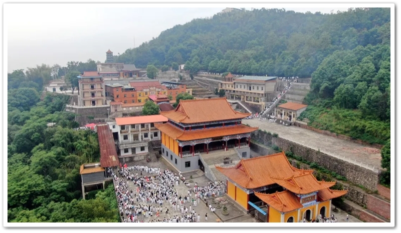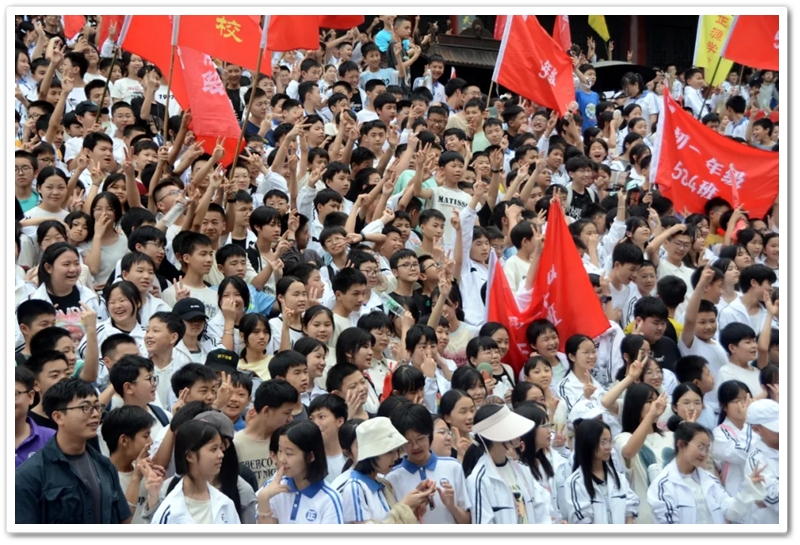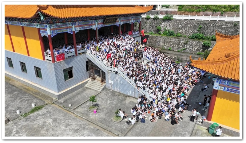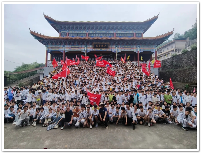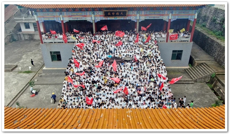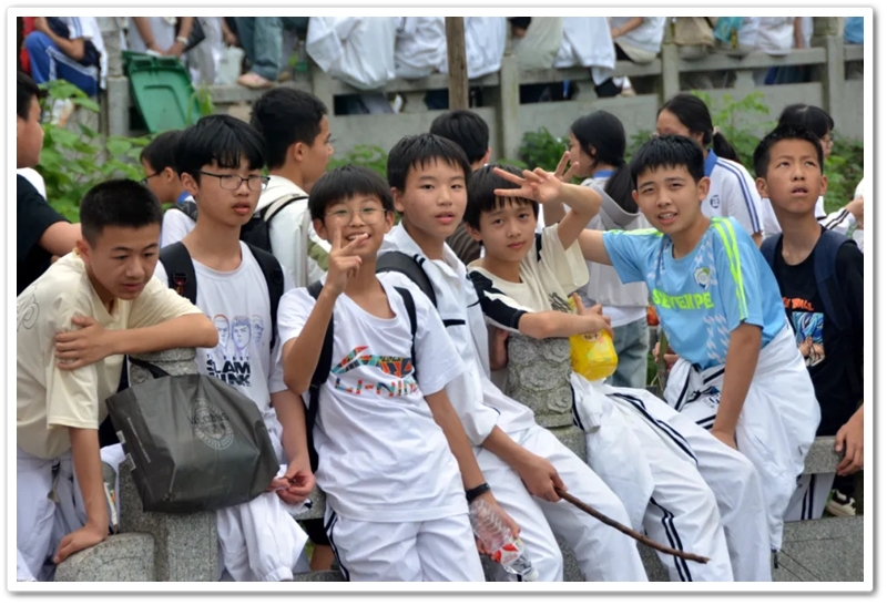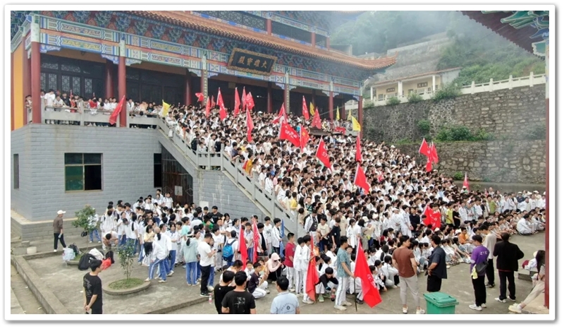 移步到大雄宝殿,参观休憩一阵过后,后续队伍陆续到齐。千余名初一同学汇集鹿峰寺大雄宝殿殿前台阶,汇成白浪汹涌的海洋,舞动烈焰纷飞的旗帜,花样少年们激情澎湃,放声高歌,齐声欢呼。