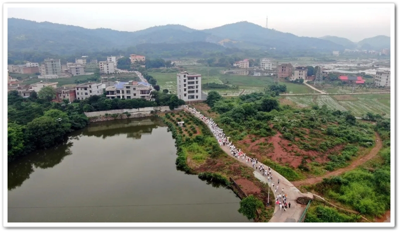 跨过鹿岐峰大桥,蜿蜒数公里的白色长龙来到烟火码头。休憩,列队,合影,再出发,孩子们一鼓作气势如虎,11点胜利抵达鹿岐峰山脚下的野炊营地。