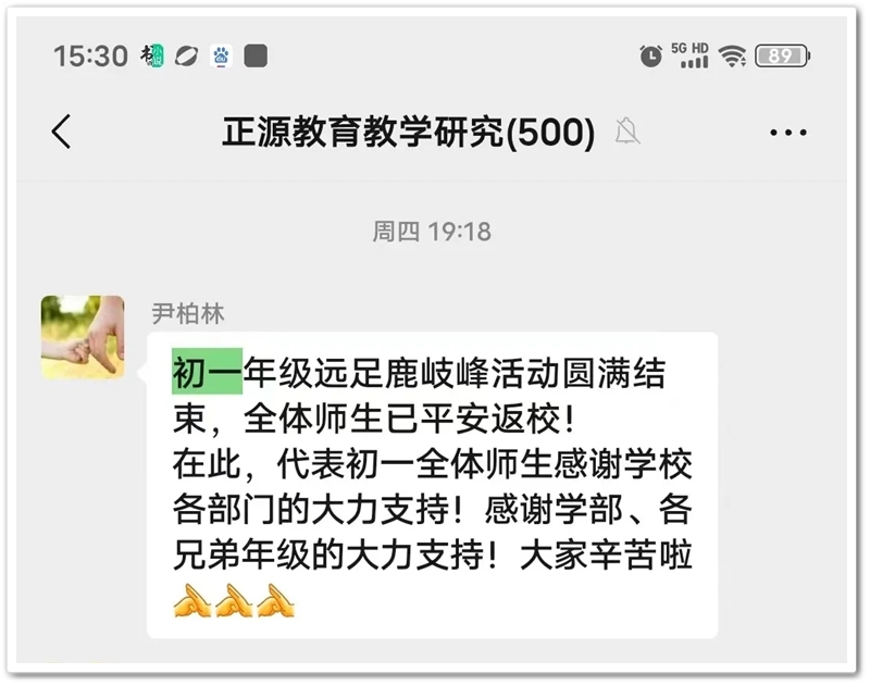下午5点20分,学部领导、年级行政、综治办及德育处工作人员目送最后一名同学安全进入学校西门。全体师生平安返校,初一年级远足鹿岐峰活动圆满结束。