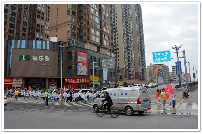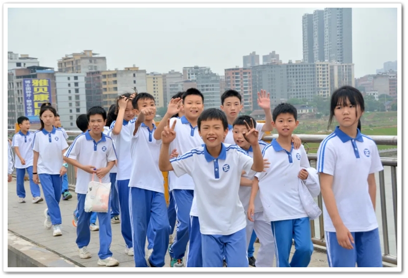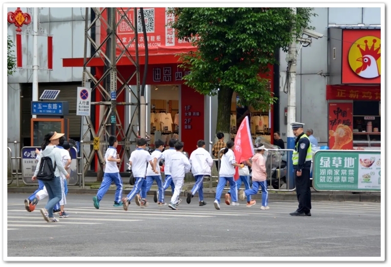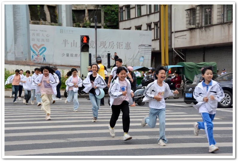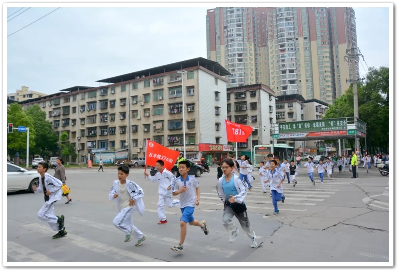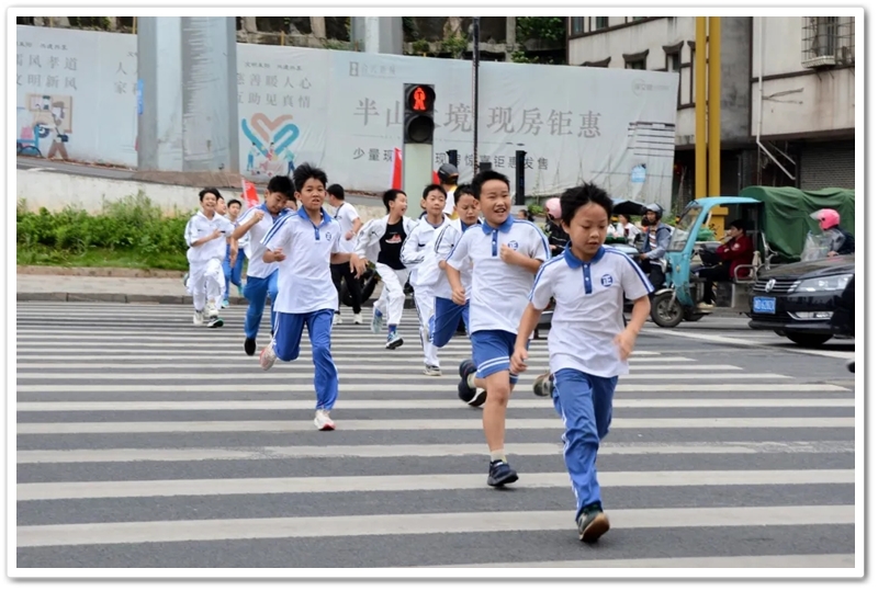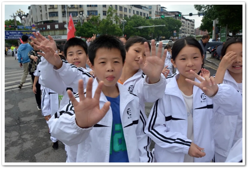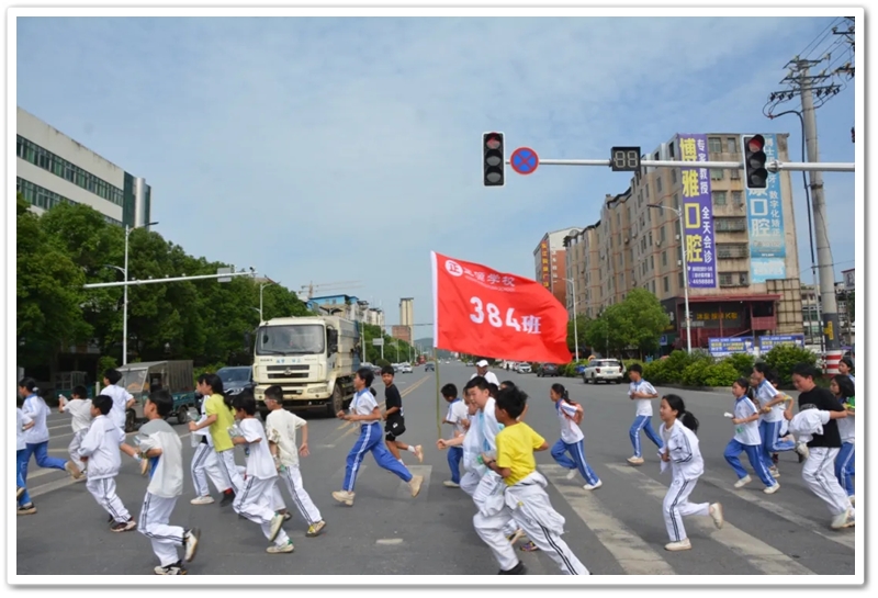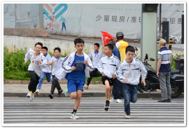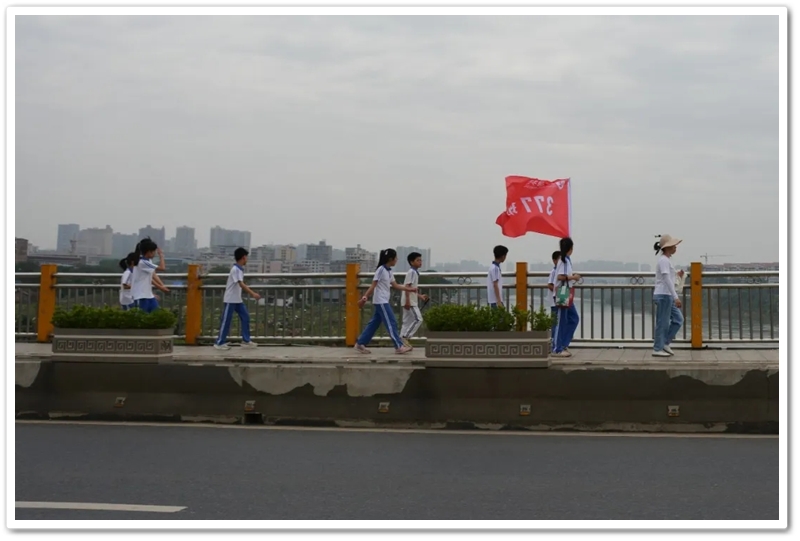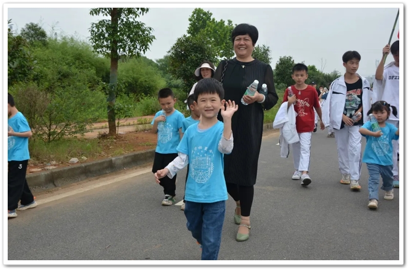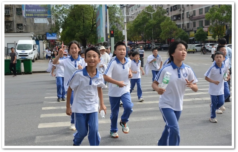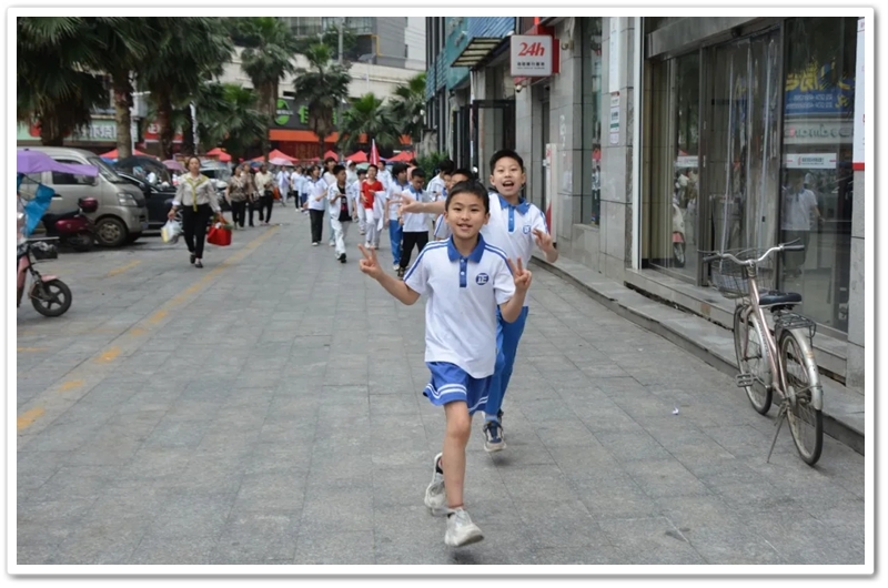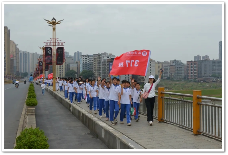 出校门,下迎宾大道,红绿灯左转,直入德泰隆路,半个小时,队伍已到达耒阳大桥下,在耒阳交警的护卫下,在校安保队的组织下,同学们鱼贯穿过长长的城北路口,汇入群英北路,继续直行,过五一路口,经蔡伦纪念园,一个转弯,鹿岐峰大桥就赫然出现在眼前。一路上,同学们有说有笑,你追我赶,争先恐后,意气昂扬!为了不掉队,同学们一切行动听指挥,纪律严明;为了不掉队,有的同学们连走带跑,保证队伍运行速度;我们的同学就好比一个个士兵,我们的队伍就如同一支军队,在老师的带领下,出来“拉练”。对,拉练,拉练,我们是在拉练,我们如一支军队在拉练。我们的学生在拉练,我们的老师也在拉练。没有一个掉队的学生,没有一个掉队的老师!然而在这样的“紧急行军”过程中,你还会看到一幕幕“舒缓”的景象:“爷爷好”、“奶奶好”、“叔叔好”、“阿姨好”、“伯伯好”、“....好”。清晨,菜市繁忙,人潮涌动,最是人间烟火气的时候,在这一声声稚嫩却真挚的主动问候里,谁听了不心头一颤,顿觉甜蜜呢?这一声声清脆悦耳的问候,给耒阳城的早市增添了无限的活力与温馨!校园文明建设,城市文明建设,讲文明话,做文明事,并不是一句空谈,只有切切实实说到了,做到了,才能实现文明建设。