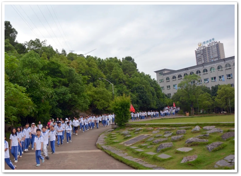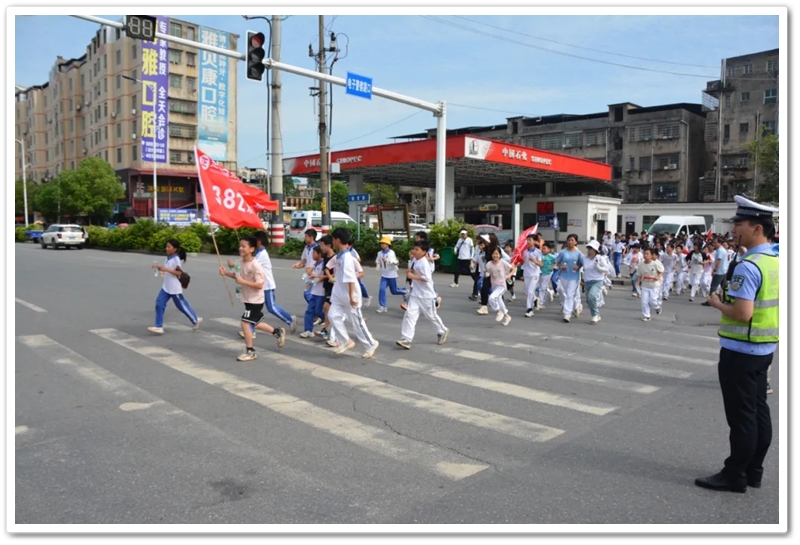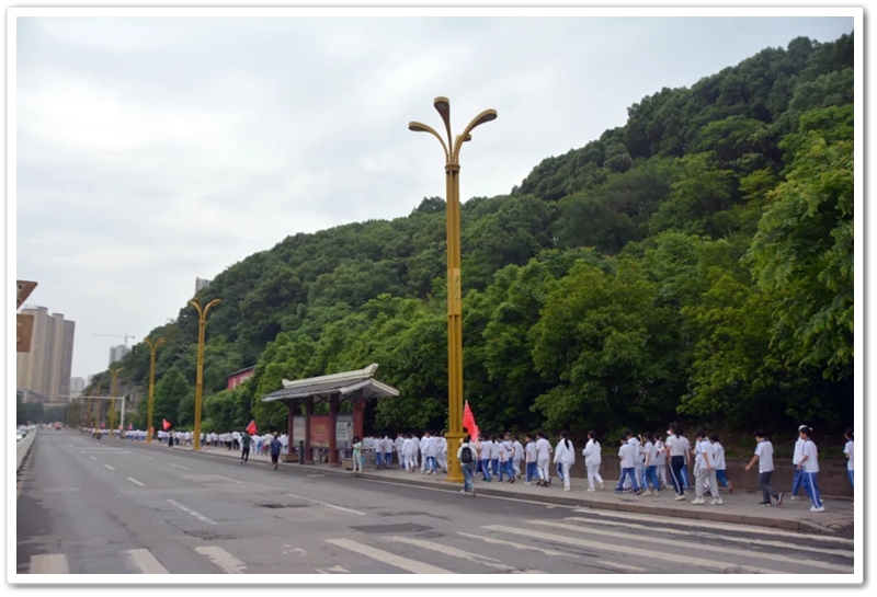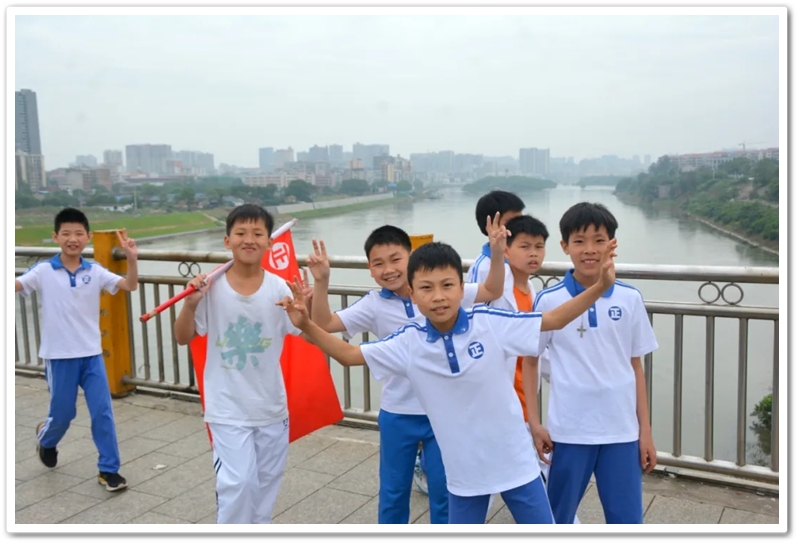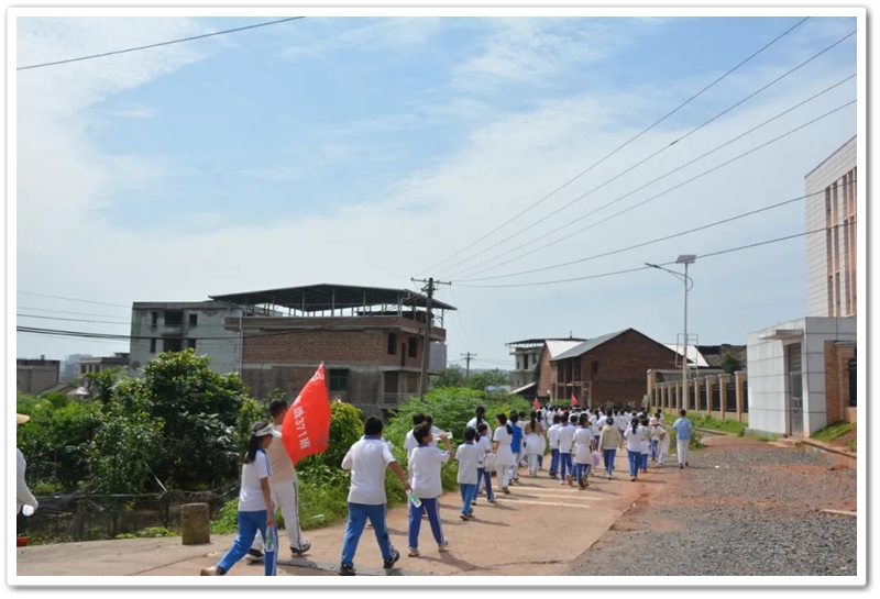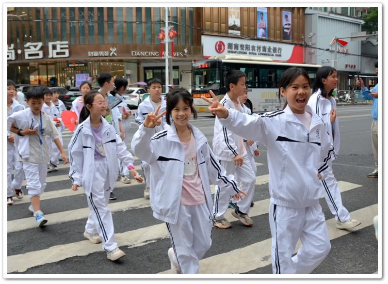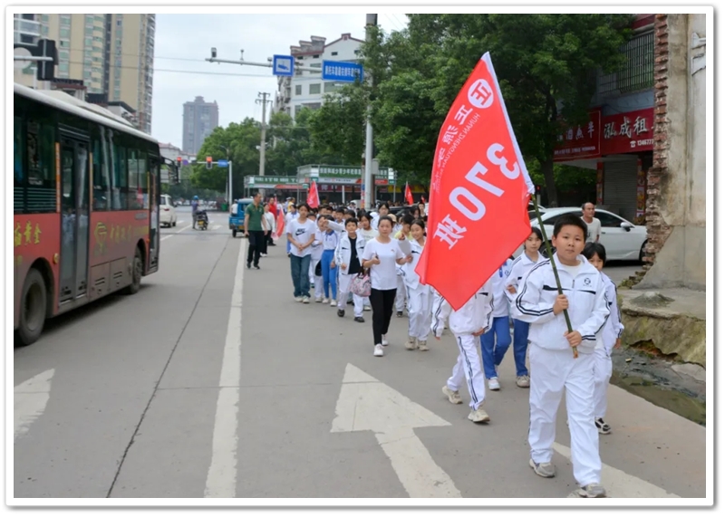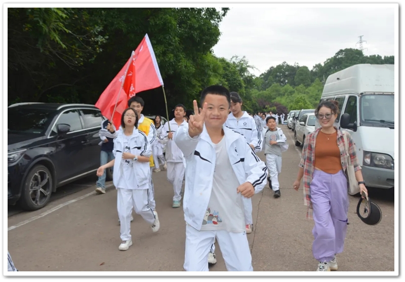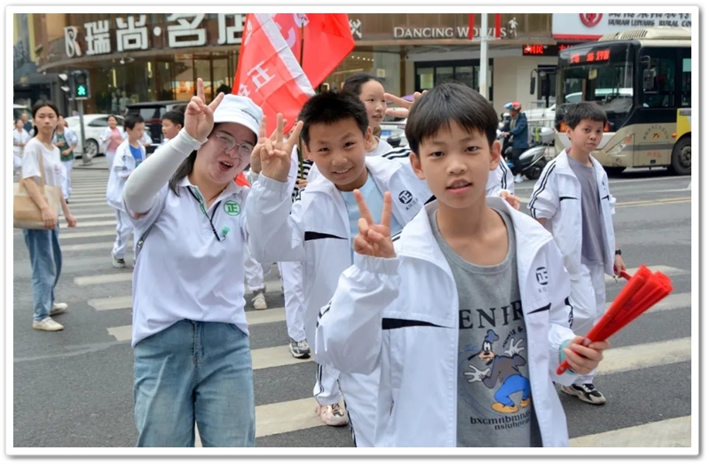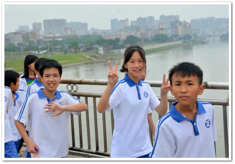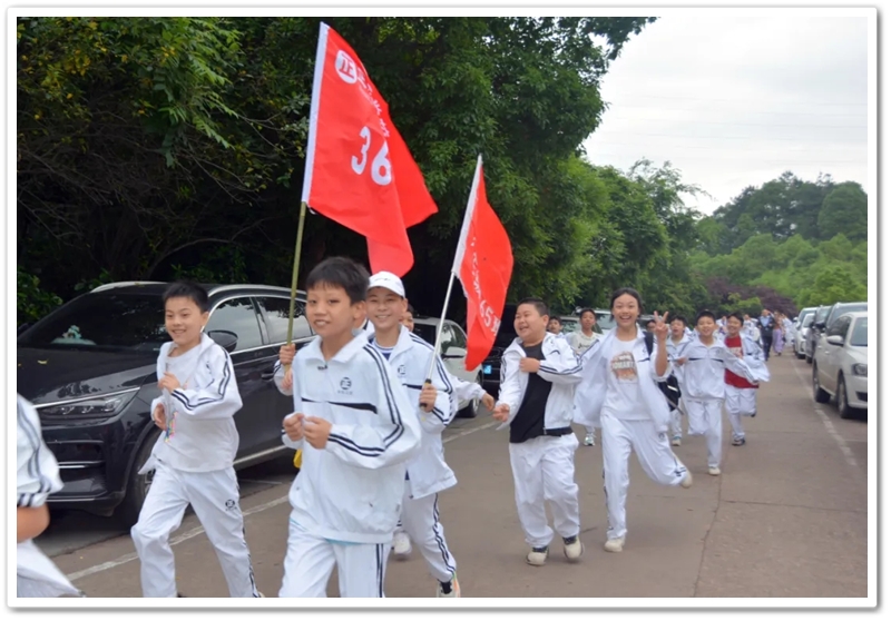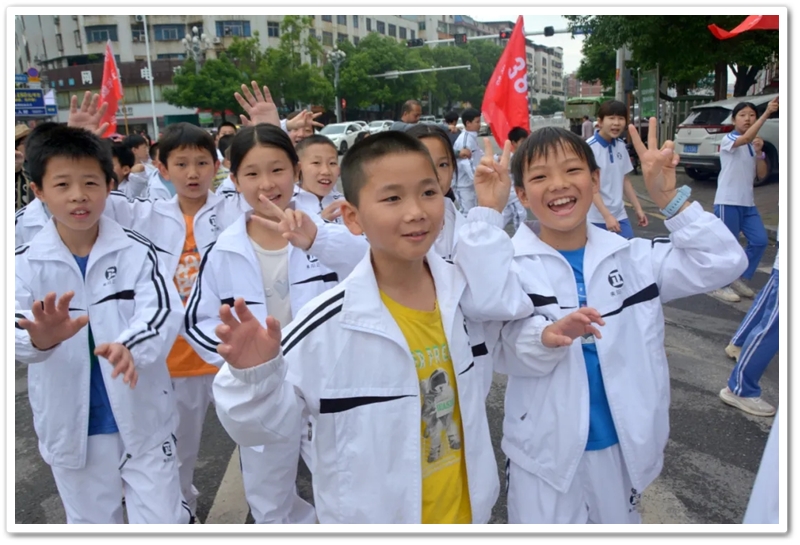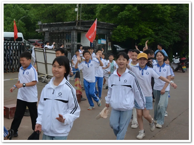 出校门,下迎宾大道,红绿灯左转,直入德泰隆路,半个小时,队伍已到达耒阳大桥下,在耒阳交警的护卫下,在校安保队的组织下,同学们鱼贯穿过长长的城北路口,汇入群英北路,继续直行,过五一路口,经蔡伦纪念园,一个转弯,鹿岐峰大桥就赫然出现在眼前。一路上,同学们有说有笑,你追我赶,争先恐后,意气昂扬!为了不掉队,同学们一切行动听指挥,纪律严明;为了不掉队,有的同学们连走带跑,保证队伍运行速度;我们的同学就好比一个个士兵,我们的队伍就如同一支军队,在老师的带领下,出来“拉练”。对,拉练,拉练,我们是在拉练,我们如一支军队在拉练。我们的学生在拉练,我们的老师也在拉练。没有一个掉队的学生,没有一个掉队的老师!然而在这样的“紧急行军”过程中,你还会看到一幕幕“舒缓”的景象:“爷爷好”、“奶奶好”、“叔叔好”、“阿姨好”、“伯伯好”、“....好”。清晨,菜市繁忙,人潮涌动,最是人间烟火气的时候,在这一声声稚嫩却真挚的主动问候里,谁听了不心头一颤,顿觉甜蜜呢?这一声声清脆悦耳的问候,给耒阳城的早市增添了无限的活力与温馨!校园文明建设,城市文明建设,讲文明话,做文明事,并不是一句空谈,只有切切实实说到了,做到了,才能实现文明建设。