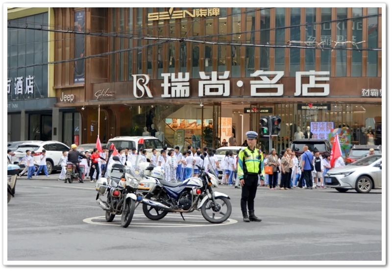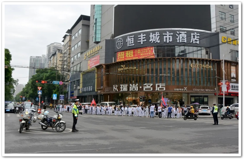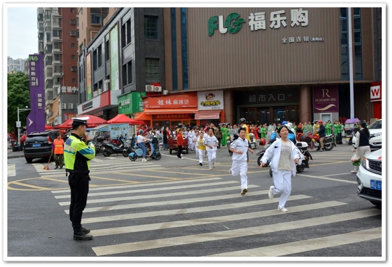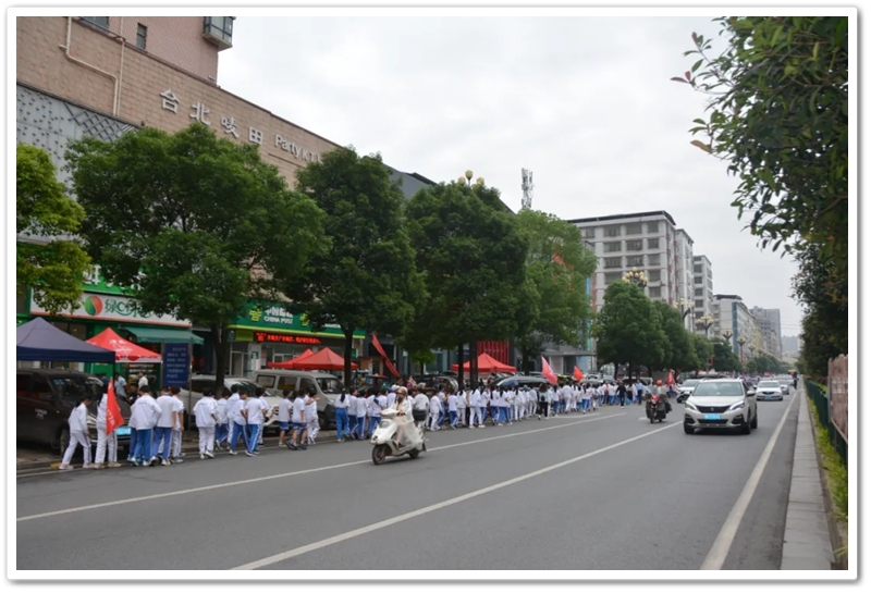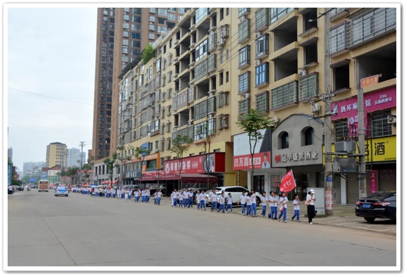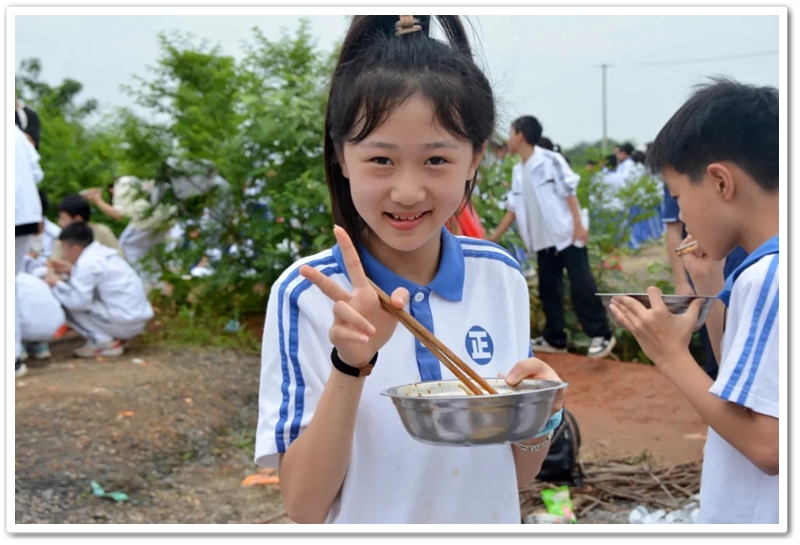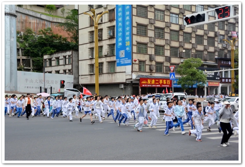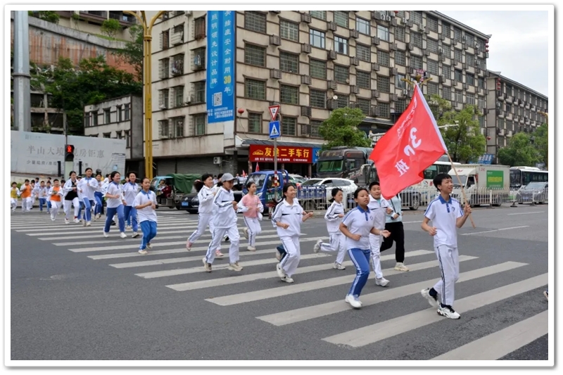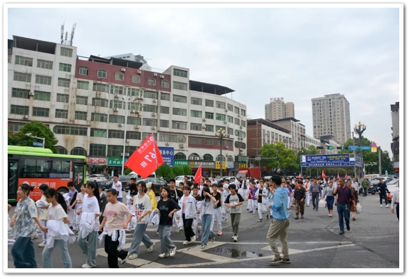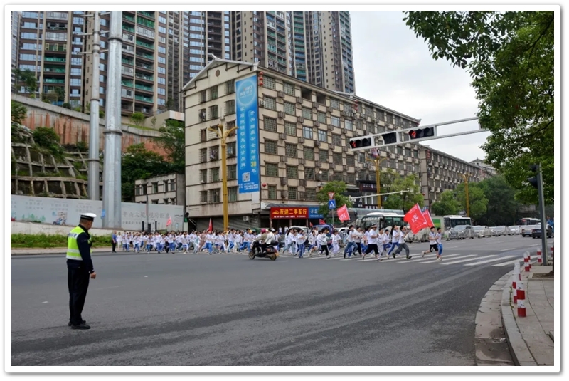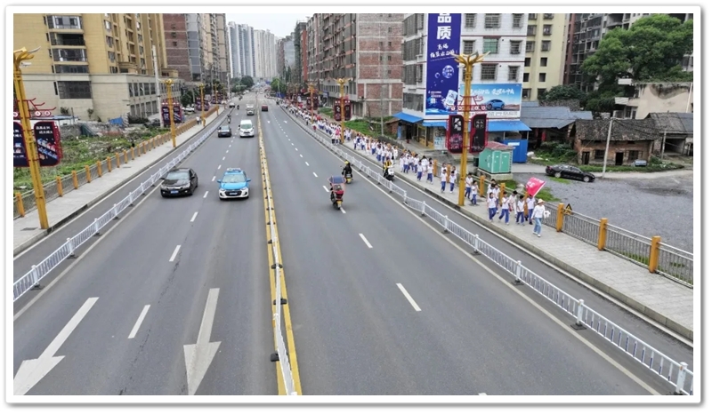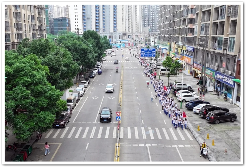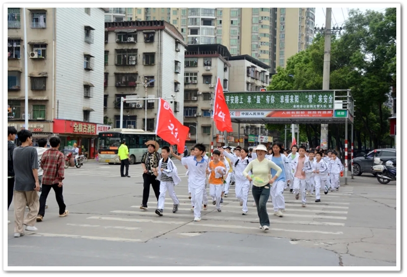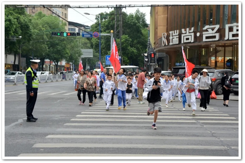 出校门,下迎宾大道,红绿灯左转,直入德泰隆路,半个小时,队伍已到达耒阳大桥下,在耒阳交警的护卫下,在校安保队的组织下,同学们鱼贯穿过长长的城北路口,汇入群英北路,继续直行,过五一路口,经蔡伦纪念园,一个转弯,鹿岐峰大桥就赫然出现在眼前。一路上,同学们有说有笑,你追我赶,争先恐后,意气昂扬!为了不掉队,同学们一切行动听指挥,纪律严明;为了不掉队,有的同学们连走带跑,保证队伍运行速度;我们的同学就好比一个个士兵,我们的队伍就如同一支军队,在老师的带领下,出来“拉练”。对,拉练,拉练,我们是在拉练,我们如一支军队在拉练。我们的学生在拉练,我们的老师也在拉练。没有一个掉队的学生,没有一个掉队的老师!然而在这样的“紧急行军”过程中,你还会看到一幕幕“舒缓”的景象:“爷爷好”、“奶奶好”、“叔叔好”、“阿姨好”、“伯伯好”、“....好”。清晨,菜市繁忙,人潮涌动,最是人间烟火气的时候,在这一声声稚嫩却真挚的主动问候里,谁听了不心头一颤,顿觉甜蜜呢?这一声声清脆悦耳的问候,给耒阳城的早市增添了无限的活力与温馨!校园文明建设,城市文明建设,讲文明话,做文明事,并不是一句空谈,只有切切实实说到了,做到了,才能实现文明建设。