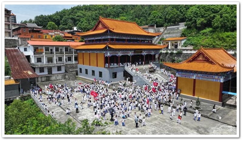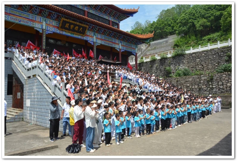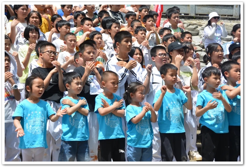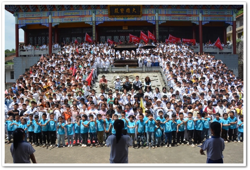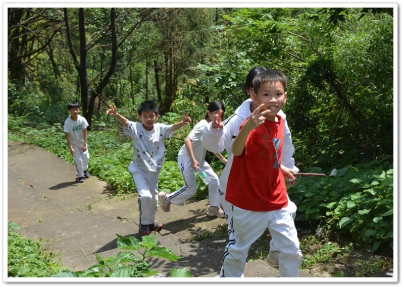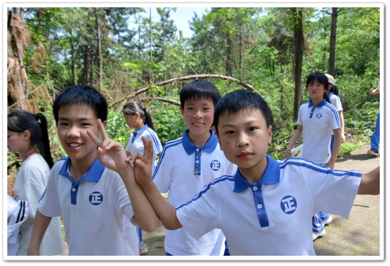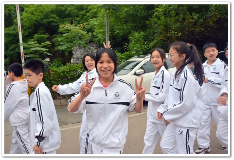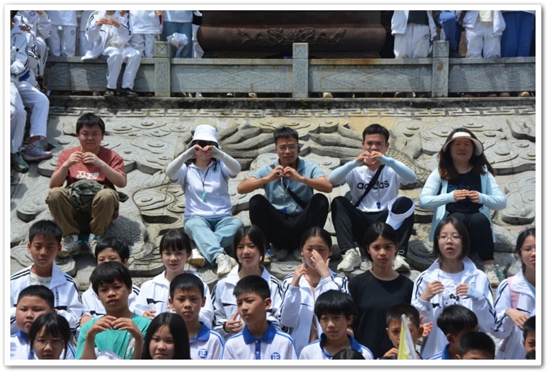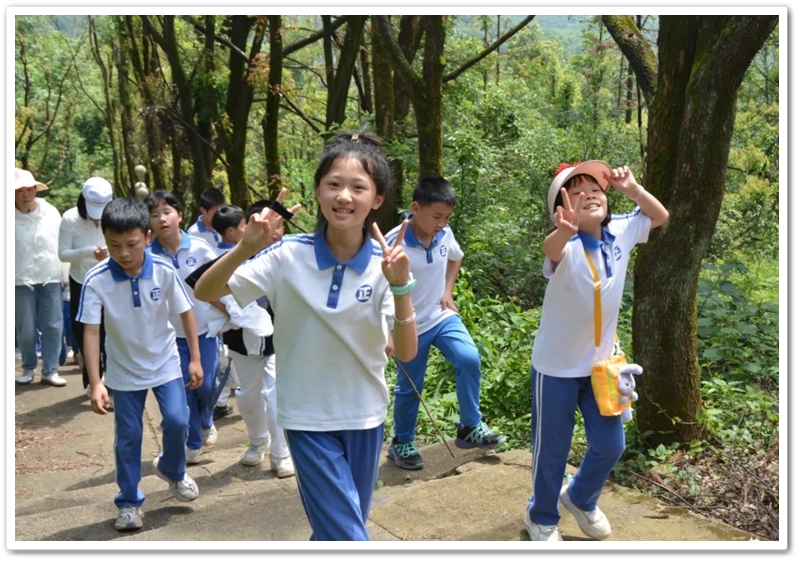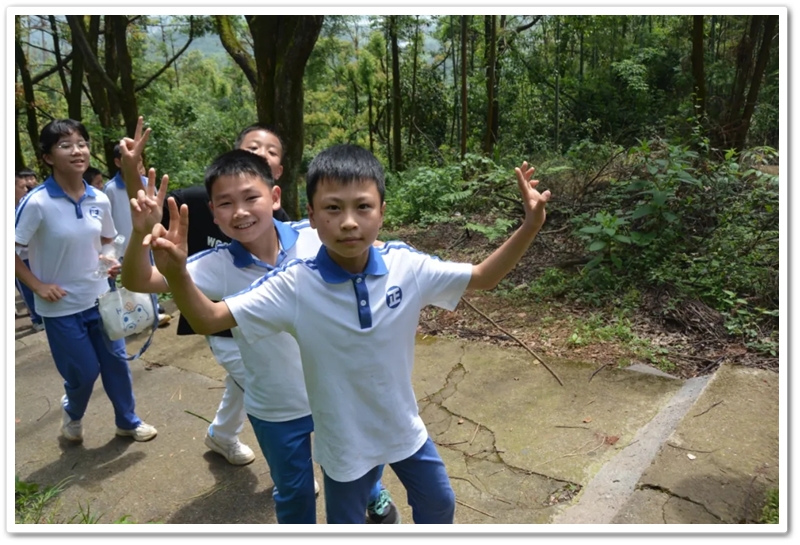 12点半,我们整队向鹿岐峰进发。不一会儿,就来到了山门牌楼,在这里,各班拍了一张集体大合照。沿着蜿蜒的小道,我们拾级而上,山中绿树成荫,鸟叫虫鸣,好不清凉!同学们走得更欢了,不到1点,六年级的先头部队就已抵达大雄宝殿。这时,我们还迎来了一群可爱的小朋友——幼儿部的萌娃,他们的加入,给我们这场远足又增添了不少童趣。同学们自由参观,感受庙宇的威严,惊叹古典建筑的大气。之后,罗主任组织所有学生在大雄宝殿台阶上合影,唱《歌唱祖国》,跳《有你就幸福》的手势操。这歌声是对祖国大好河山的赞美,这舞蹈是对妈妈深情的告白。