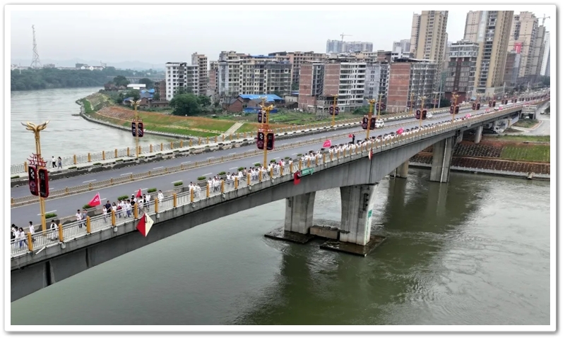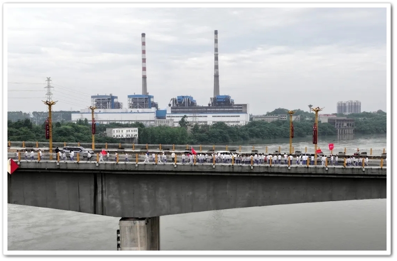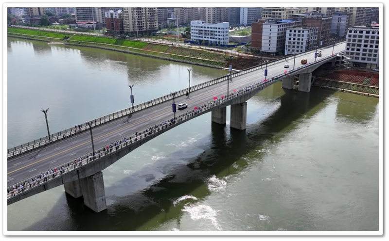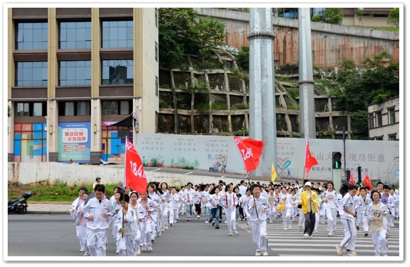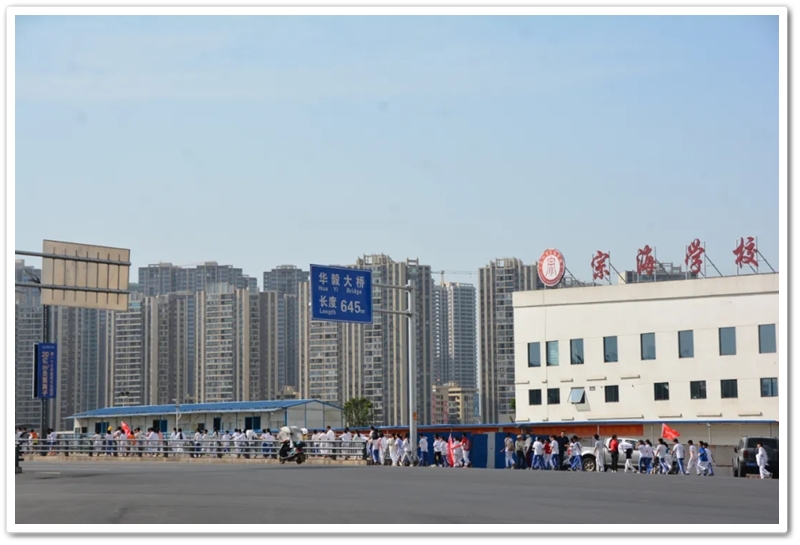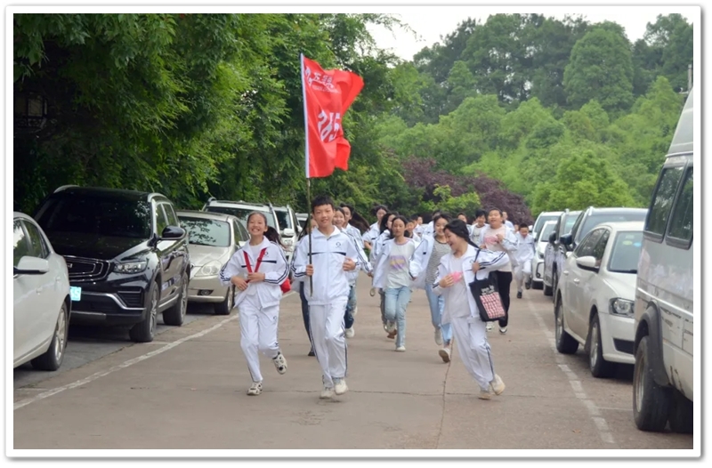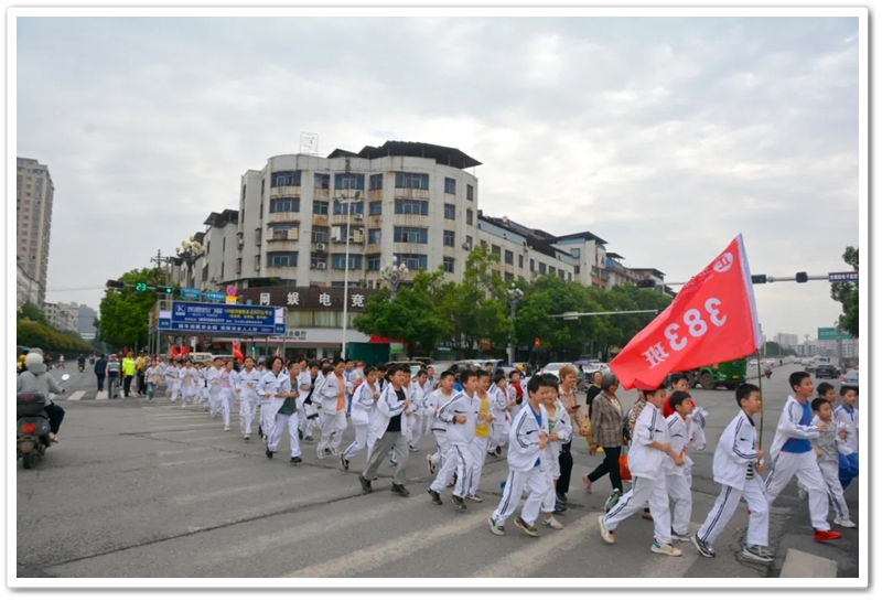 9点40分,我们上了鹿岐峰大桥,顿觉眼界开阔。宽宽的耒水河悠悠流淌,长长的鹿岐峰大桥雄伟壮观,西有疏阔的耒阳电厂塔楼高耸,东有城市之滨无限延伸。壮景生豪情!“七七,七七,自强不息;一往直前,勇攀高峰!”“七六七六,一枝独秀;功成名就,Let me go!”“381班,非同一般;猛虎下山,气壮河山!”各班喊着振奋的口号,踏着胜利的步伐,气干云霄;太阳下,红色的班旗迎风招展,鲜艳夺目!