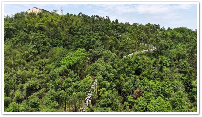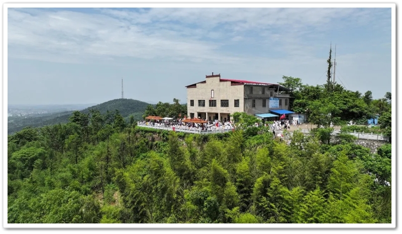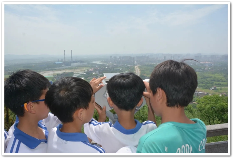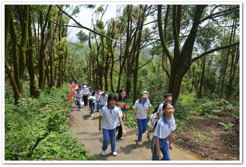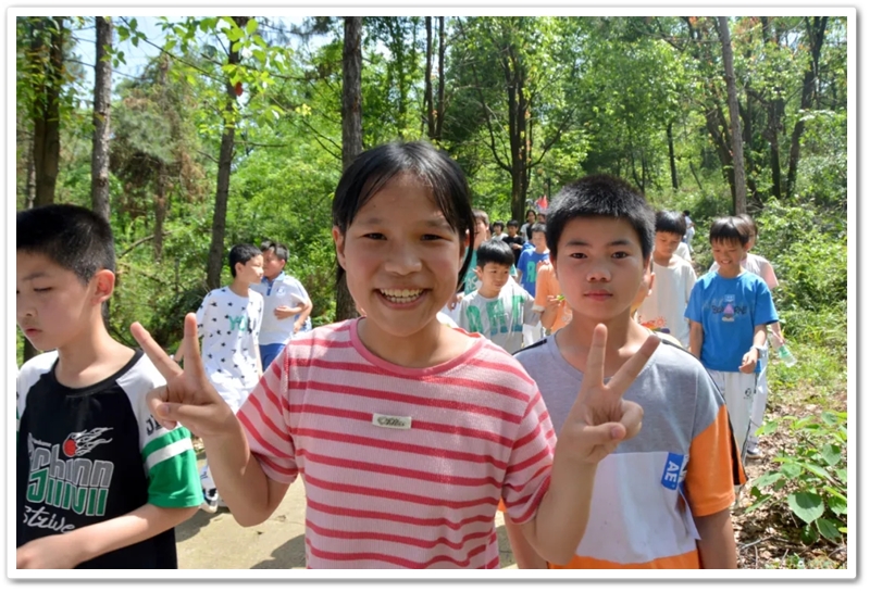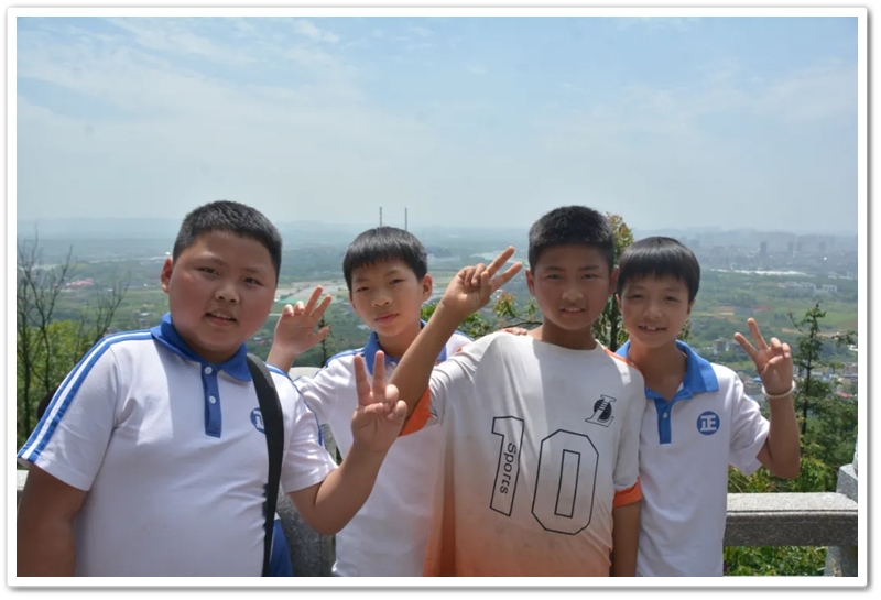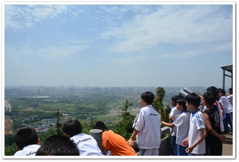 继续前行,2点钟,我们登上了鹿岐峰顶。站在山顶,整座耒阳城一览无余,同学们惊讶地感慨:原来我们耒阳城长这样子啊,像一条弯曲的带子!每个人都在凉亭里坐了一坐,吹吹山顶的凉风,东走走,西瞧瞧,指指点点,说道说道耒阳,谈论谈论家乡。