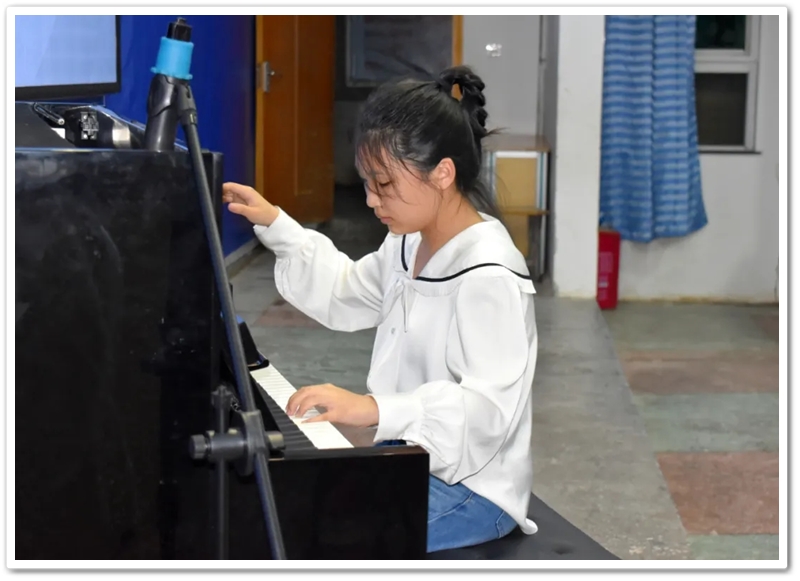 第八位选手是初一年级584班徐梦琪同学,她演奏的曲目是《悲怆奏鸣曲第三乐章》,这是一首轻快的回旋曲,快板,c小调,2/2拍子。优美的旋律中带有欠稳定的游移情绪,似乎处于一种徘徊不定的心态之中。一开头便是如雨珠倾泻而下的连奏,主部主题洋溢着青春的明快和不可抑制的生命活力。