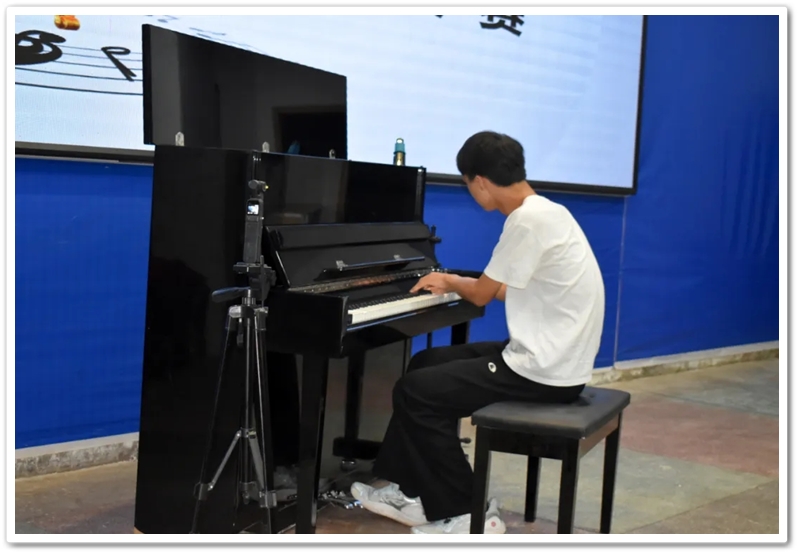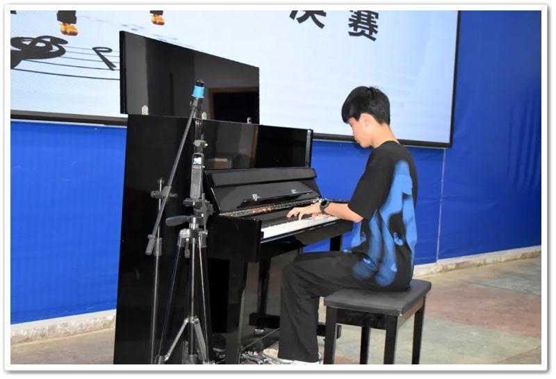 在主持人宣布完评分规则以及演奏要求后,迎来了本次决赛的第一名参赛选手,他是初一年级580班刘腾同学,他演奏的曲目铿锵有力,优美的旋律流畅,如同一种宣言式般的坚定气场表达了真正坚强的意志,让人领略到他的自信和潇洒。