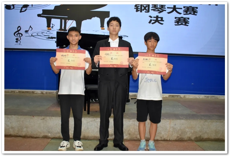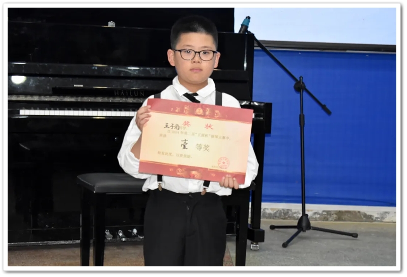 最后一位选手是高一年级316班蒋昊轩同学,他演奏的曲目是《悲怆奏鸣曲第一乐章》,庄严的慢板转辉煌的快板,c小调,奏鸣曲式。引子好像是沉重的压力伴随着痛苦的叹息,这是乐曲内容的重心,用4/4拍。主部是2/2拍,开始时是用断奏而上升的第一主题,表现出汹涌起伏、不可遏止的热情。蒋同学以扎实的基础卫冕本次比赛的冠军,毫无悬念拿下本次比赛高中组一等奖,并收获全场的热烈掌声。