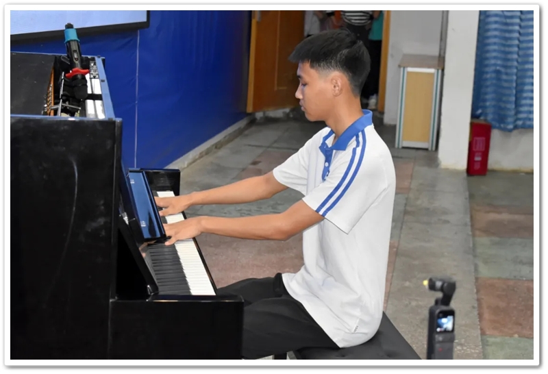 第二位选手是初二年级533班王隆辉,他演奏的曲目是《Call of silence》,沉默的呼唤,是《进击的巨人》动画插曲,王同学通过这首乐曲表达了他面对困难的决心,“勇敢向前吧,去追寻你的梦想,你就是那颗最闪亮的星”这种决心和勇气都统统在王同学的指尖体现。