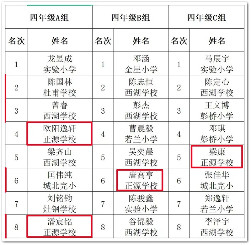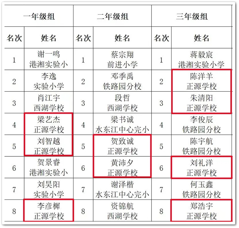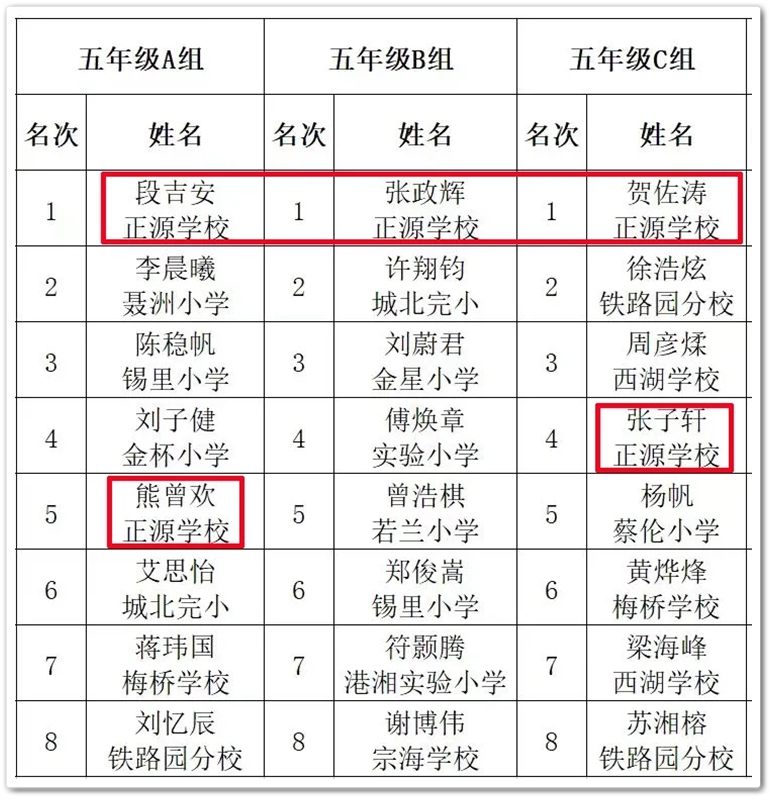 经过激烈的角逐,各组别的奖项随之产生。根据比赛成绩结果统计,正源学校25位同学参赛,24位同学获得了不同的奖项,团体总分排名第一!另外,特别值得一提的是五年级段吉安、张政辉、贺佐涛同学分别拿到了五年级A、B、C共三个组别的第一名,可见他们的象棋水平相当出色!