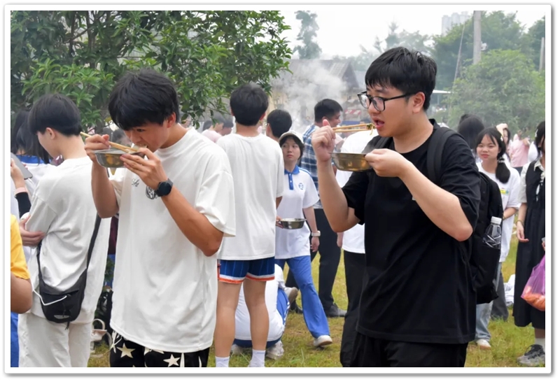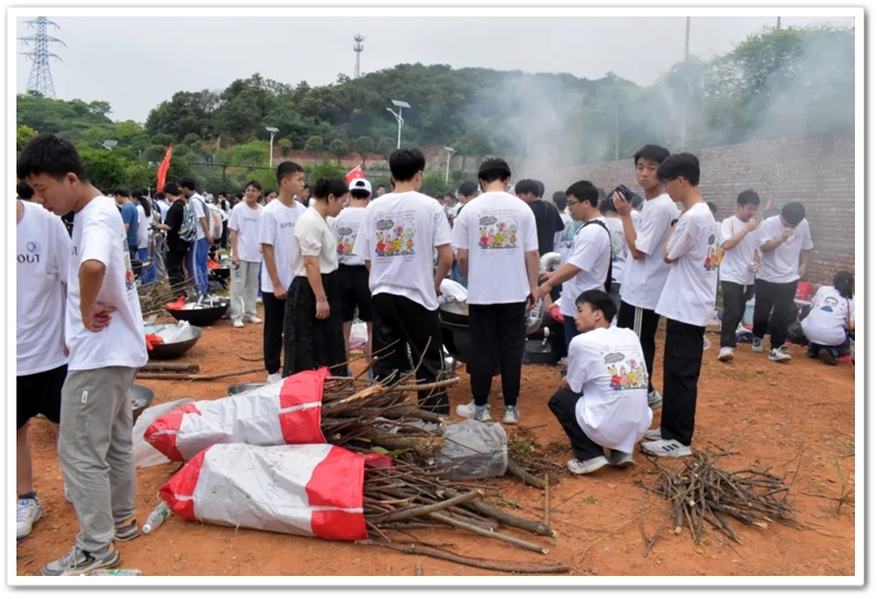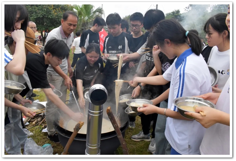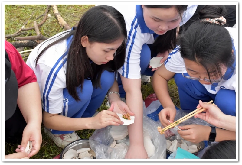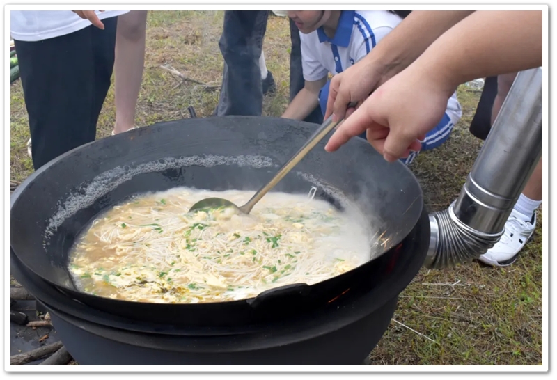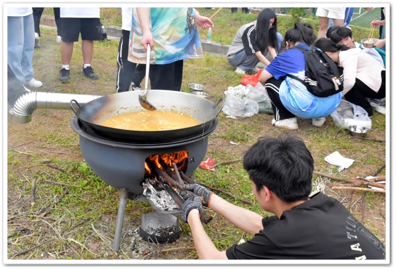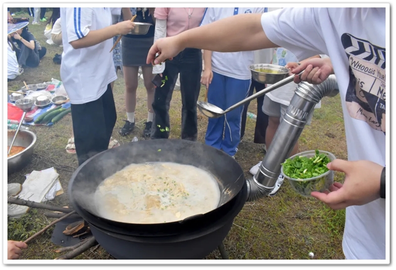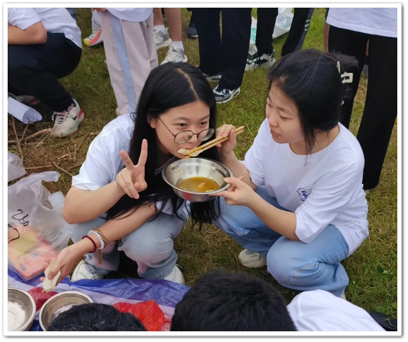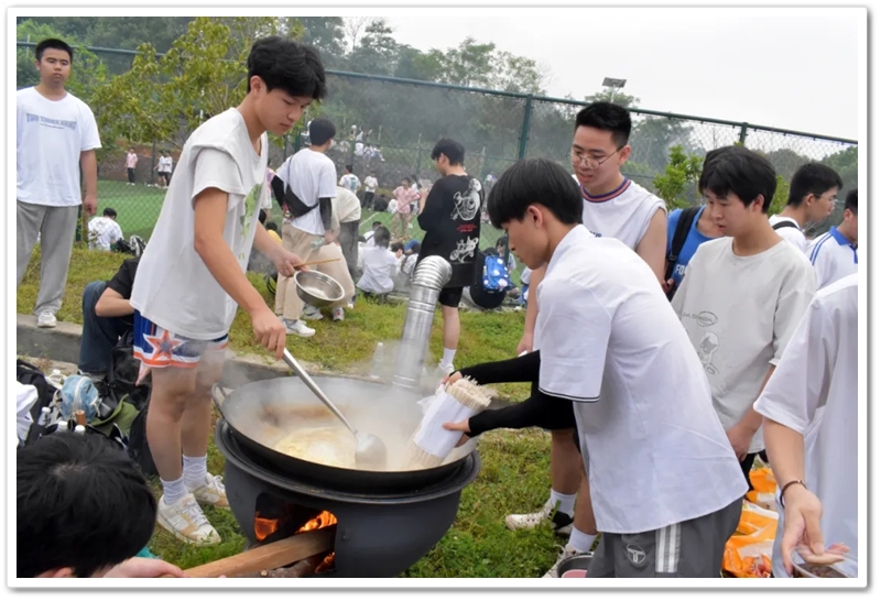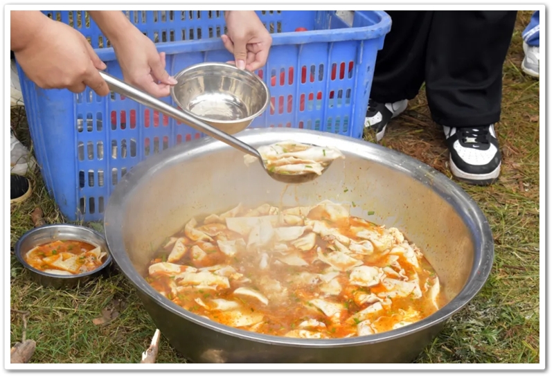 随后,大部队陆续抵达目的地——百果园,迎来了本次远足活动中学生们最为期待的项目——野炊。食堂的工人们已经在早早等候了,各种野炊所需已经一一摆好。各个班级欢欢喜喜领取各种食材和崭新的柴火灶后,找好场地,就开始了自己的厨艺展示。大家分工合作,配合默契,这边生火添柴,那边清洗厨具,下面条、包饺子、炒菜煮汤,学生们忙得不亦乐乎。老师们也不甘示弱,纷纷展现厨艺,为这场“郊外美食秀”锦上添花。