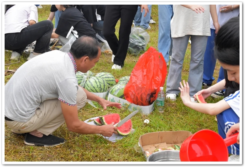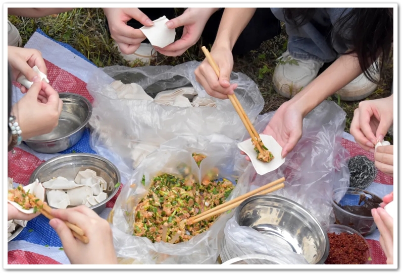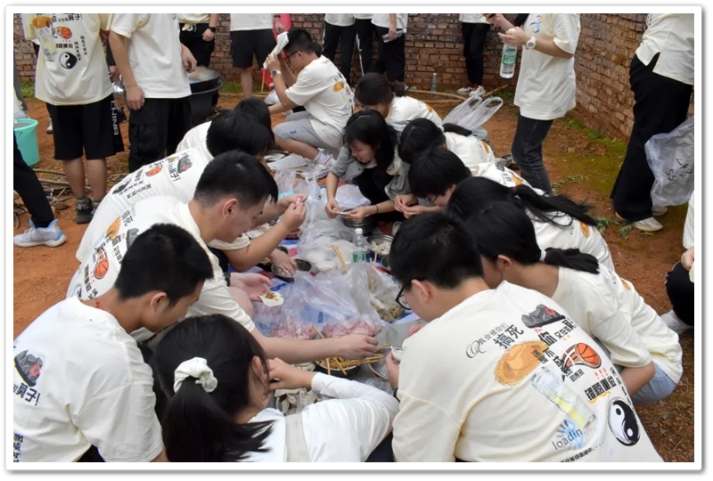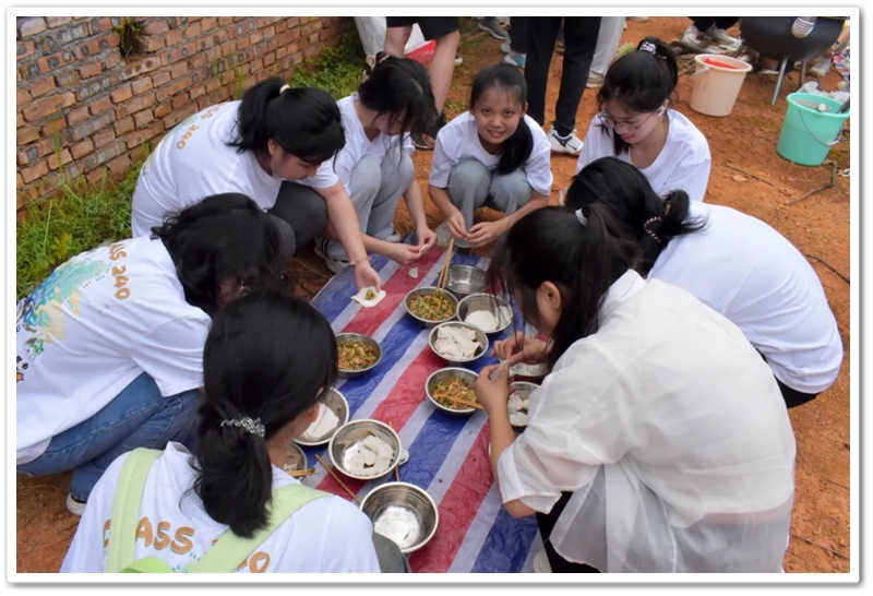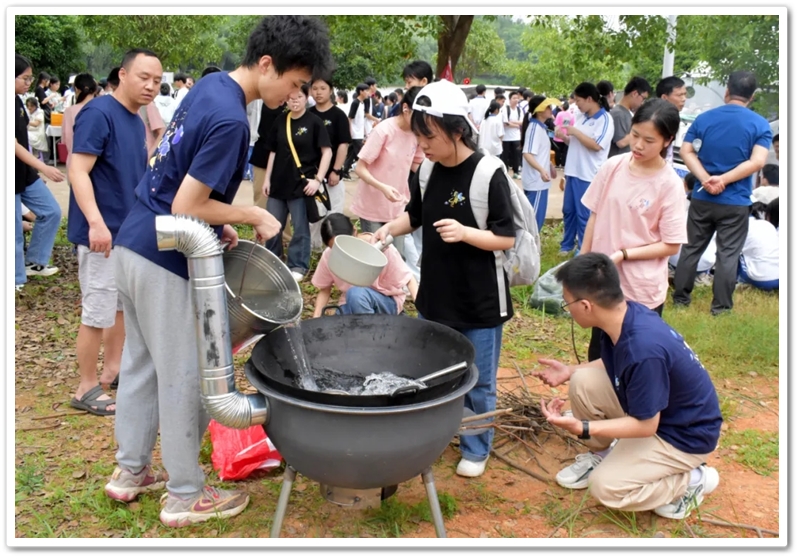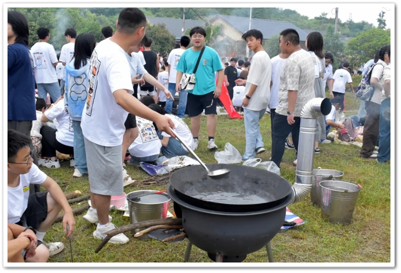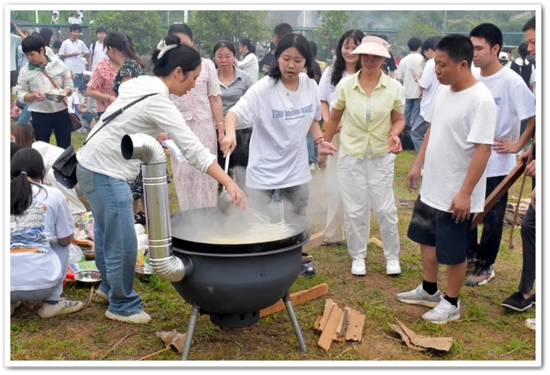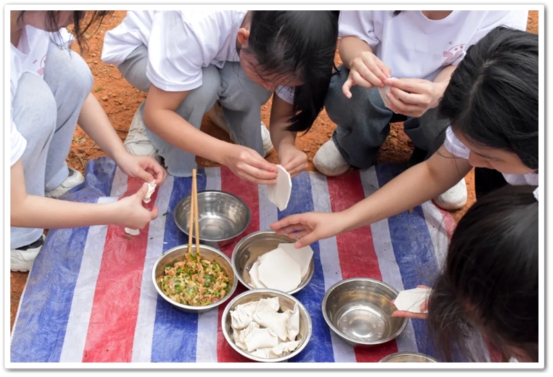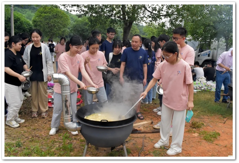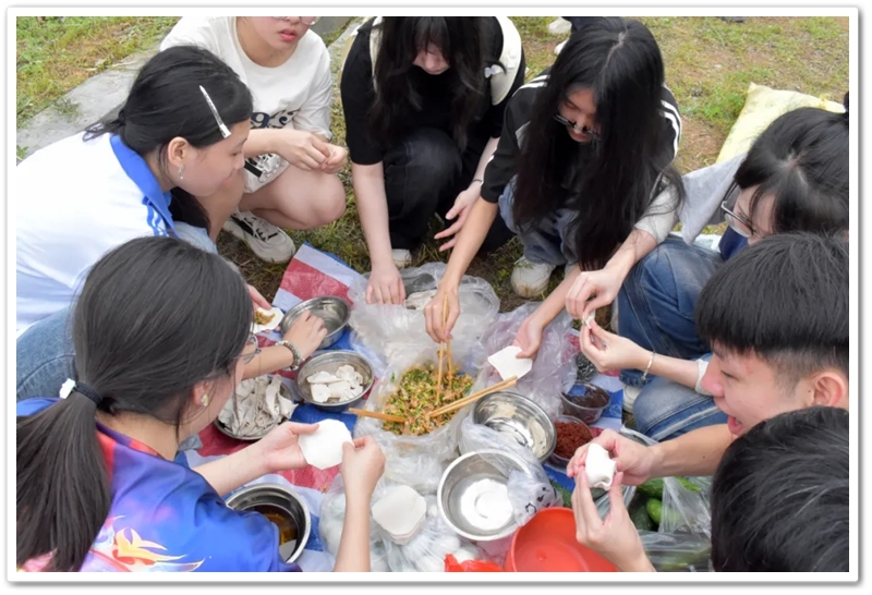 随后,大部队陆续抵达目的地——百果园,迎来了本次远足活动中学生们最为期待的项目——野炊。食堂的工人们已经在早早等候了,各种野炊所需已经一一摆好。各个班级欢欢喜喜领取各种食材和崭新的柴火灶后,找好场地,就开始了自己的厨艺展示。大家分工合作,配合默契,这边生火添柴,那边清洗厨具,下面条、包饺子、炒菜煮汤,学生们忙得不亦乐乎。老师们也不甘示弱,纷纷展现厨艺,为这场“郊外美食秀”锦上添花。