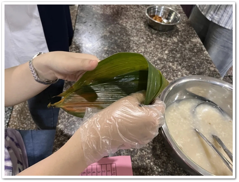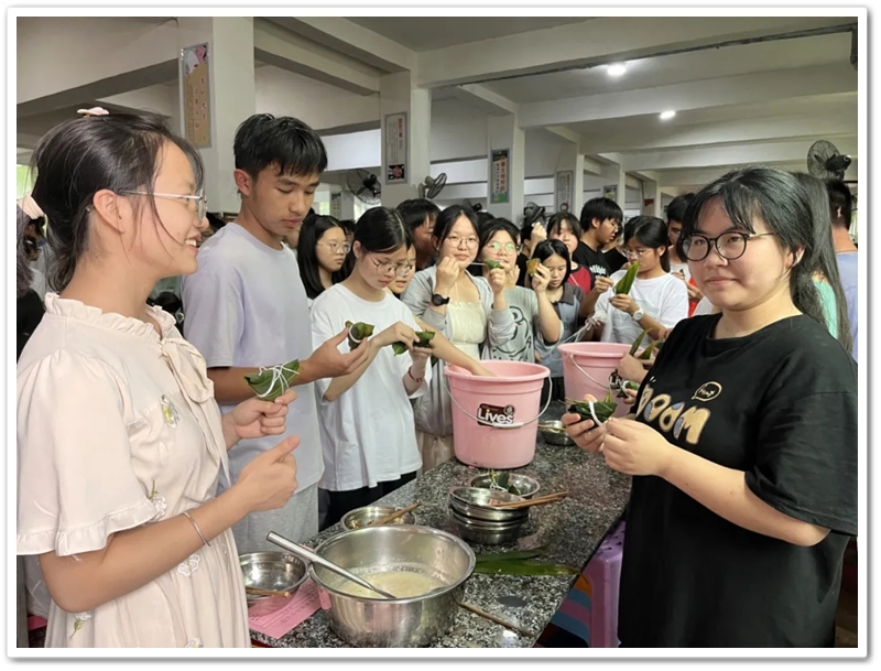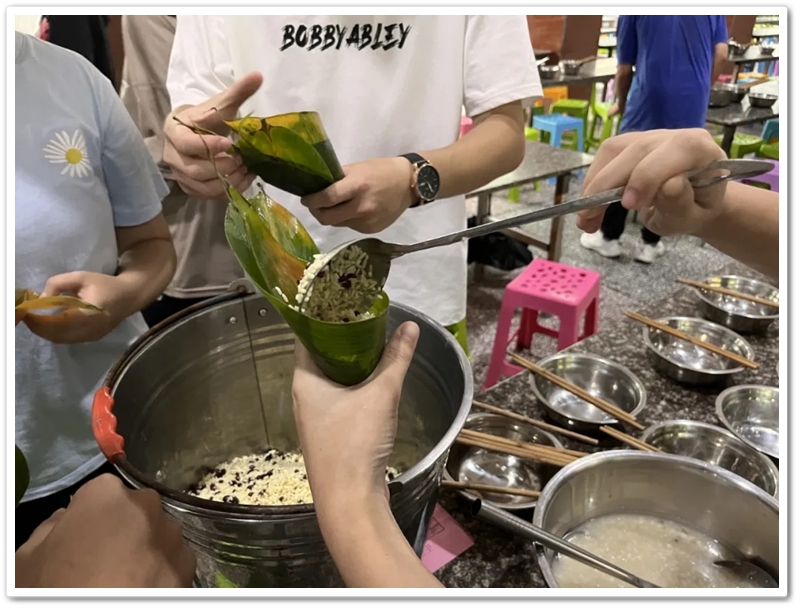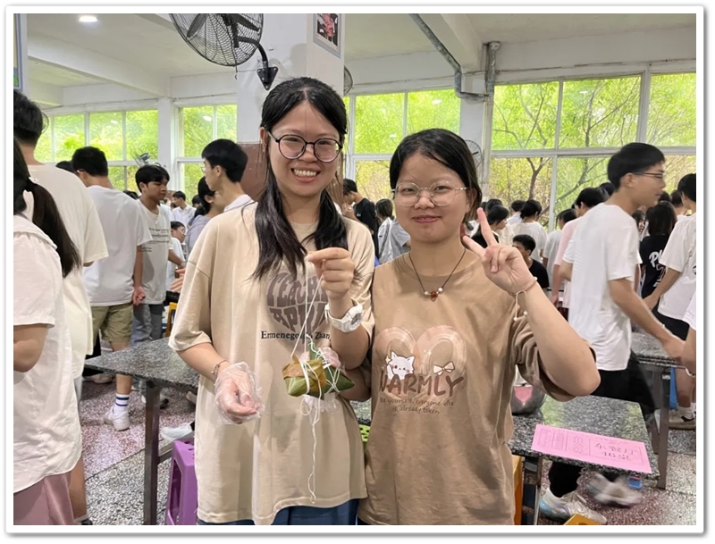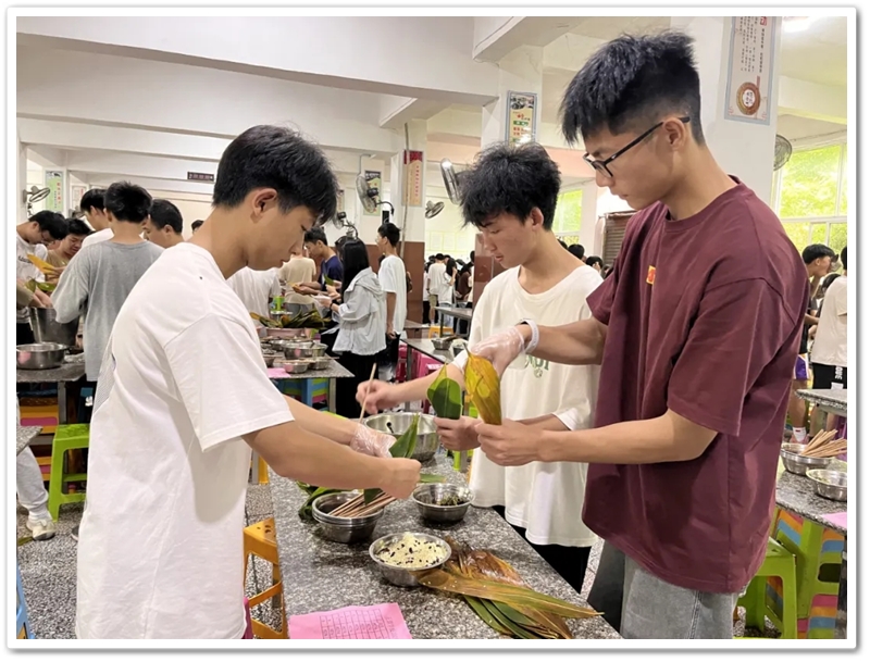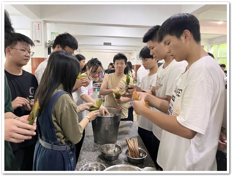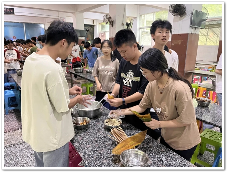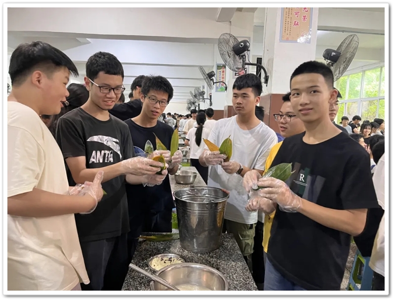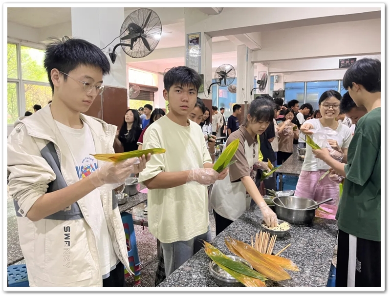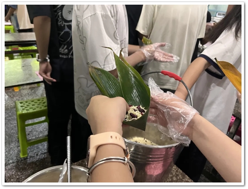 6月10日上午第四节课,四食堂里人声鼎沸热闹非凡。高三同学已经顺利离校,高二同学开始自娱自乐。人手几张粽叶,每桌一盆米豆,朝夕相伴的小伙伴们围成堆、团成团,坐的坐、站的站,有说有笑、兴致勃勃。“五色新丝缠角粽,叶里黄鹂时一弄。”抽一片蒲叶,叠一方角锥,握一把米豆,扯一根细绳,包一份甜蜜,闹一阵欢声笑语。
