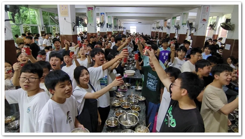 高二学子则在校陪伴高三同学,给他们加油助威,喊楼声威震青麓山。出征时,配合龙狮起舞,校门外是长长的送考队伍,加上警车开道,声势浩大,气势磅礴。