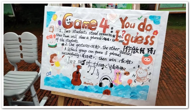 第四关You do ,I guess(你做我猜),两人为一组相对而立,其中一人根据老师出示的短语比划,考察动词短语。
