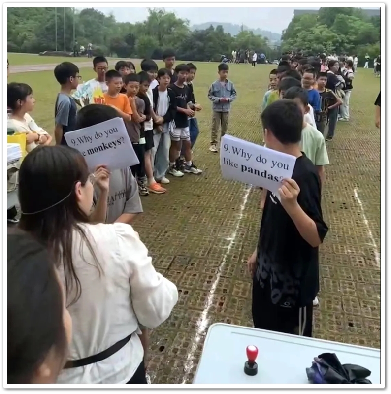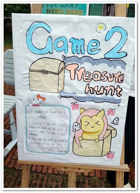 第二关Treasure hunt(寻宝),两人为一组,两组PK,根据老师的指令,以最快的速度找出正确的字母组合卡片且读准,考察名词。