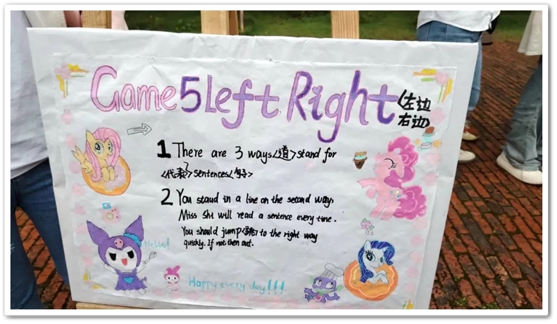 第五关left right(左边右边),同学排成一列站到2道上,老师每次会展示一个句子,听到句子后同学们要迅速跳到相应的道上,考察英语句子。