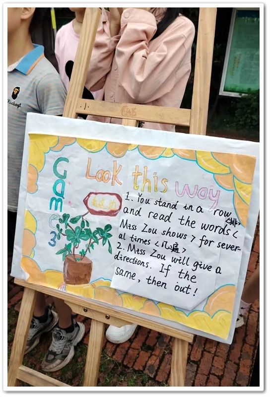 第三关Look this way (看这边),同学站成一排,老师展示一个单词,同学们齐读。老师指一个方向,同学们立刻把头转向其他不同的任一方向,考察形容词、副词。