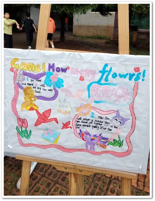 活动共设置了五个游戏,每个游戏都充满了趣味性和闯关的挑战性。第一关How many flowers(花开几朵),若干同学围成一个圈,边说“How many flowers?"边走起来,老师说一个数字,同学们听到数字赶紧抱团,考察数词。