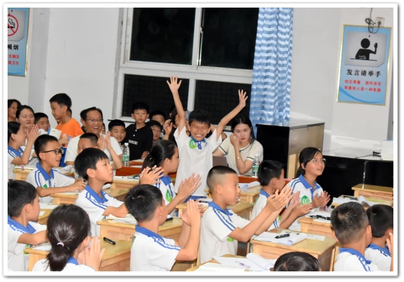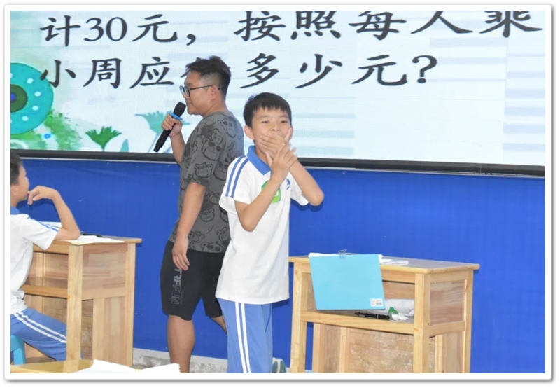 第一轮结束后,为了缓解比赛的紧张情绪,全场同学跟着音乐跳起了《小数点移动规律操》,“左跳跳、右跳跳,抖抖手、扭扭屁股......”比赛现场瞬间变为一片欢乐的海洋。