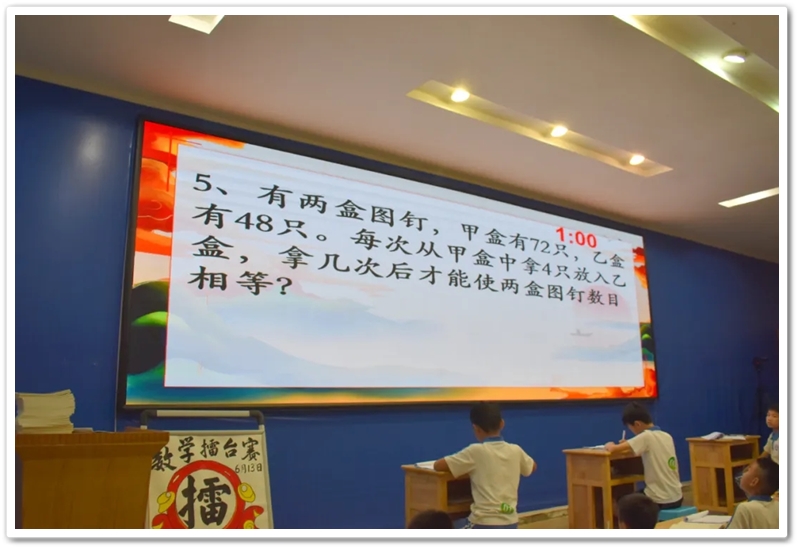 为了成功举办此次数学擂台赛,从出题到筛选学生,从道具准备到比赛场地的布置,四年级数学组的老师分工明确,通力合作,精心准备。通过6月5日年级数学智力赛的选拔,最终有45名数学思维活跃、数学成绩拔尖的同学站上了此次数学擂台赛的舞台。